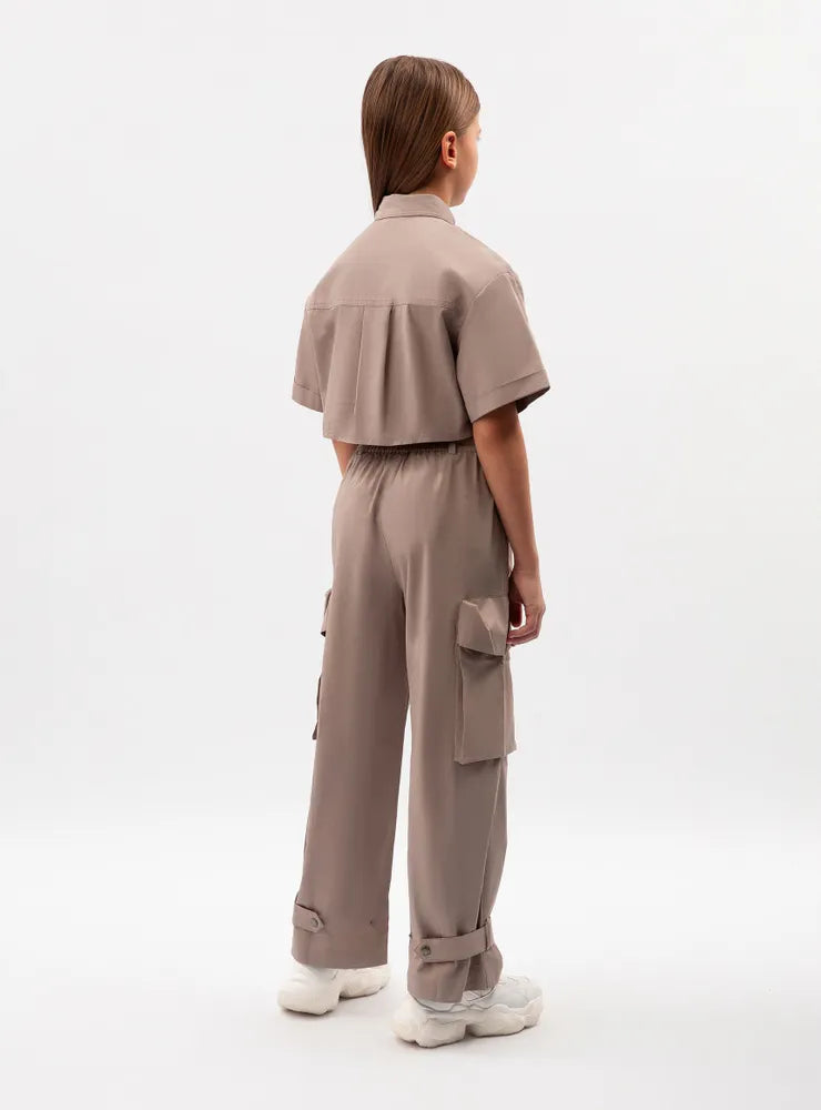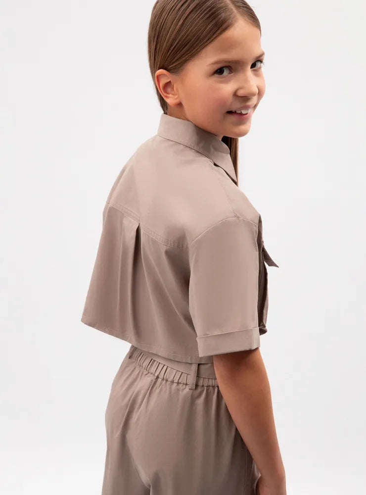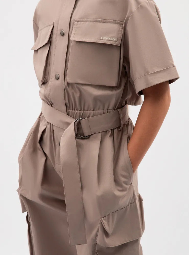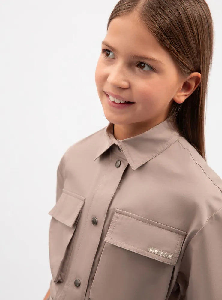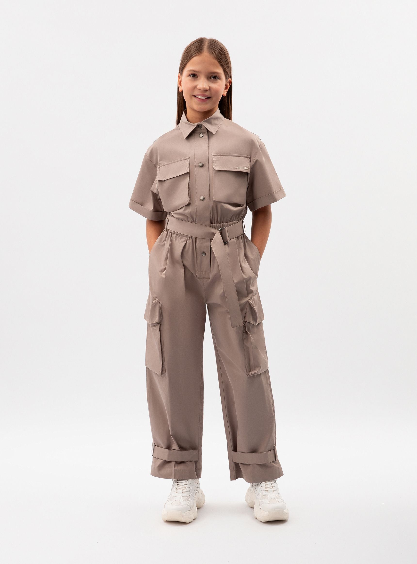 جمبسوت قطني ساتان بأكمام قصيرة قطعة عصرية في خزانة ملابس الفتاة، تضفي لمسة من روح المغامرة على إطلالتها. يُحاكي التصميم جماليات ملابس العمل، وهو اتجاه رائج في عالم الموضة العصرية، يُقدّره الشباب المبتكر، وعشاق أسلوب الحياة النشط، ومن يُقدّرون حرية التعبير عن الذات. تُضفي الجيوب الأمامية وجيوب الشحن لمسةً من الجاذبية على الجمبسوت، مما يجعله جريئًا ومثيرًا للاهتمام وعمليًا، ويناسب تمامًا أسلوب ملابس الشارع المريح والعفوي. يضيق البنطال الواسع بشكل ملحوظ عند الكاحلين، ويمكن تعديله باستخدام أشرطة كبس عند منطقة الكاحل. يُغلق الجمبسوت بأزرار كبس.