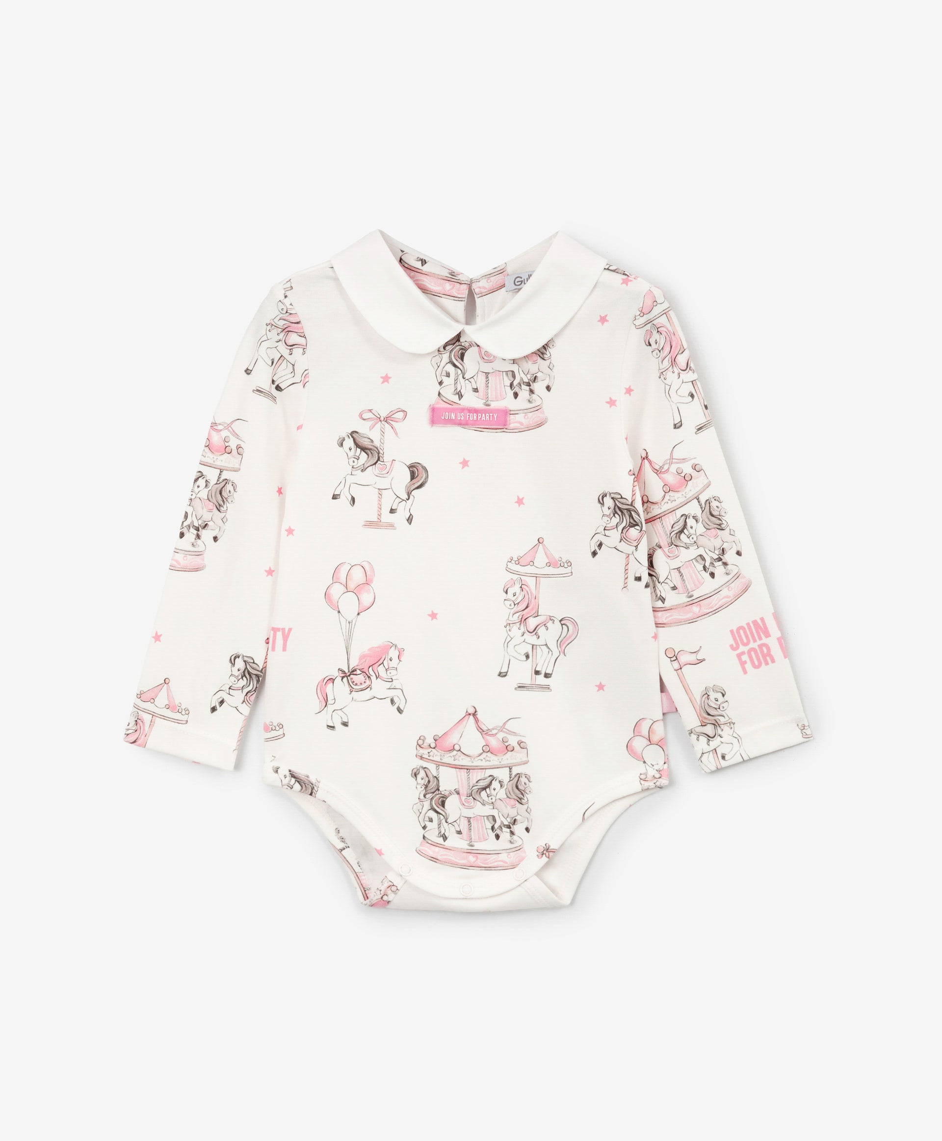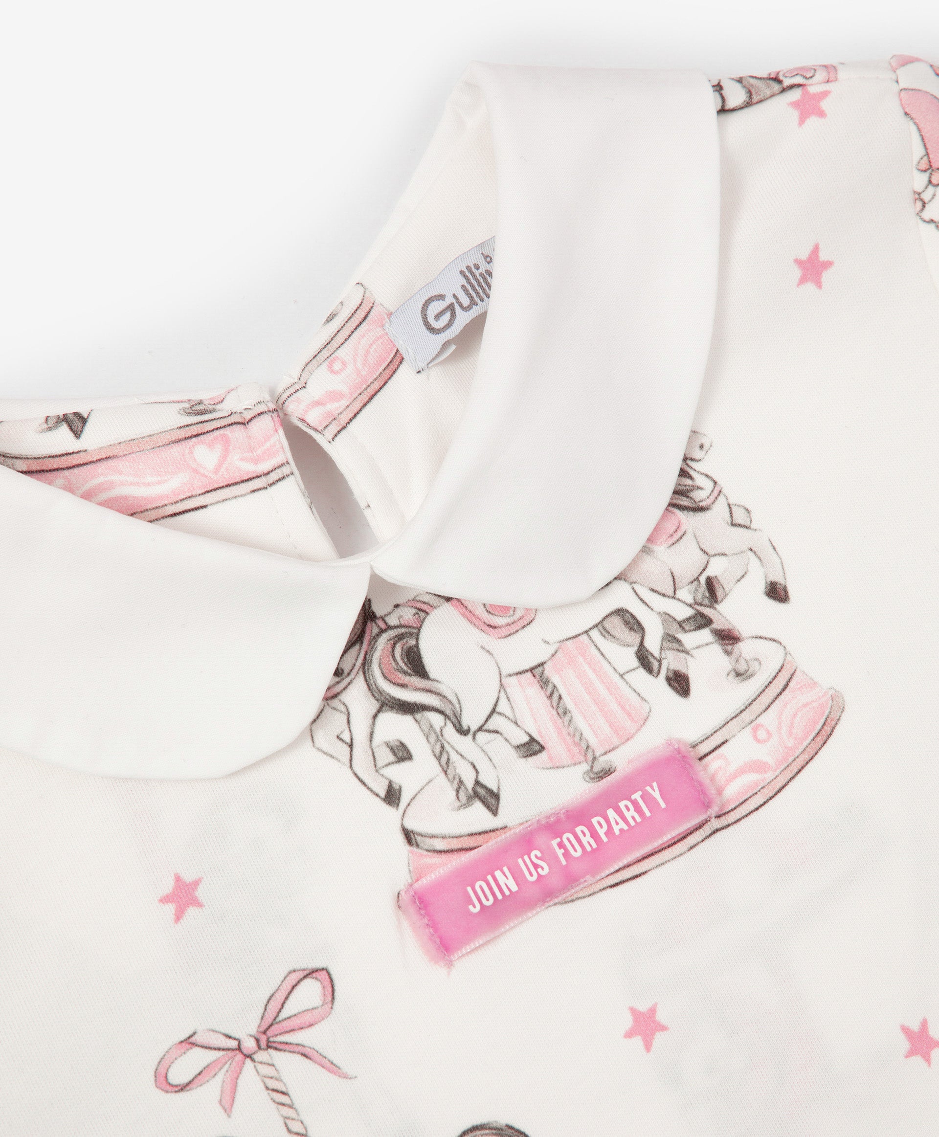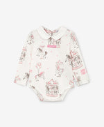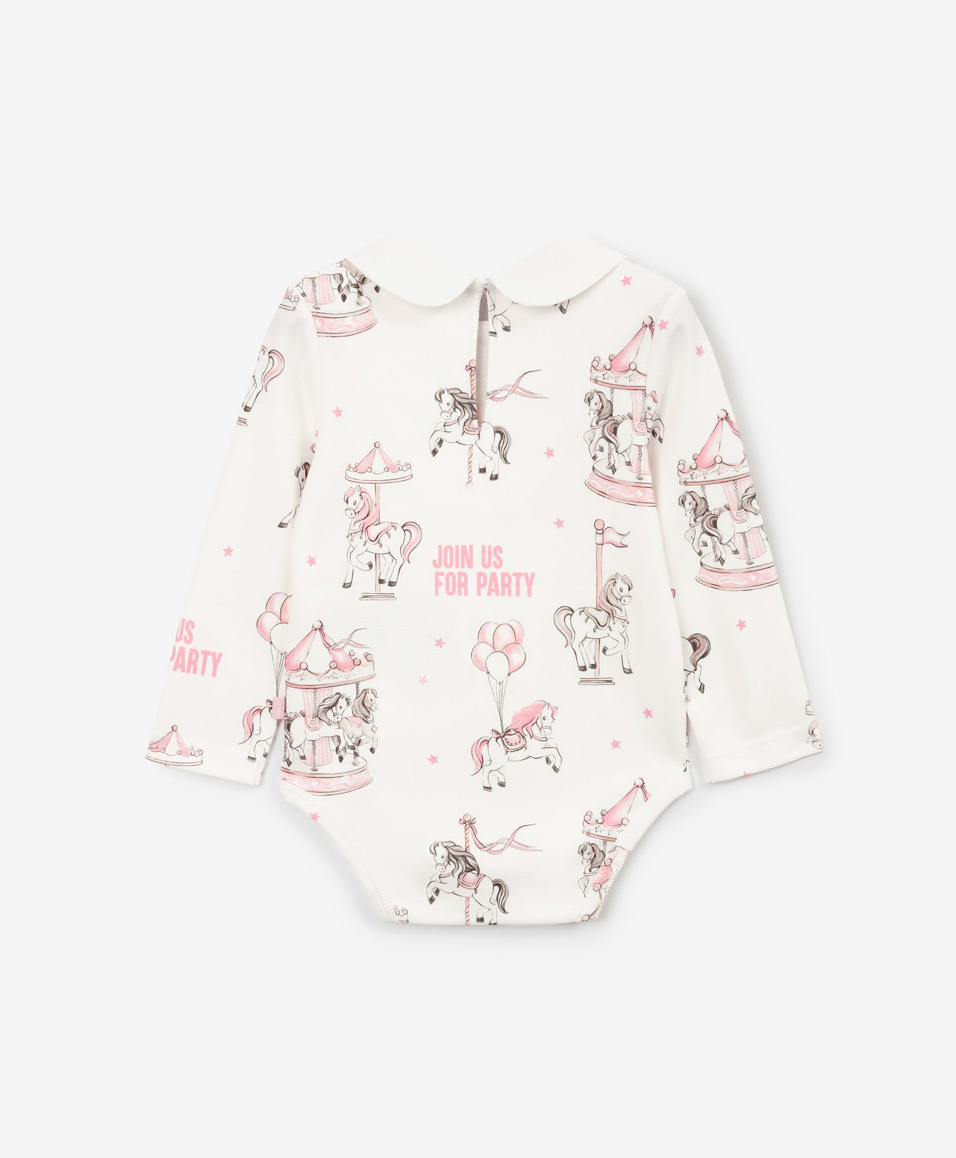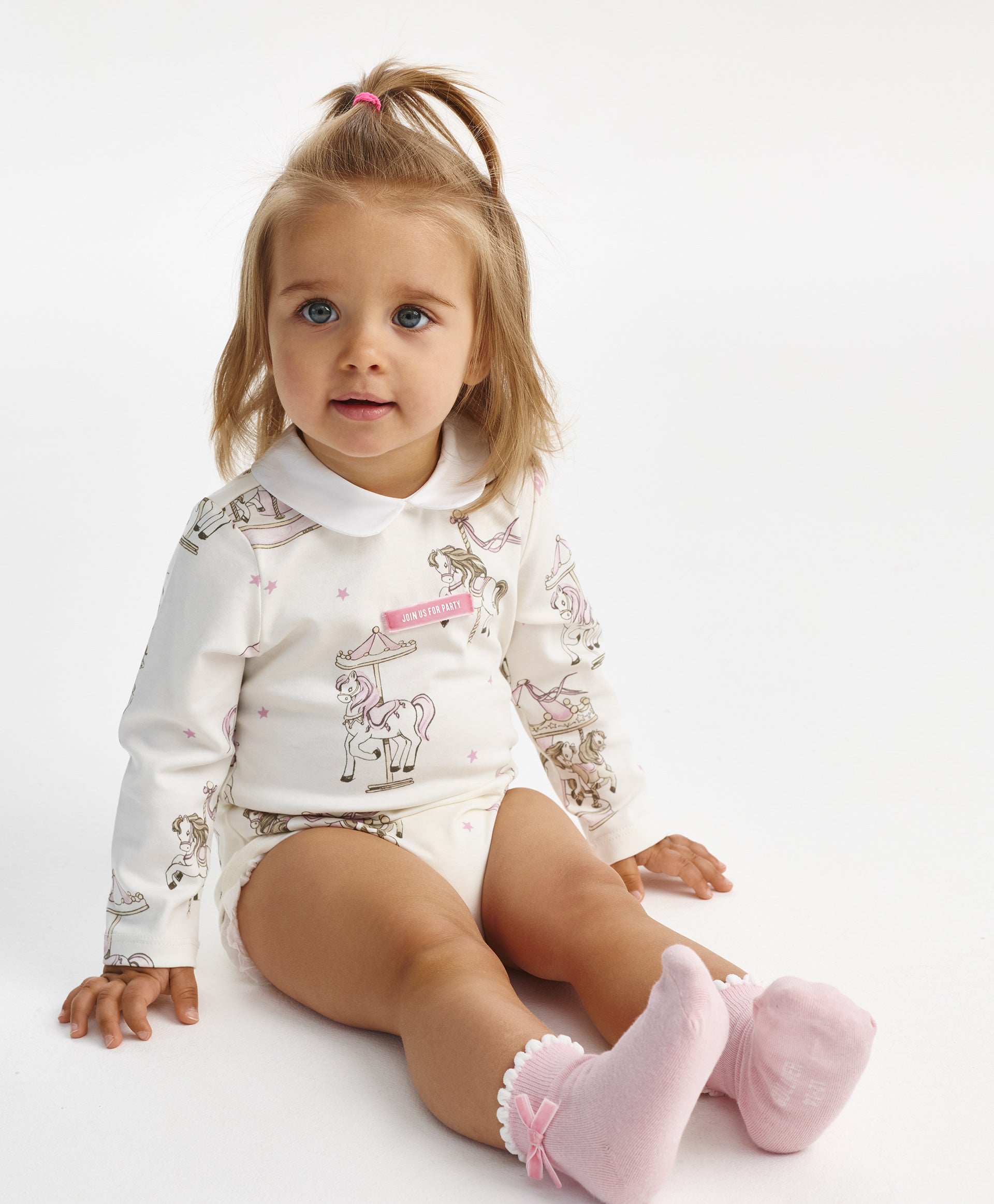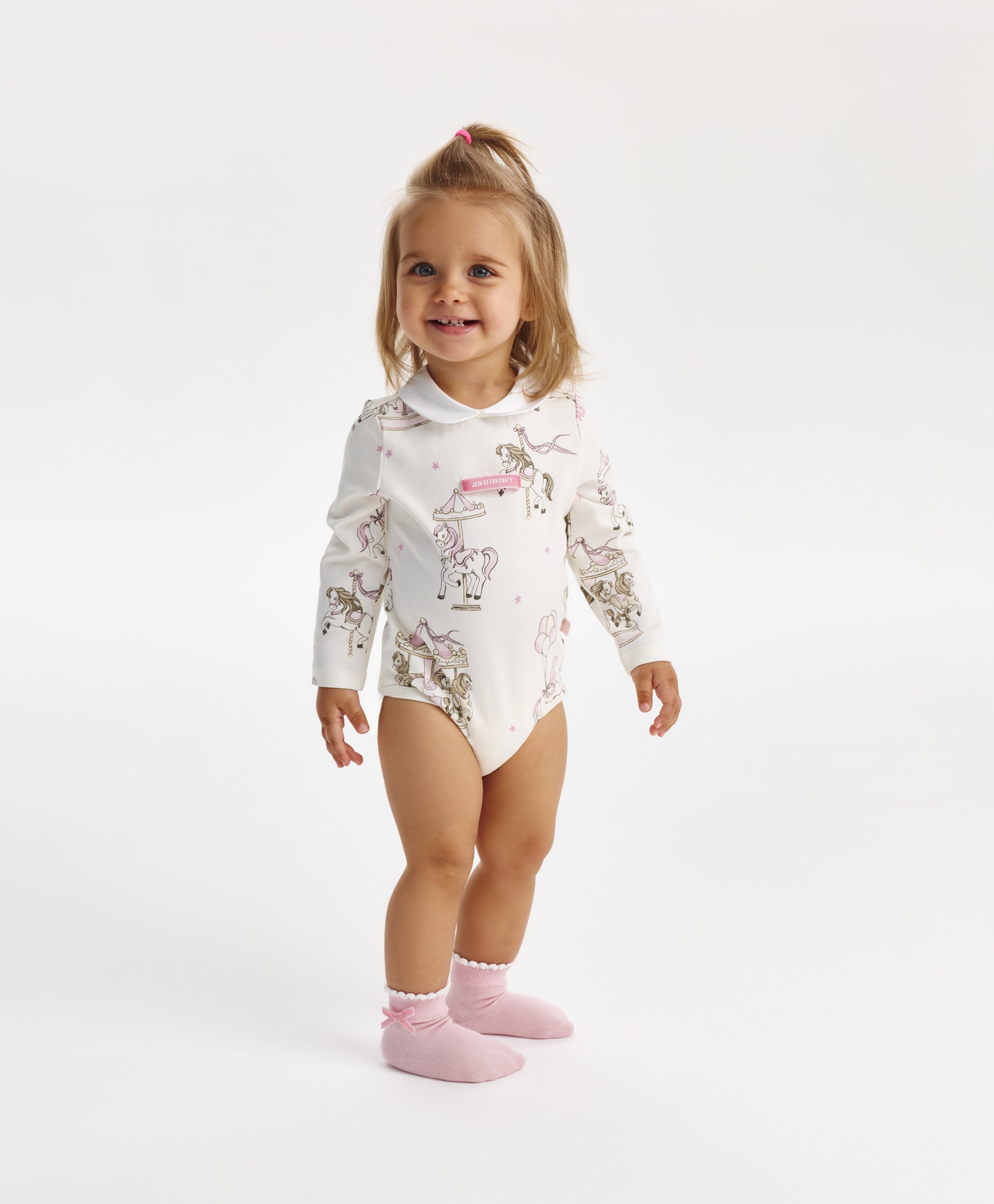 Soft and gentle milky-colored bodysuit designed for baby girls. Made from premium cotton, it keeps delicate skin comfortable and cozy all day. The convenient snap buttons at the bottom make diaper changes quick and easy. Perfect for layering or wearing on its own, this bodysuit combines comfort, practicality, and style for everyday wear.