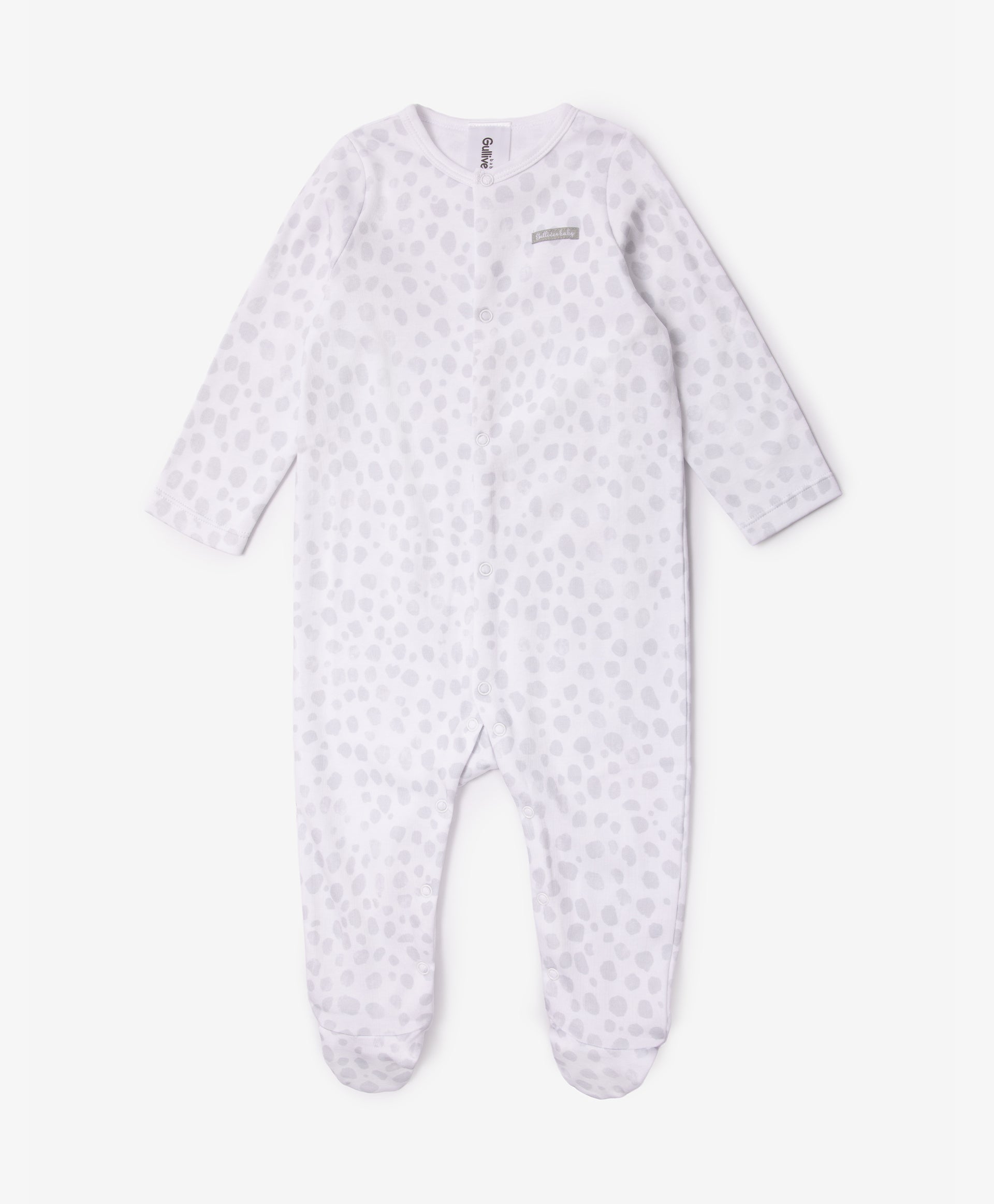 Soft unisex sleepsuit set from Gulliver made of 100% natural cotton. The pack includes three cozy grey sleepsuits with delicate prints. The convenient snap-button fastening makes dressing and changing easy, while the enclosed feet keep the baby warm. Gentle fabric ensures comfort and care for sensitive skin. Ideal for sleeping, playing, or gifting. Suitable for newborns and infants, perfect for all seasons.