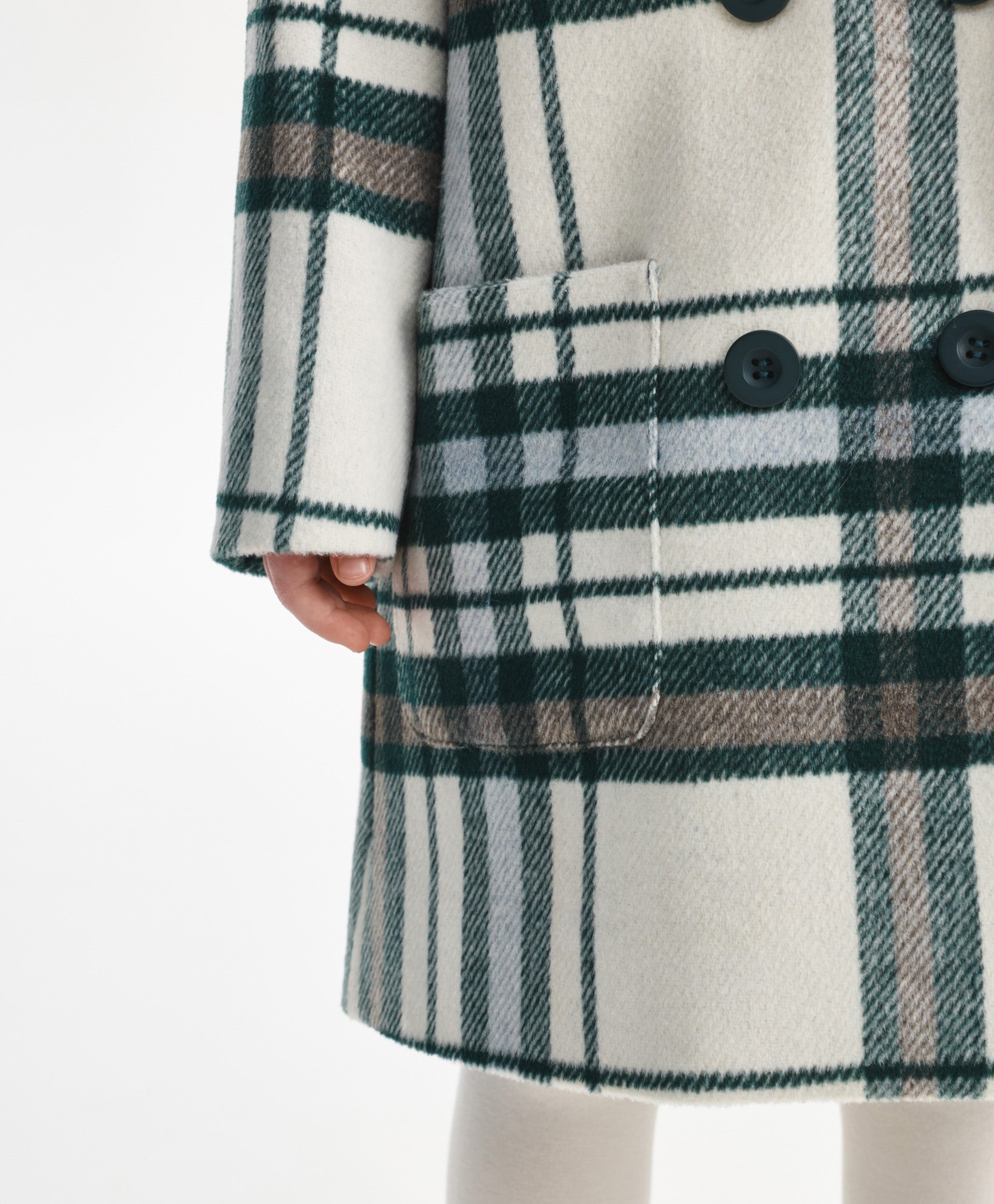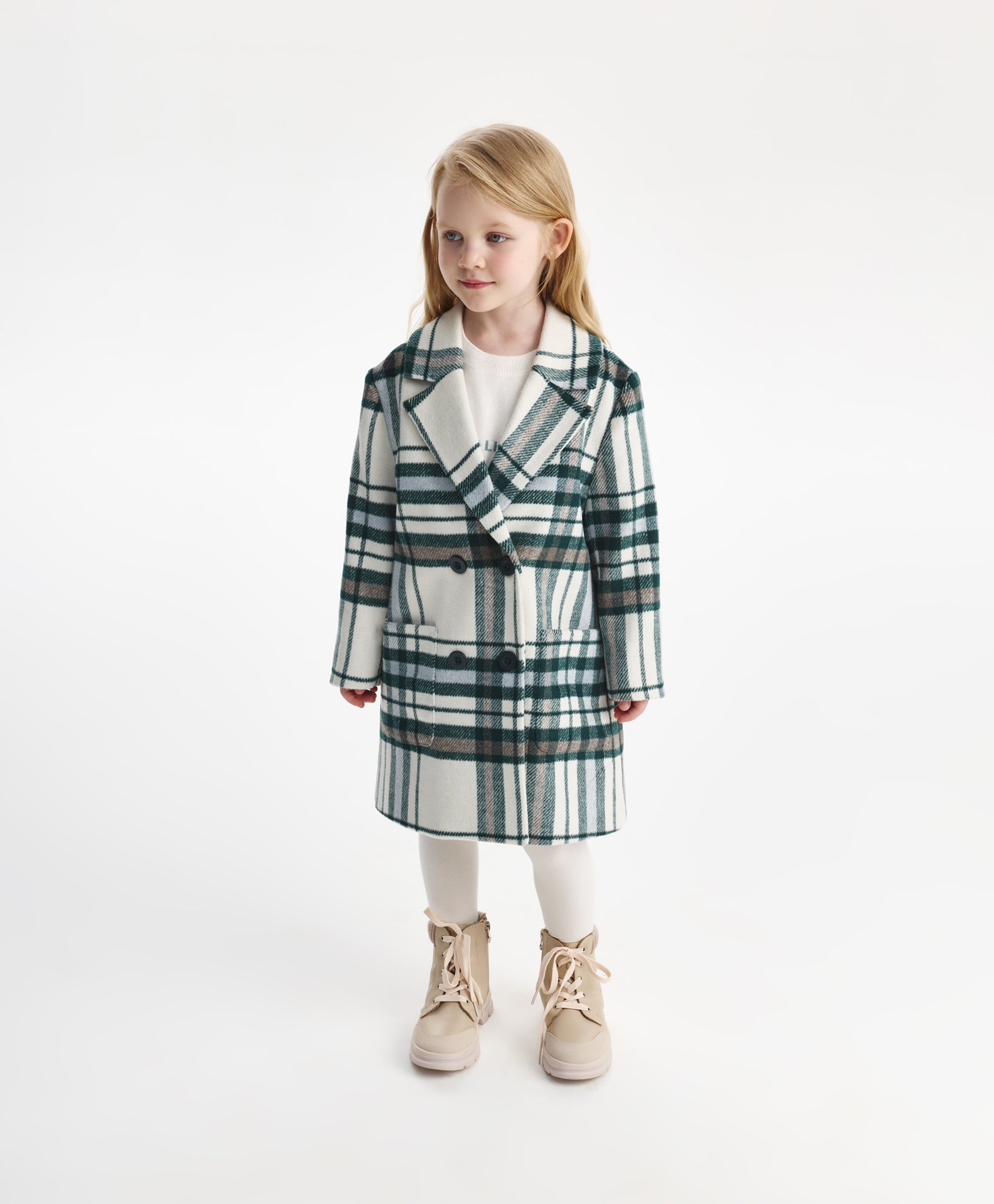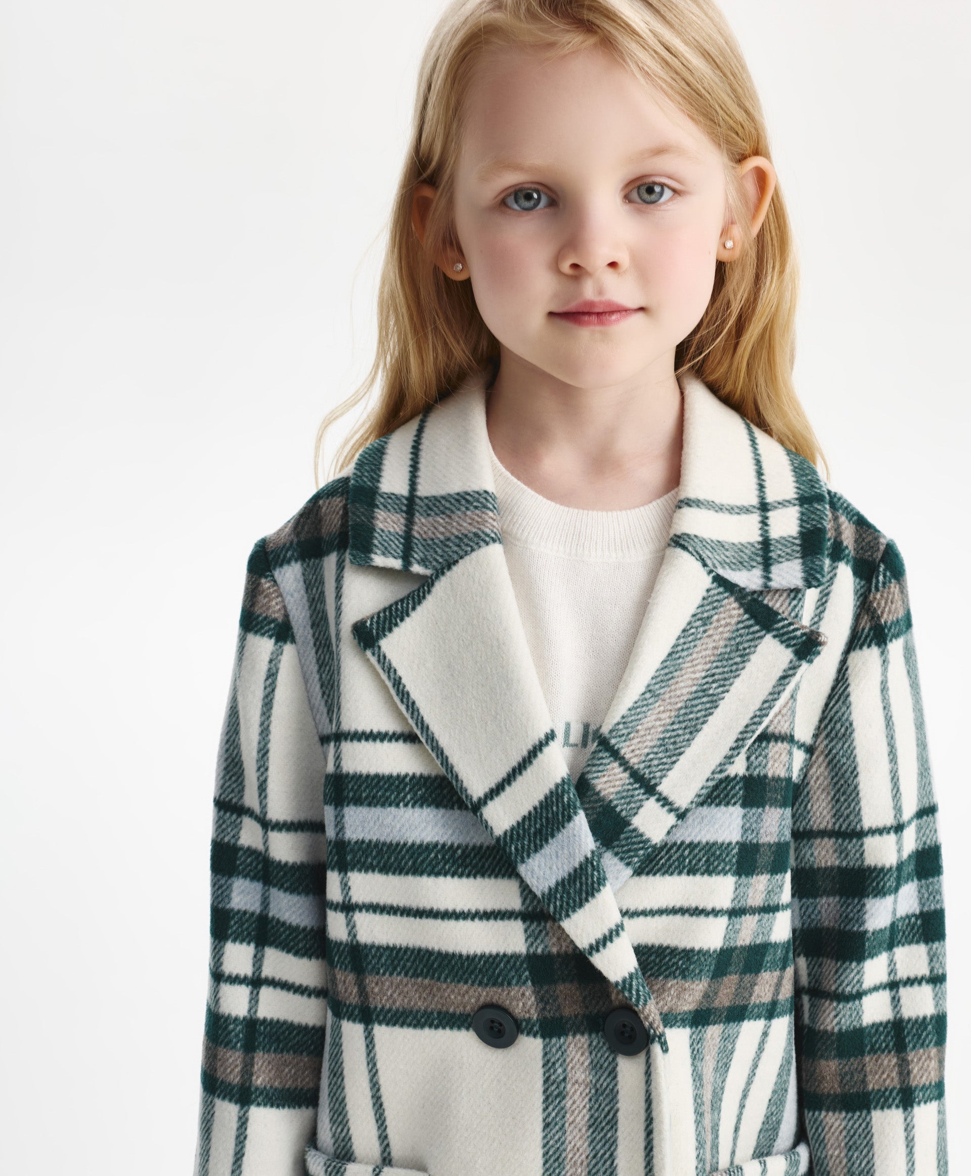 This classic double-breasted coat in a sea-blue tartan pattern is the epitome of elegance for girls in the mid-season. Made from warm, soft coat fabric with a high wool content and lined with smooth silk-like material, it offers comfort and style. The straight, loose fit, English collar, back vent, and two front patch pockets ensure freedom of movement and practicality. Perfect for transitional weather, it combines timeless tradition with modern trends.