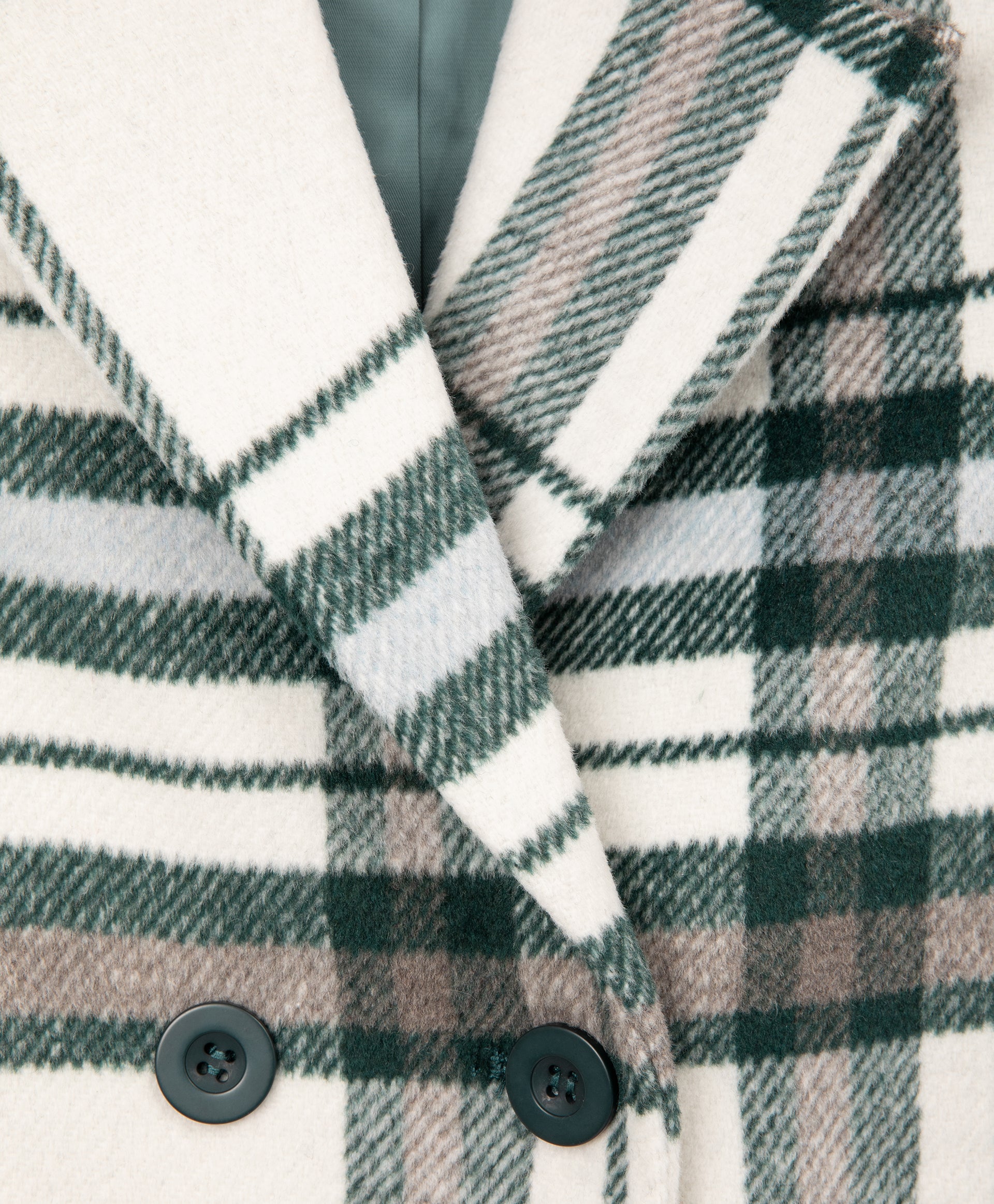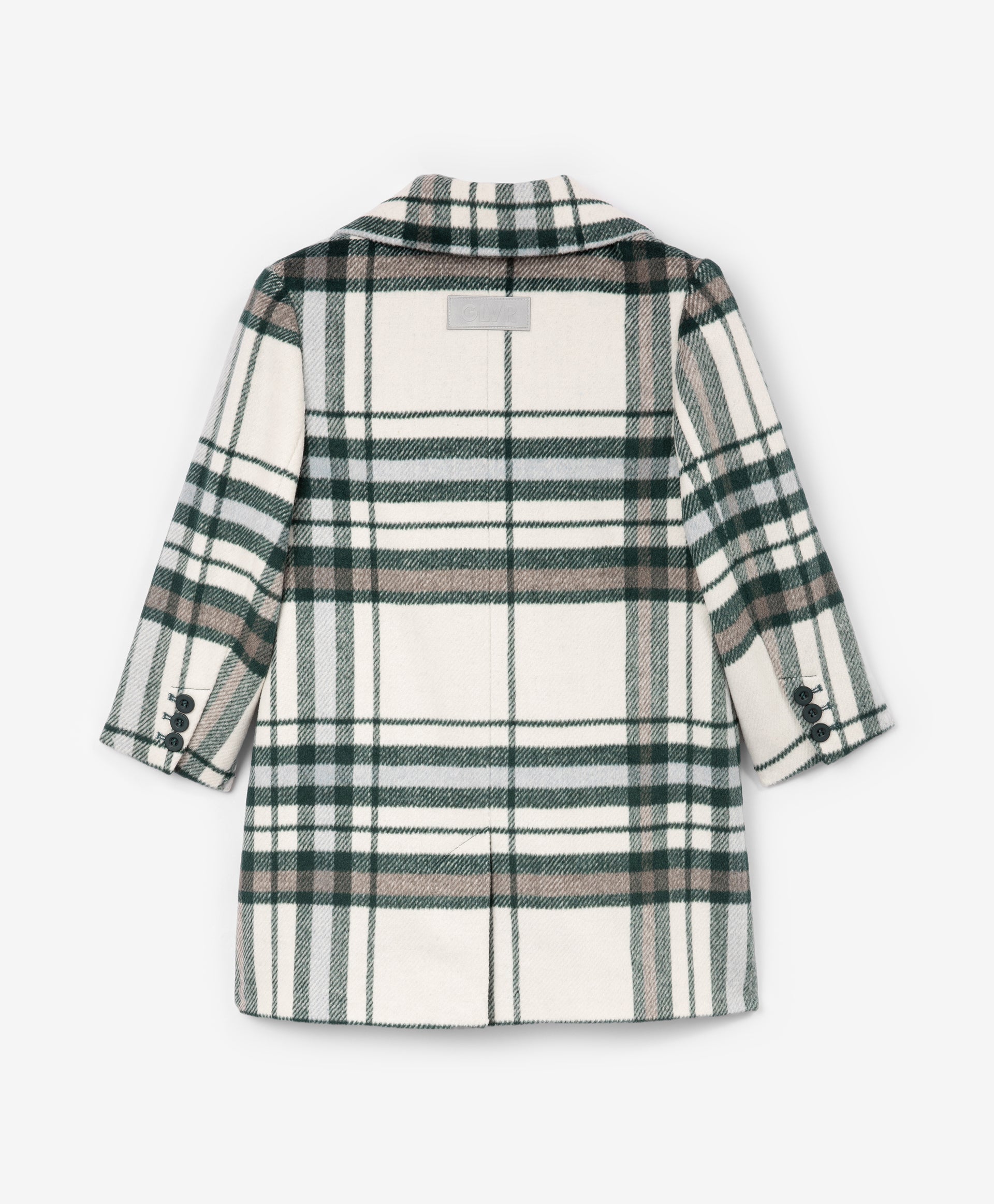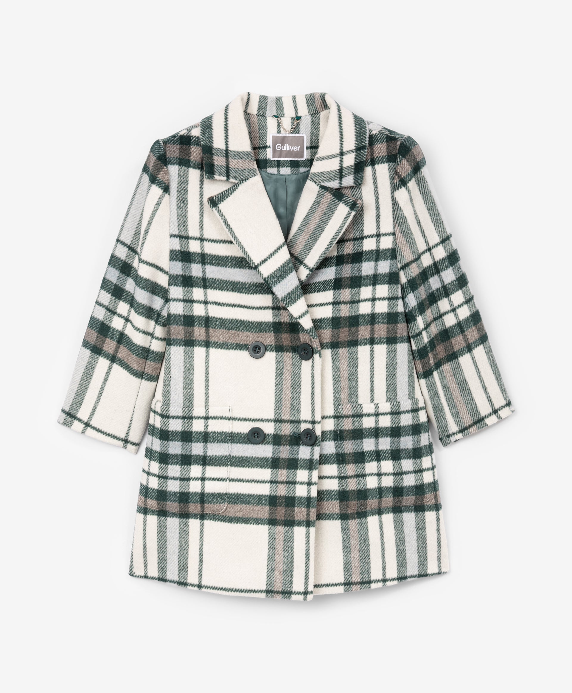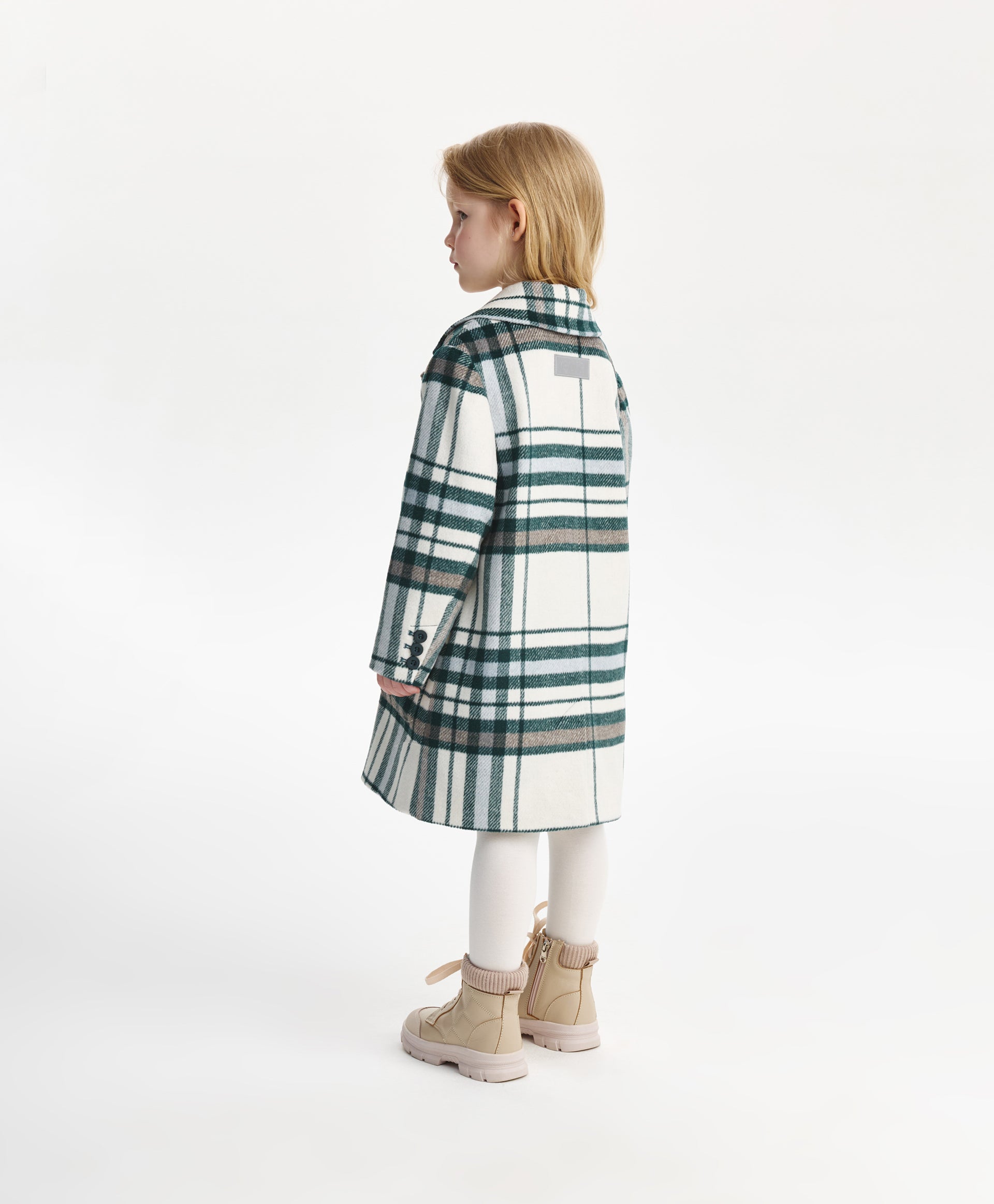 This classic double-breasted coat in a sea-blue tartan pattern is the epitome of elegance for girls in the mid-season. Made from warm, soft coat fabric with a high wool content and lined with smooth silk-like material, it offers comfort and style. The straight, loose fit, English collar, back vent, and two front patch pockets ensure freedom of movement and practicality. Perfect for transitional weather, it combines timeless tradition with modern trends.
