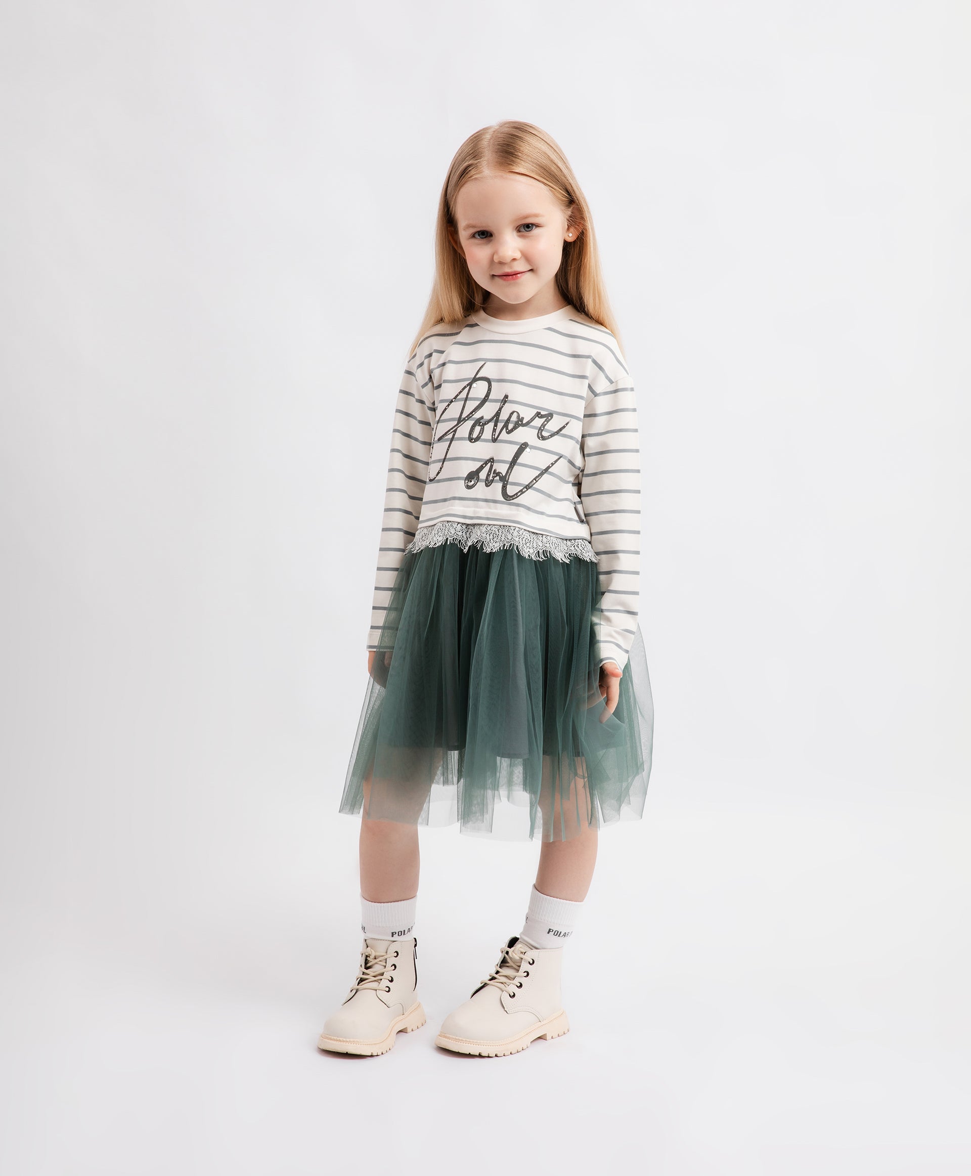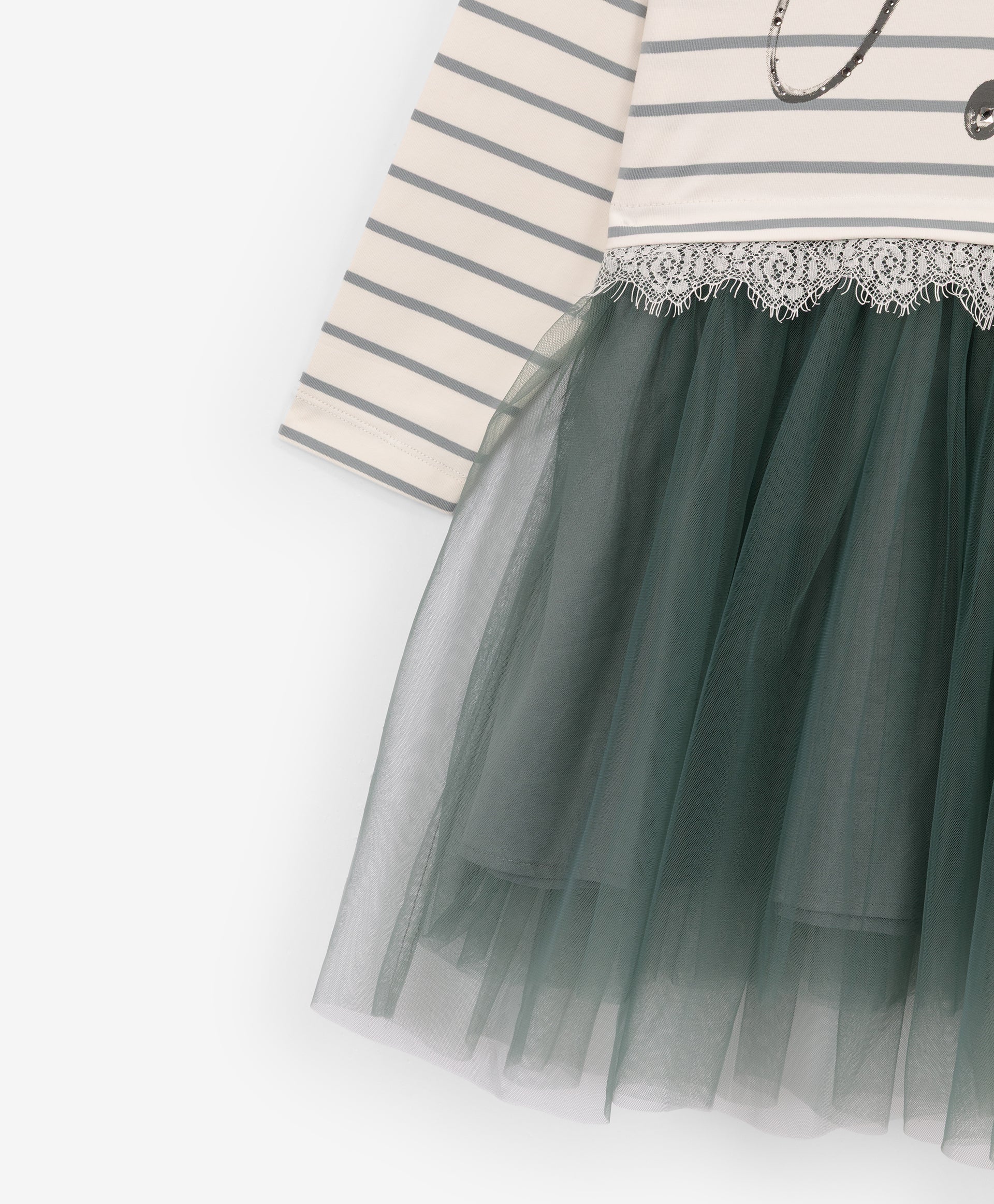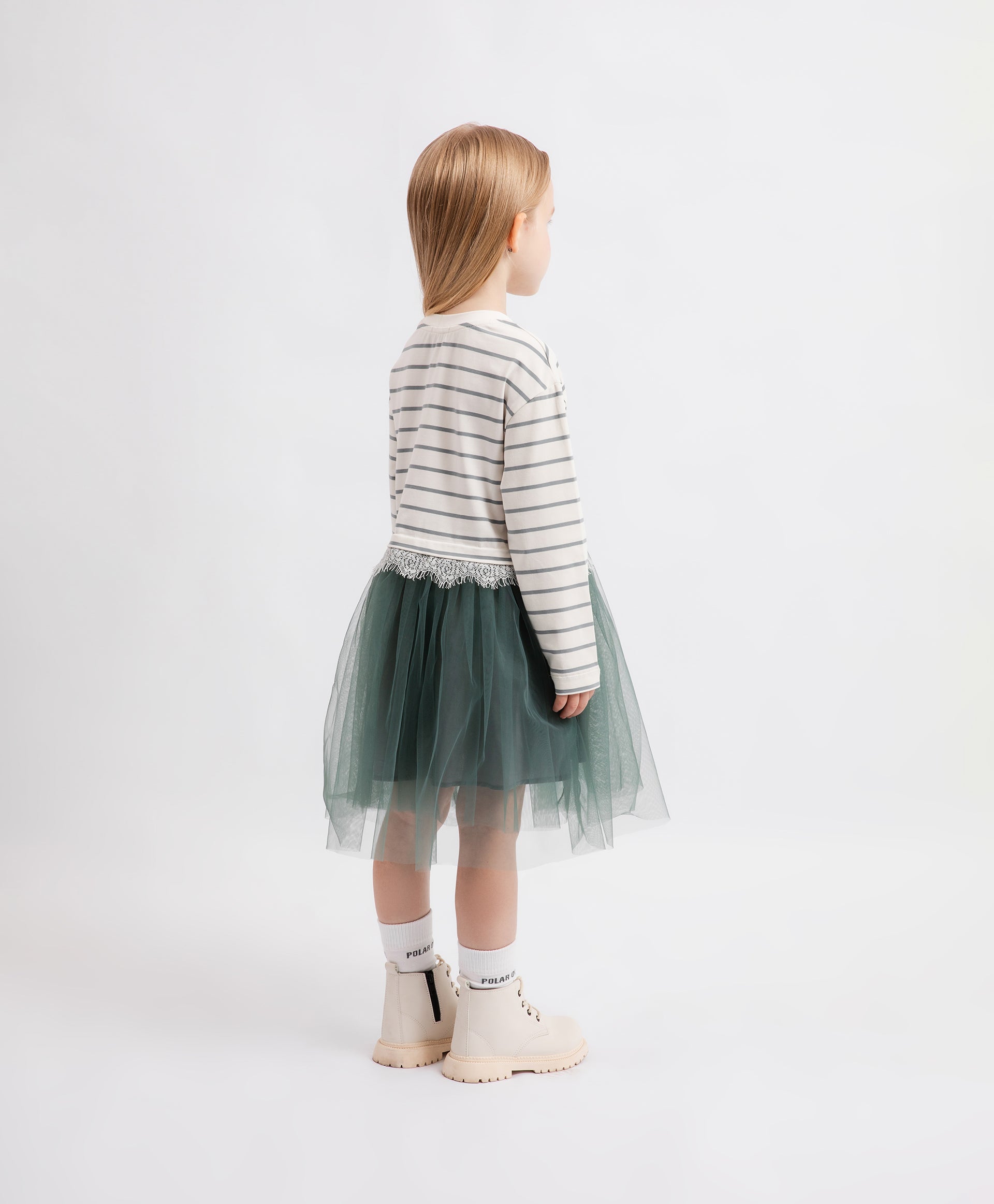 This long-sleeve dress combines comfort and elegance for stylish girls’ outfits. The upper part resembles a striped knit long-sleeve top made from soft cotton-elastane, providing a pleasant tactile feel. The skirt is crafted from layered, gathered mesh over a cotton lining in a trendy sea-blue tone, adding volume, lightness, and depth. Decorative lace trim and a whimsical printed design with scattered rhinestones complete the sophisticated look. Perfect for festive occasions or stylish everyday wear.