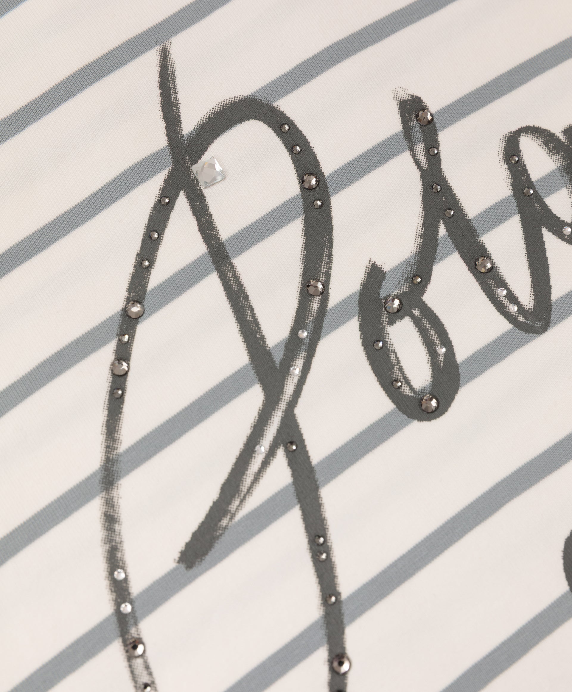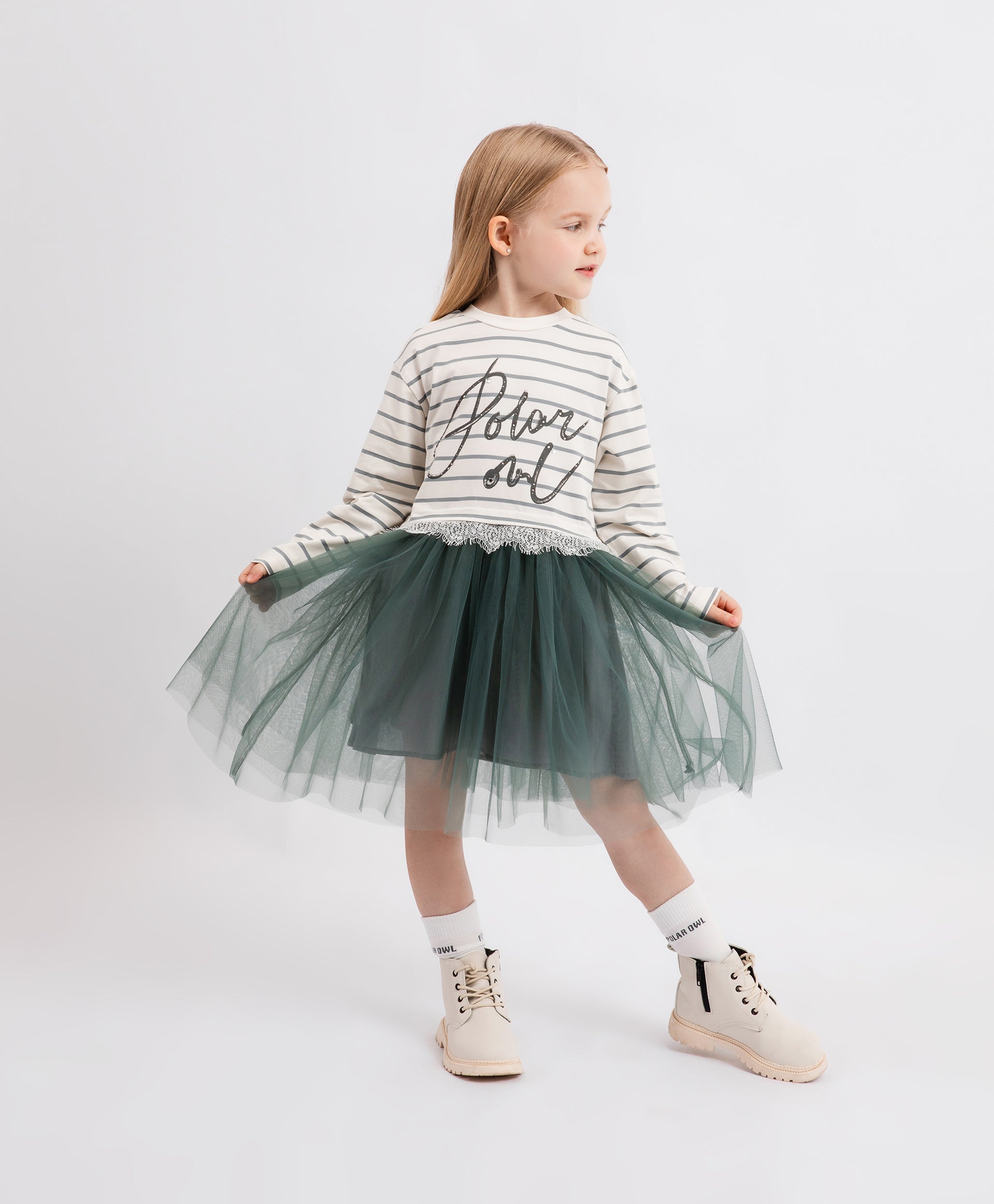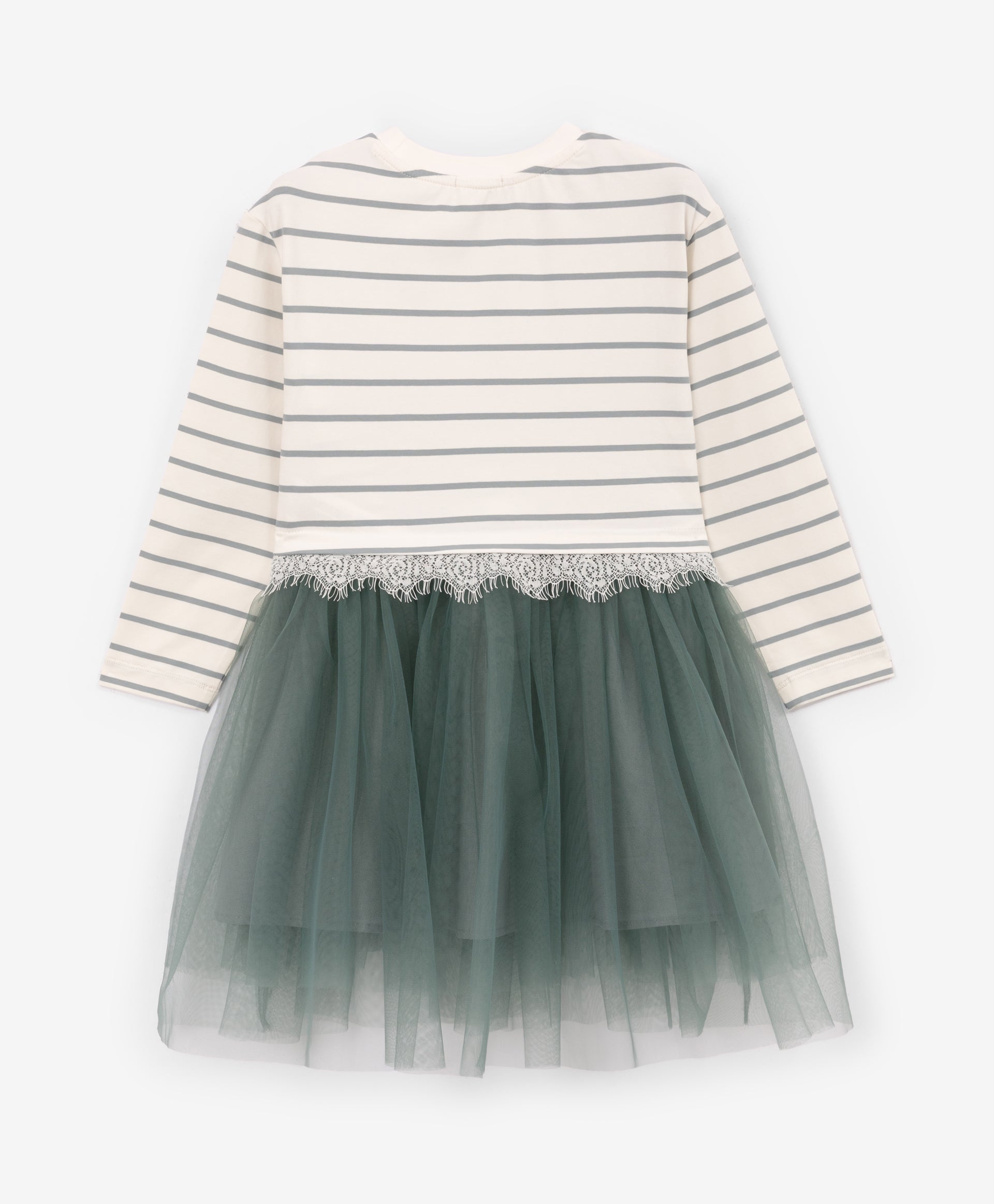 This long-sleeve dress combines comfort and elegance for stylish girls’ outfits. The upper part resembles a striped knit long-sleeve top made from soft cotton-elastane, providing a pleasant tactile feel. The skirt is crafted from layered, gathered mesh over a cotton lining in a trendy sea-blue tone, adding volume, lightness, and depth. Decorative lace trim and a whimsical printed design with scattered rhinestones complete the sophisticated look. Perfect for festive occasions or stylish everyday wear.