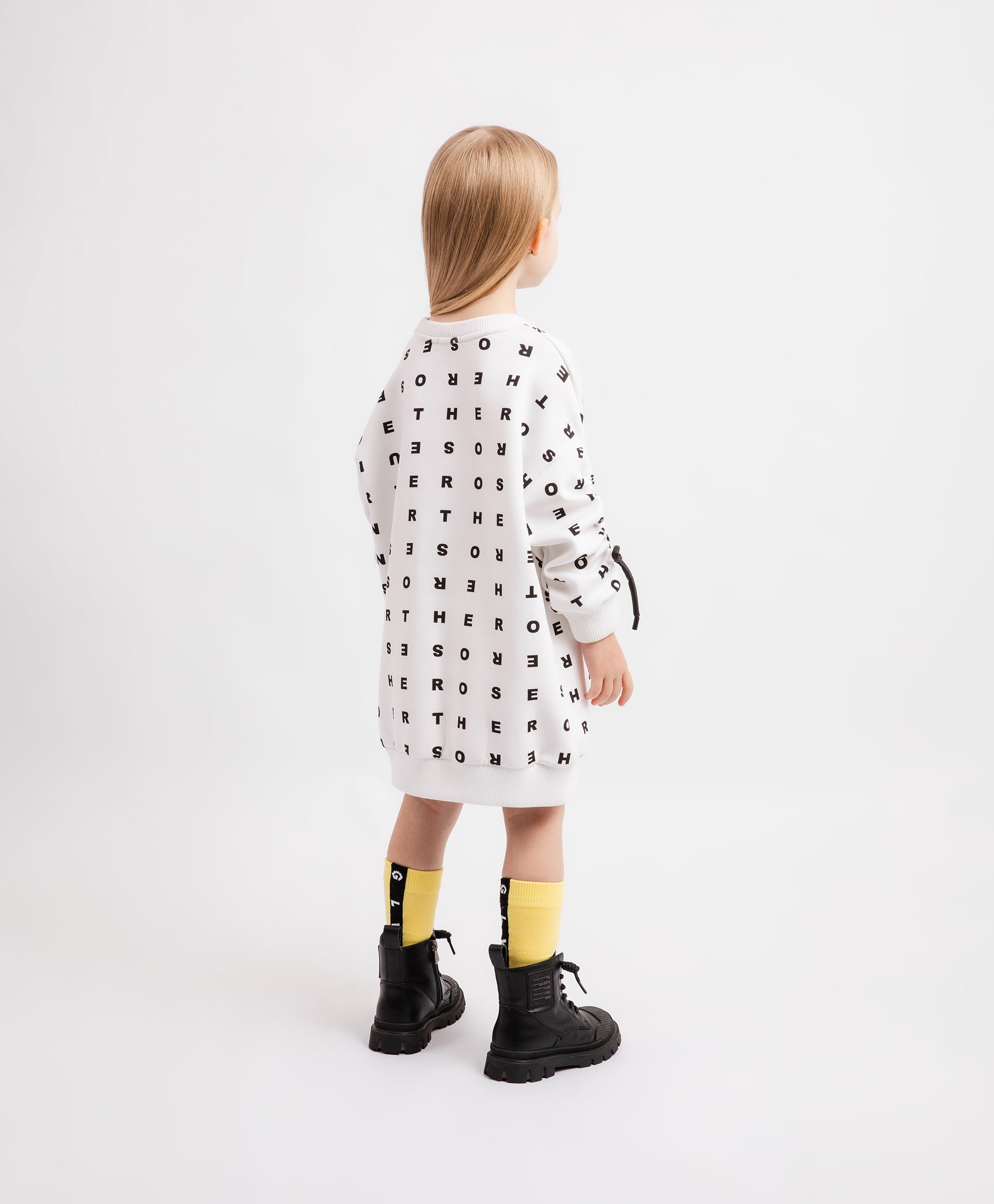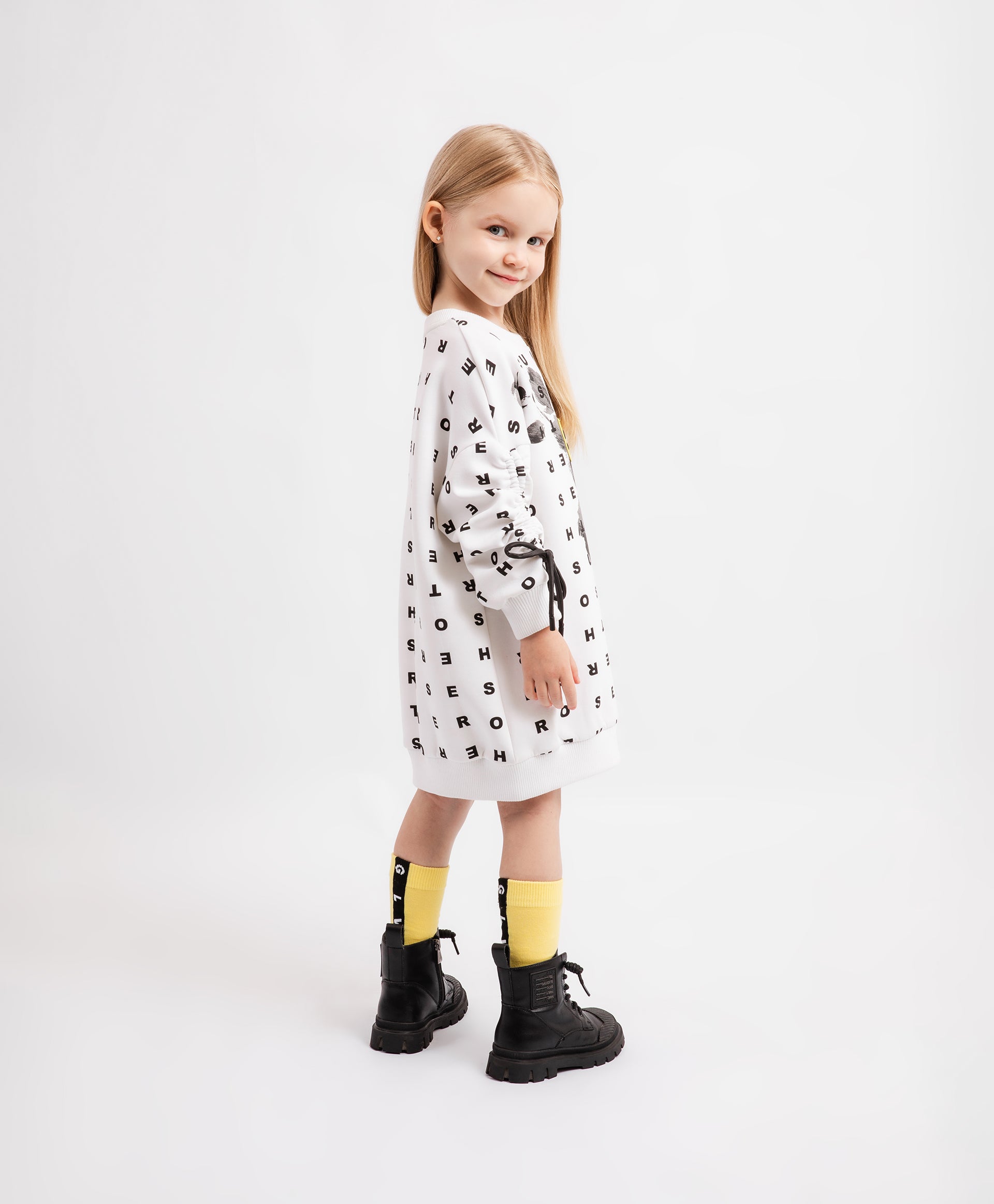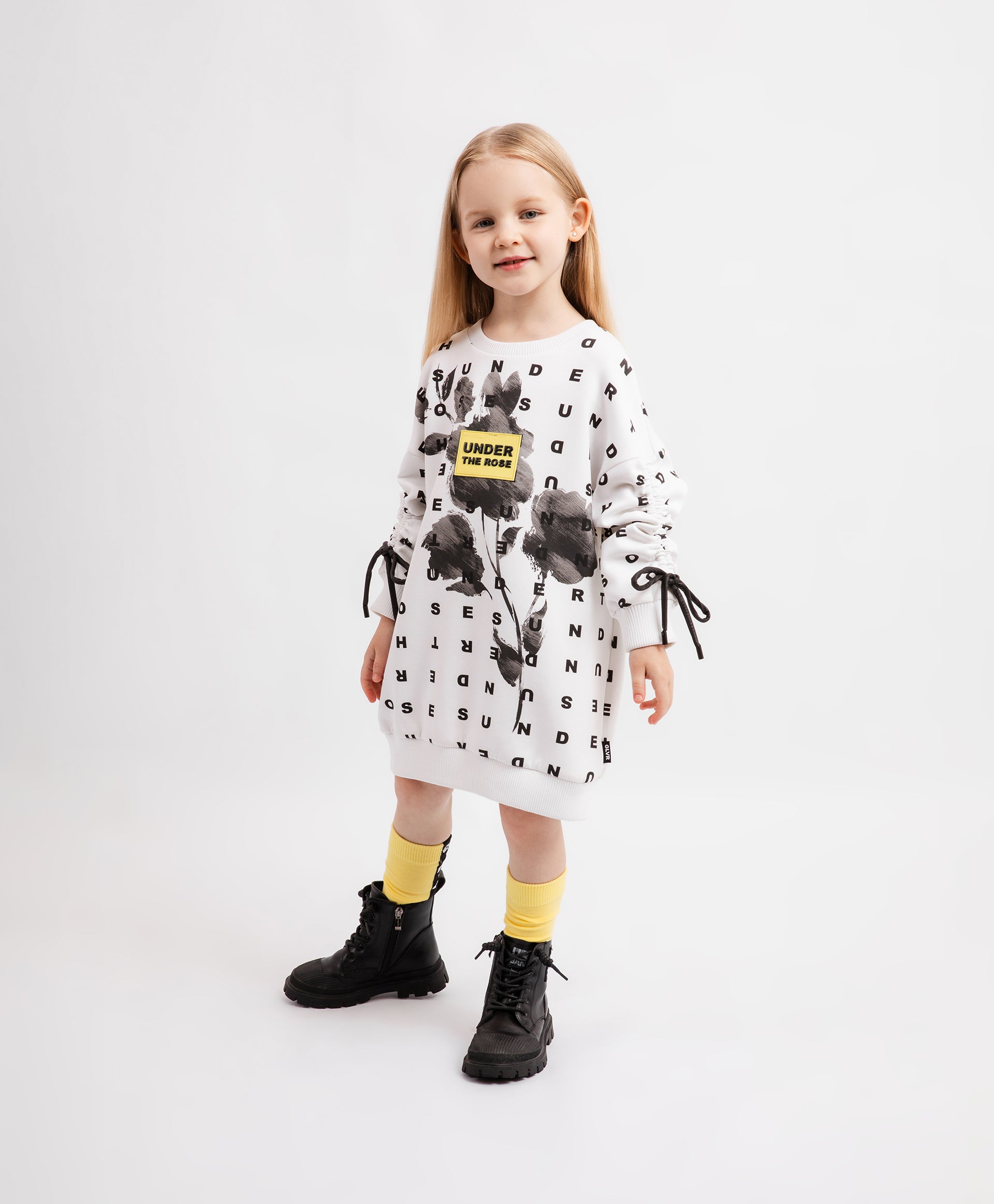 This white long-sleeve knit dress in a straight, relaxed fit with dropped shoulders is a stylish and unique choice for girls’ autumn-winter outfits. Made from soft, smooth, tactile cotton interlock, the dress features an original print with rhythmic text elements and a large floral motif, creating a bold and modern graphic look. The sleeves have accent vertical gathers ending in dangling cords, adding both design interest and functional adjustability for sleeve length and fit. Ribbed neckline, cuffs, and hem form a fashionable O-shaped silhouette.