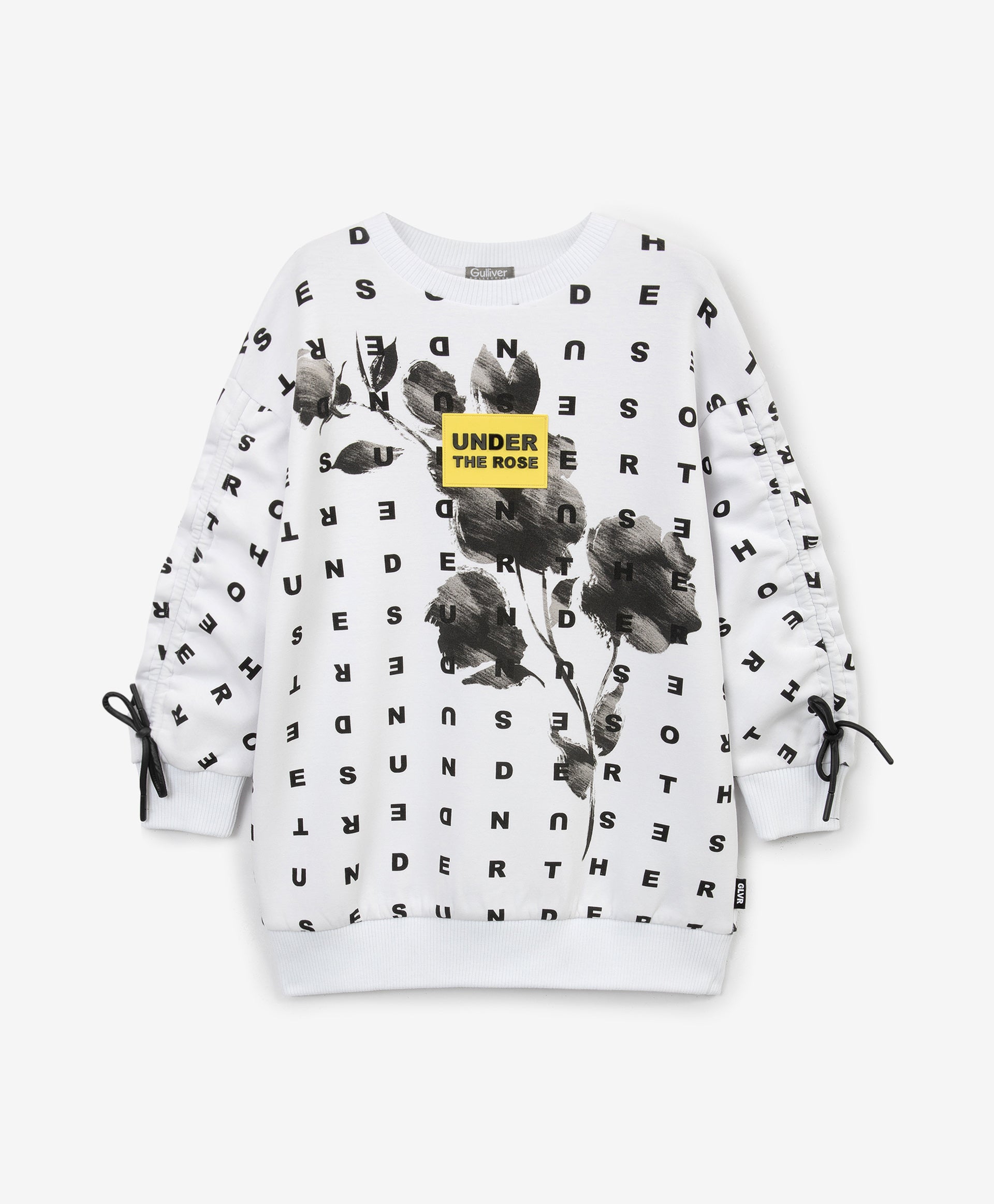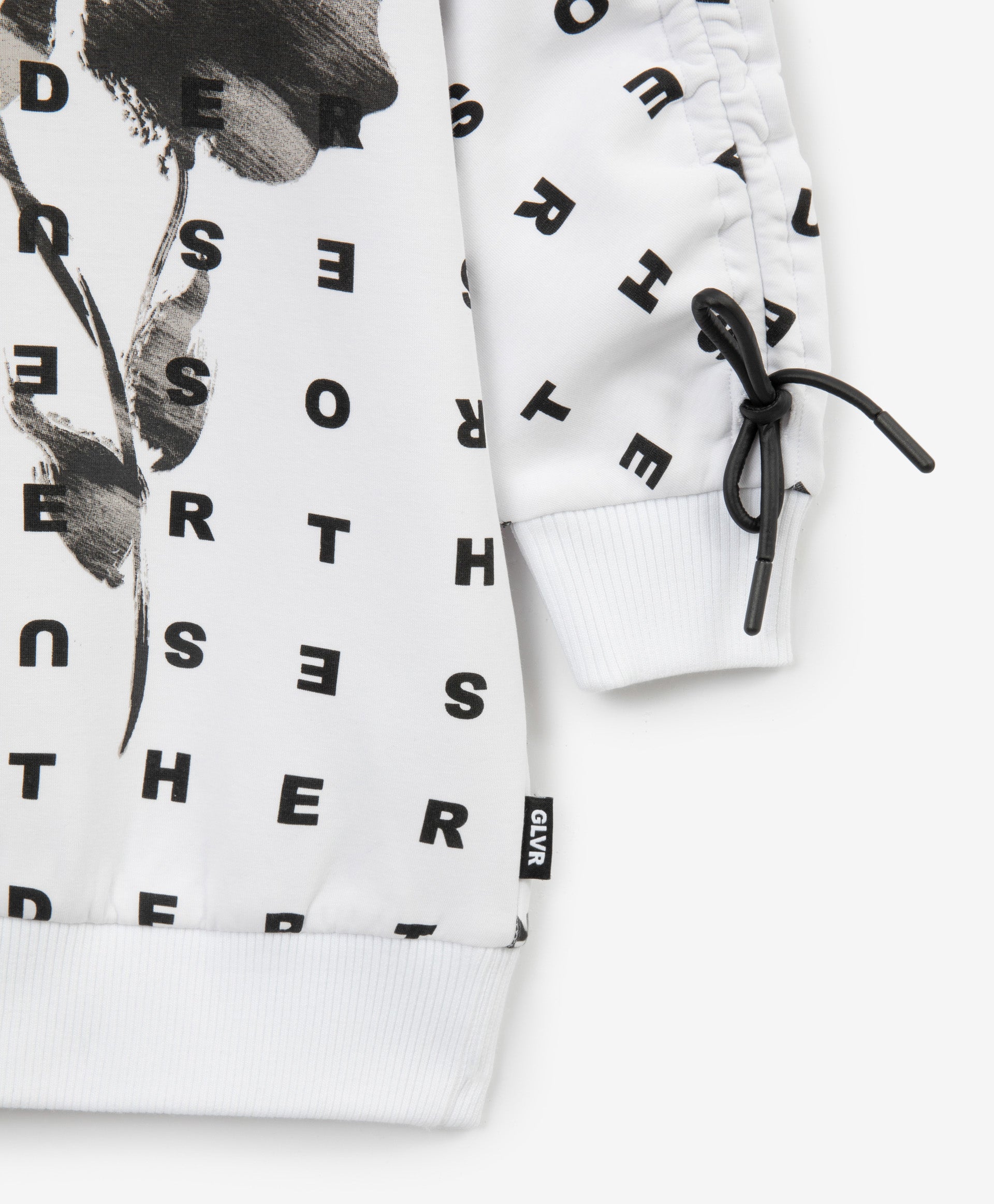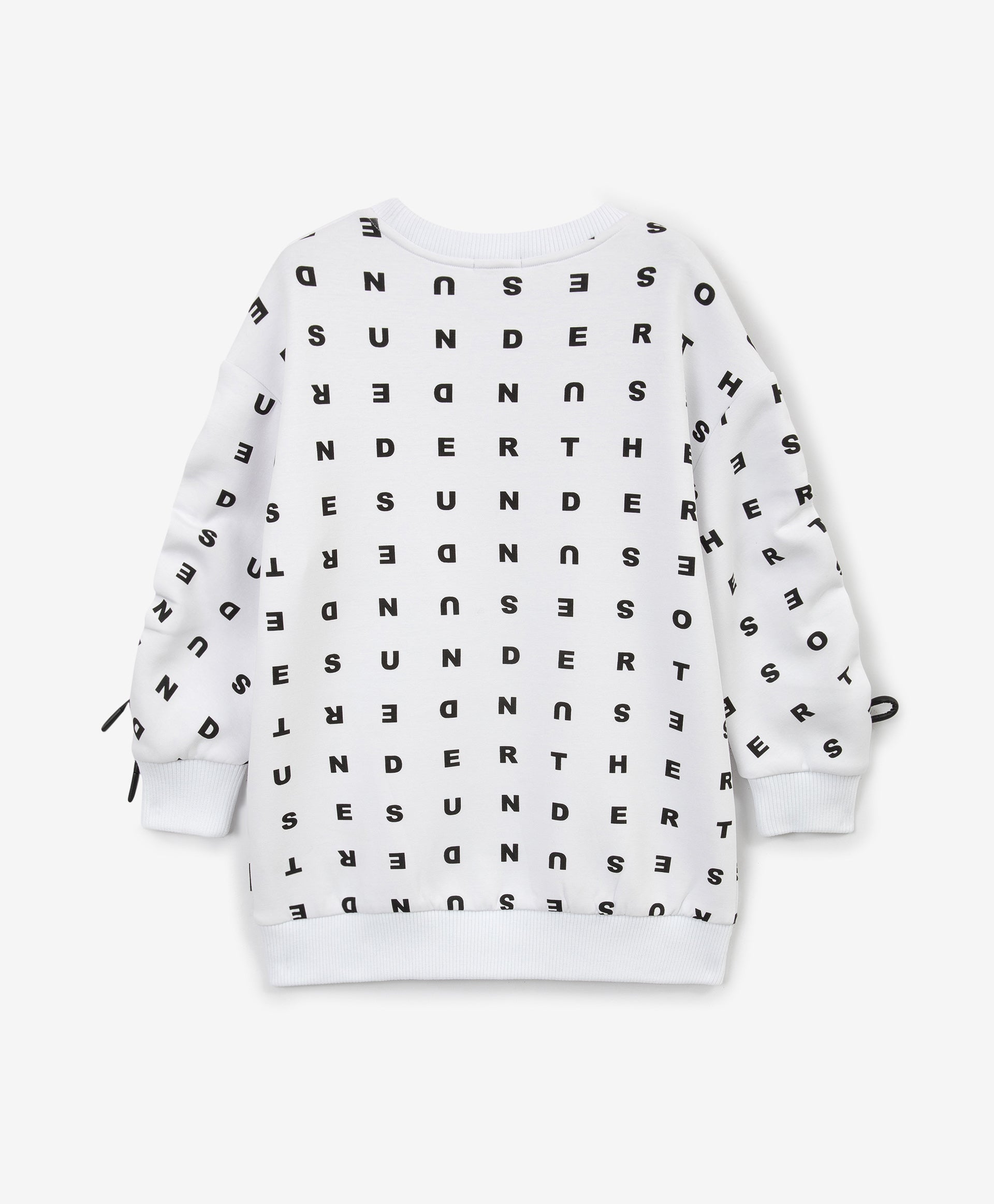 This white long-sleeve knit dress in a straight, relaxed fit with dropped shoulders is a stylish and unique choice for girls’ autumn-winter outfits. Made from soft, smooth, tactile cotton interlock, the dress features an original print with rhythmic text elements and a large floral motif, creating a bold and modern graphic look. The sleeves have accent vertical gathers ending in dangling cords, adding both design interest and functional adjustability for sleeve length and fit. Ribbed neckline, cuffs, and hem form a fashionable O-shaped silhouette.