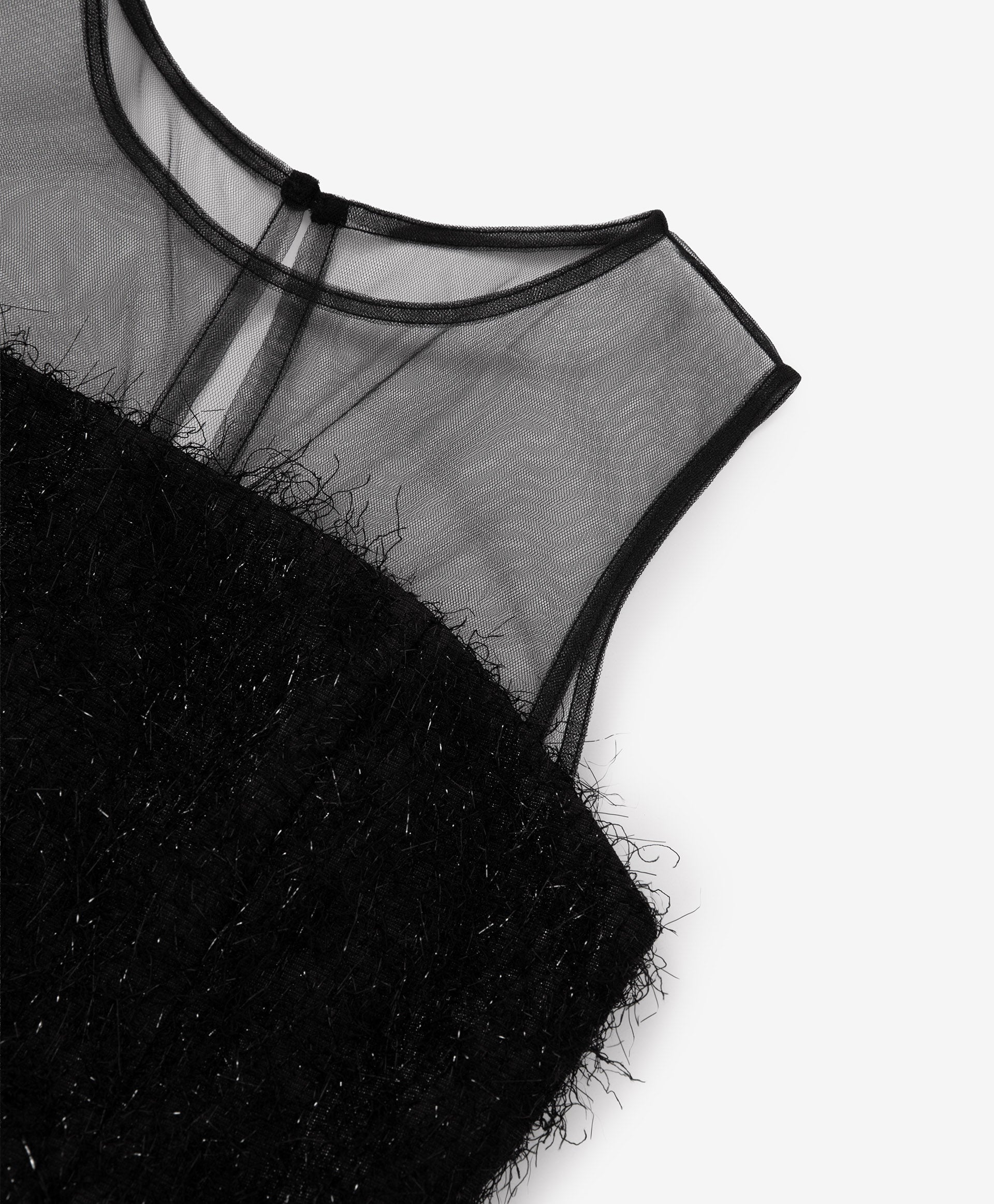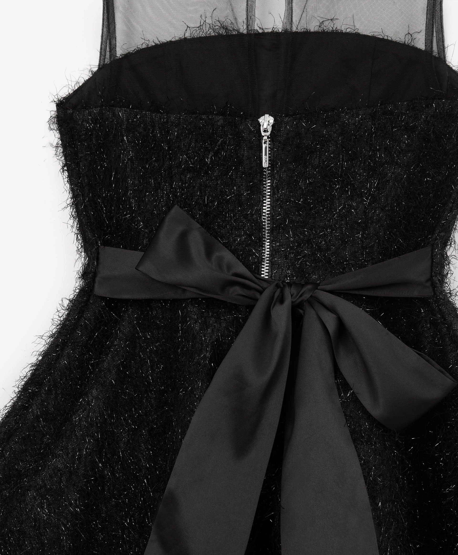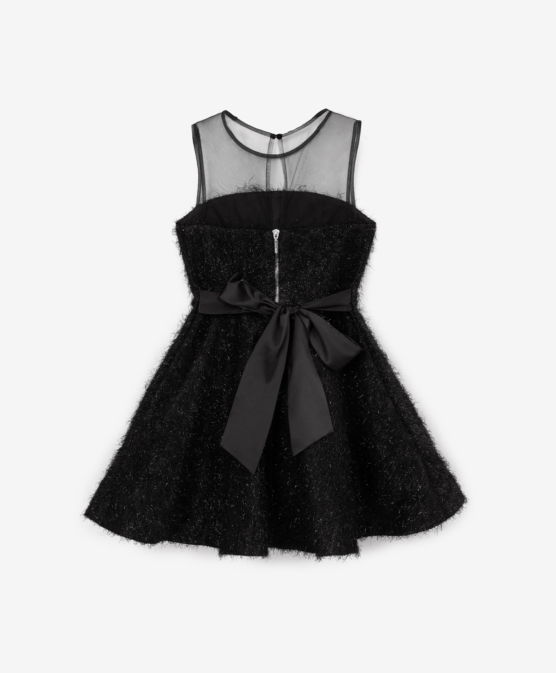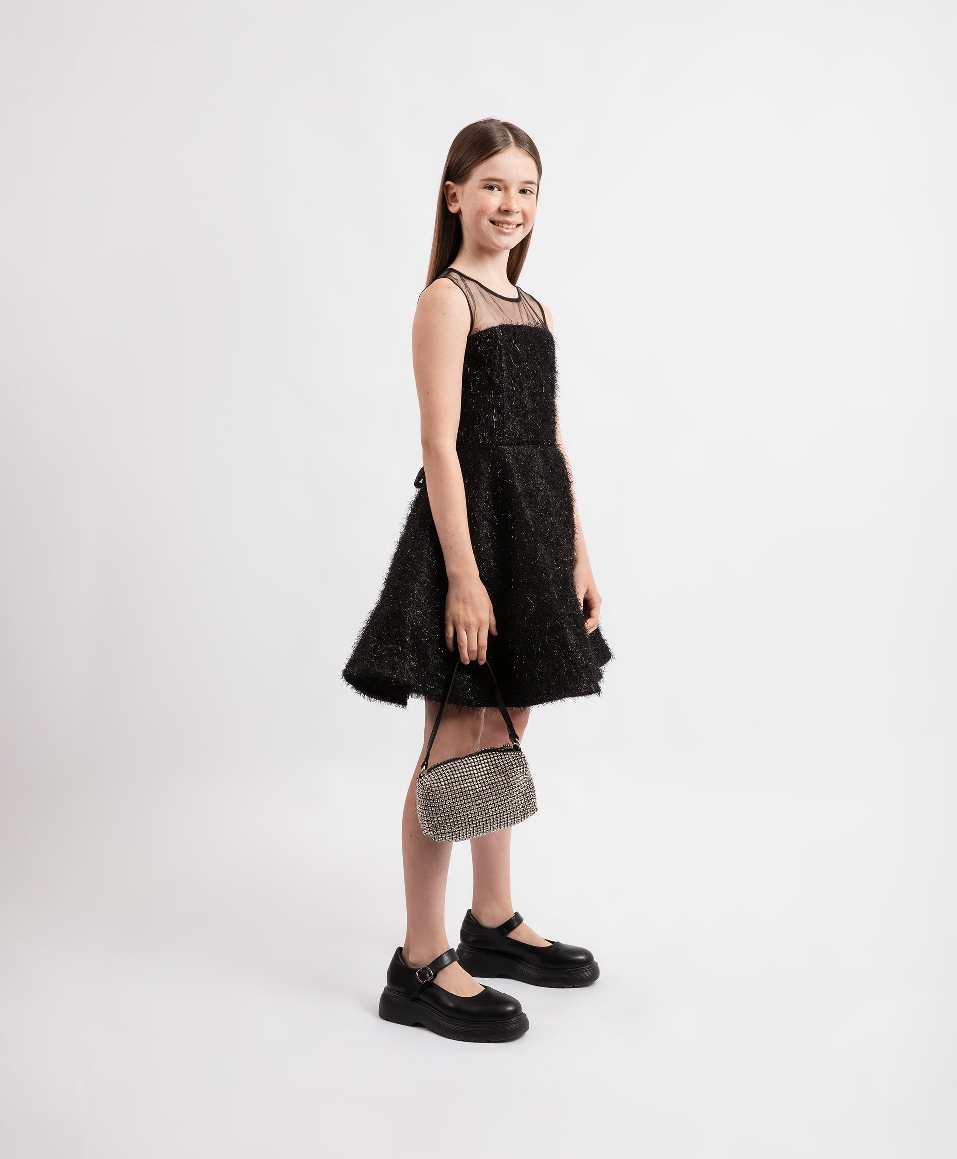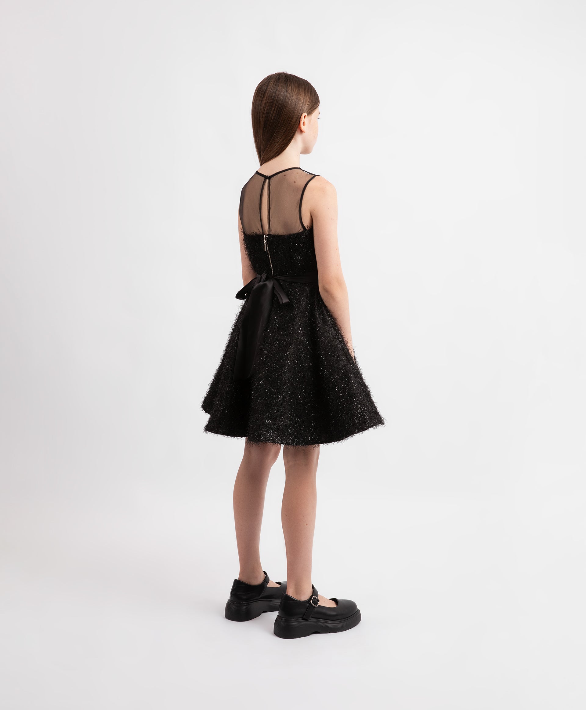 A glamorous black fitted dress for girls from the Pink Quartz collection by Gulliver. Designed for festive occasions, it features a voluminous sun skirt and a corset-inspired bodice made from textured fabric with shimmering lurex threads. The cotton-lined skirt includes an extra mesh layer for fullness, while the silky back tie allows for an adjustable fit. The mesh bodice has a button-loop closure, and the corset part fastens with a metal zipper. Perfect for creating a star-worthy look.