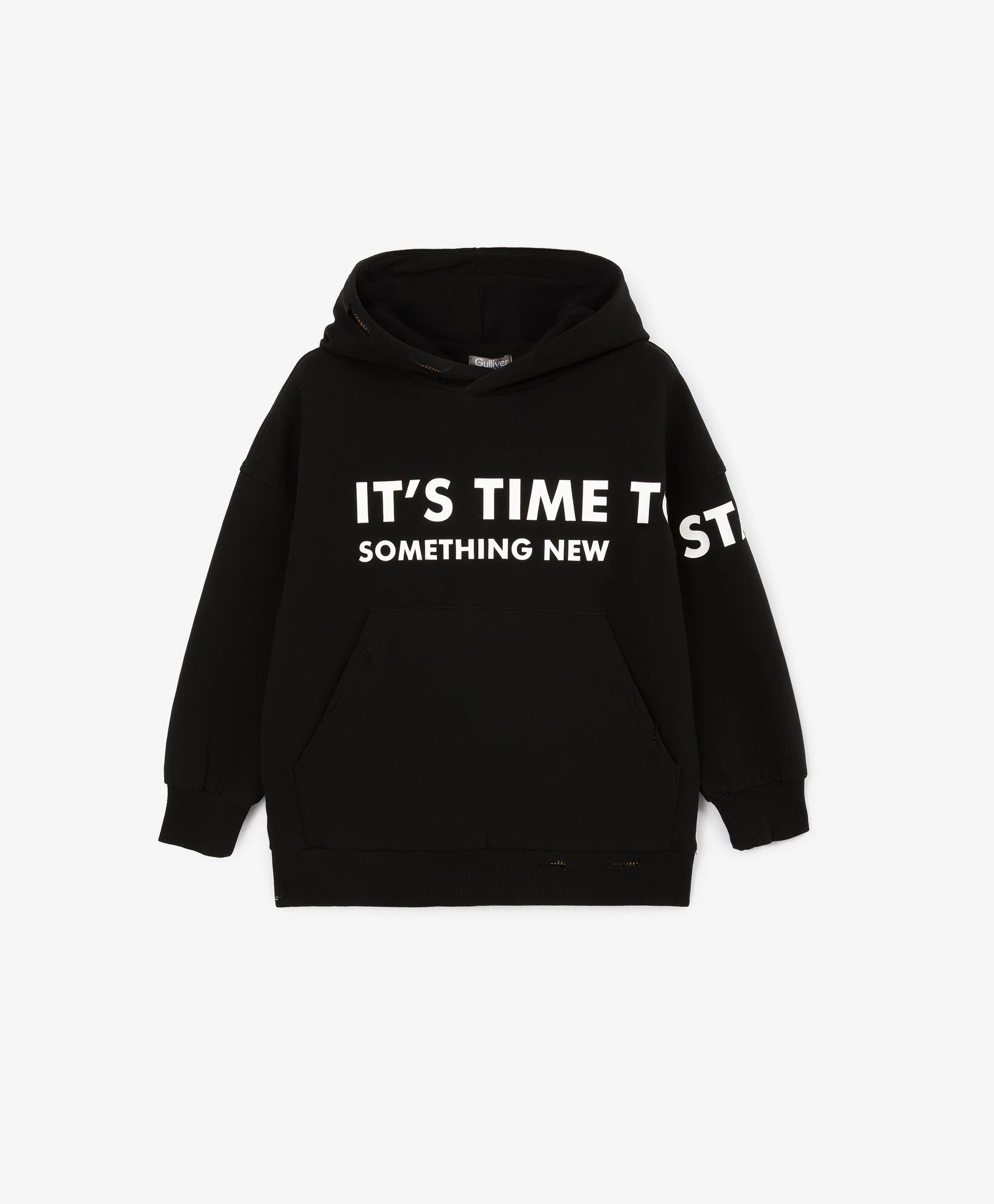 This black hoodie is a must-have for your boy's fall-winter wardrobe. Featuring a relaxed fit with dropped shoulders, it's crafted from soft, stretchy cotton French terry that's comfortable and perfect for chilly days. The fabric offers excellent warmth retention and shape stability. The hoodie is designed with a bold text print on the front that reads "It's time to start something new" for an inspiring touch. It also comes with a hood, kangaroo pocket, ribbed cuffs, and an elasticated waistband for added comfort and style.