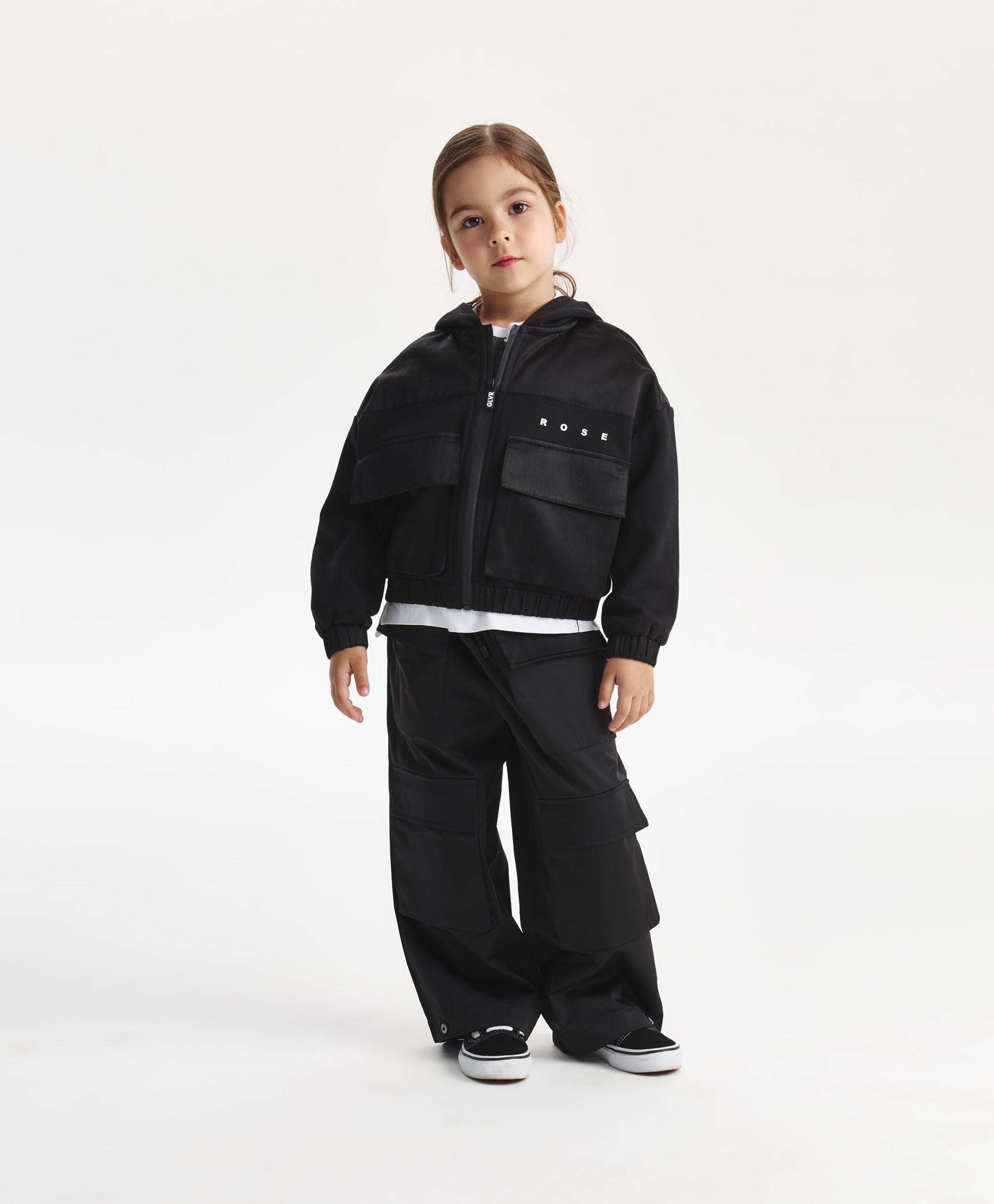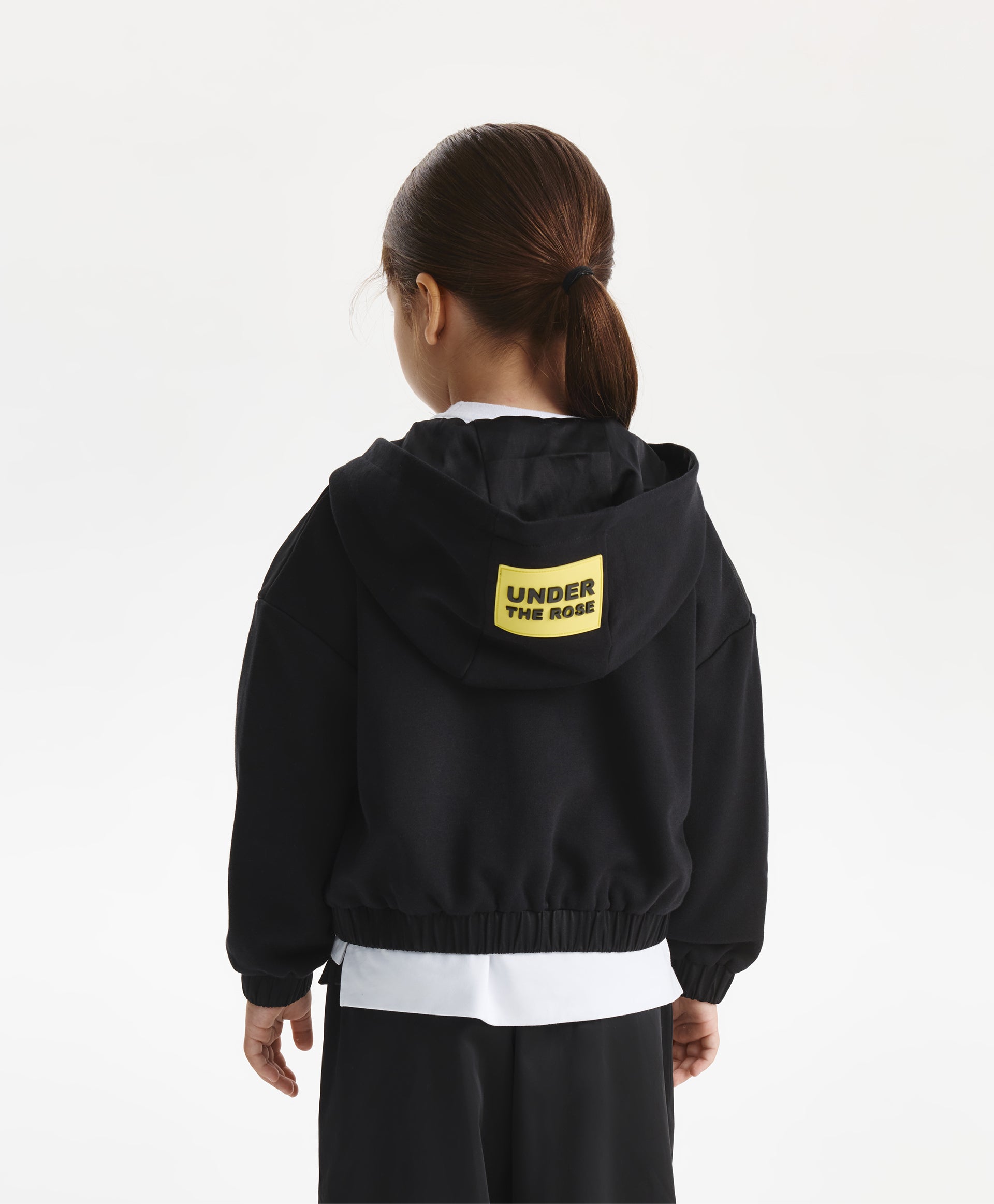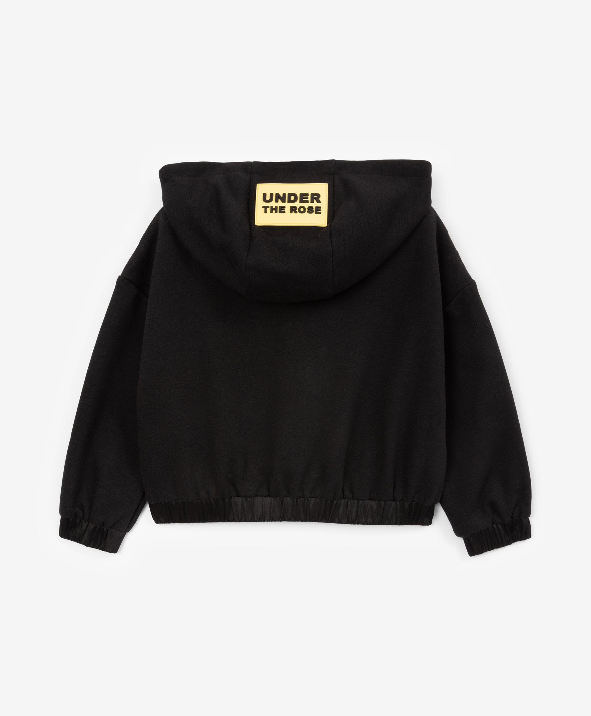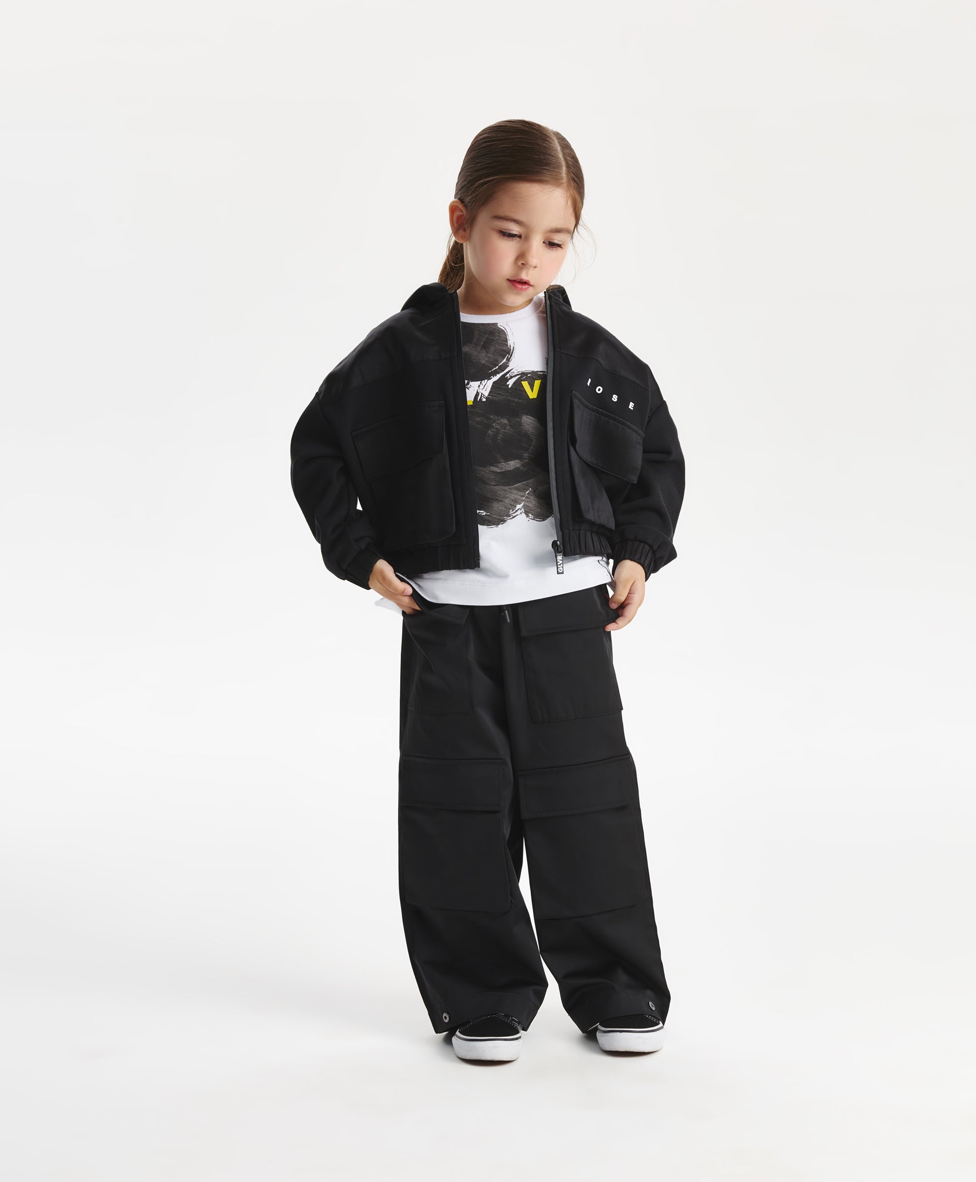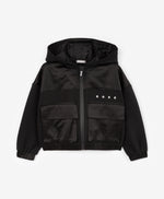 A stylish black bomber-style sweatshirt for girls, designed in a relaxed fit with dropped shoulders. Made from durable cotton French terry, it ensures comfort and shape retention. The textured contrast between the main fabric and the textile yoke adds a modern edge. Large flap pockets give the sweatshirt a practical and trendy look, while the hood with a contrast text patch and minimalist lettering details complete the sporty aesthetic. Perfect for dynamic everyday fall looks.