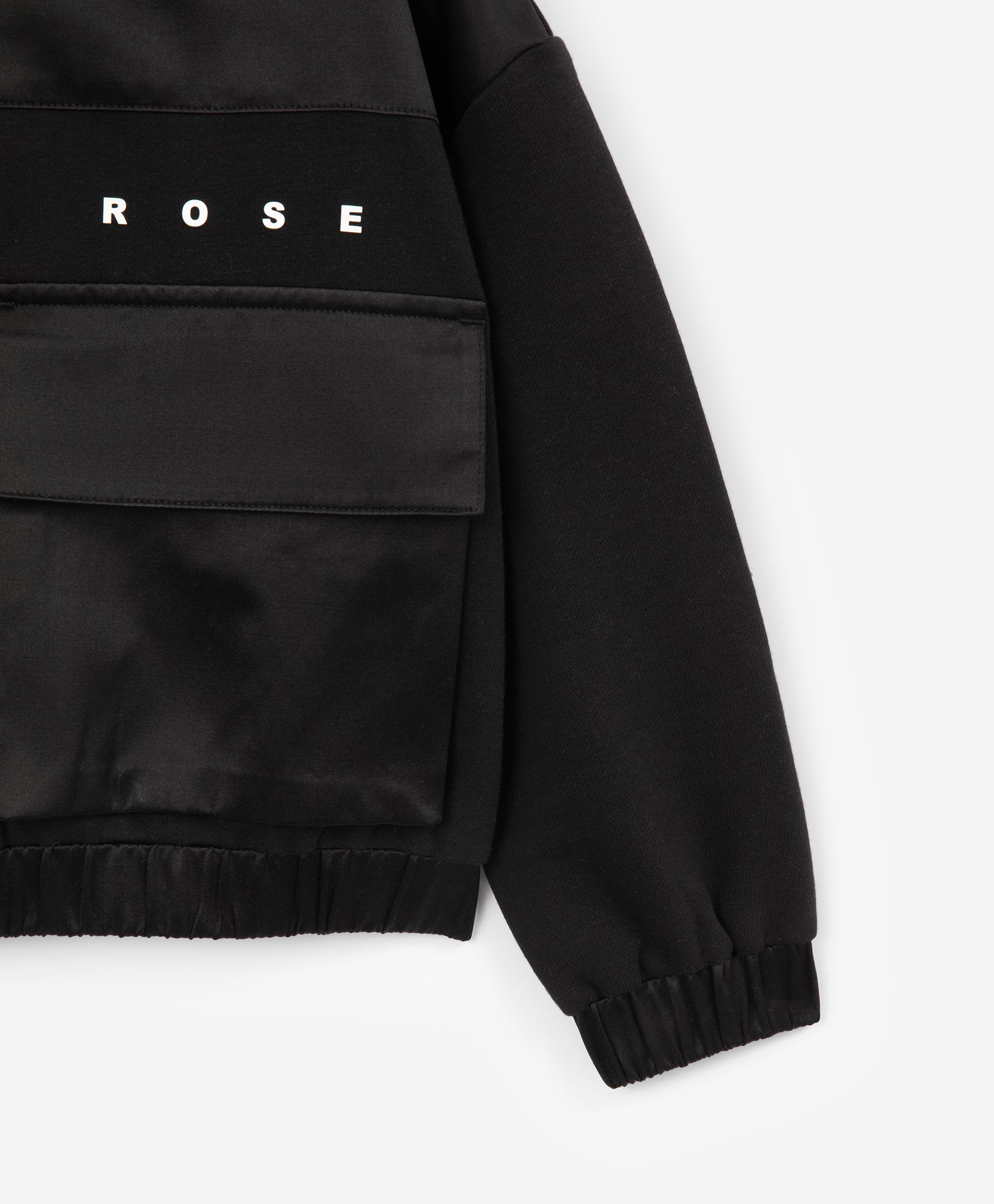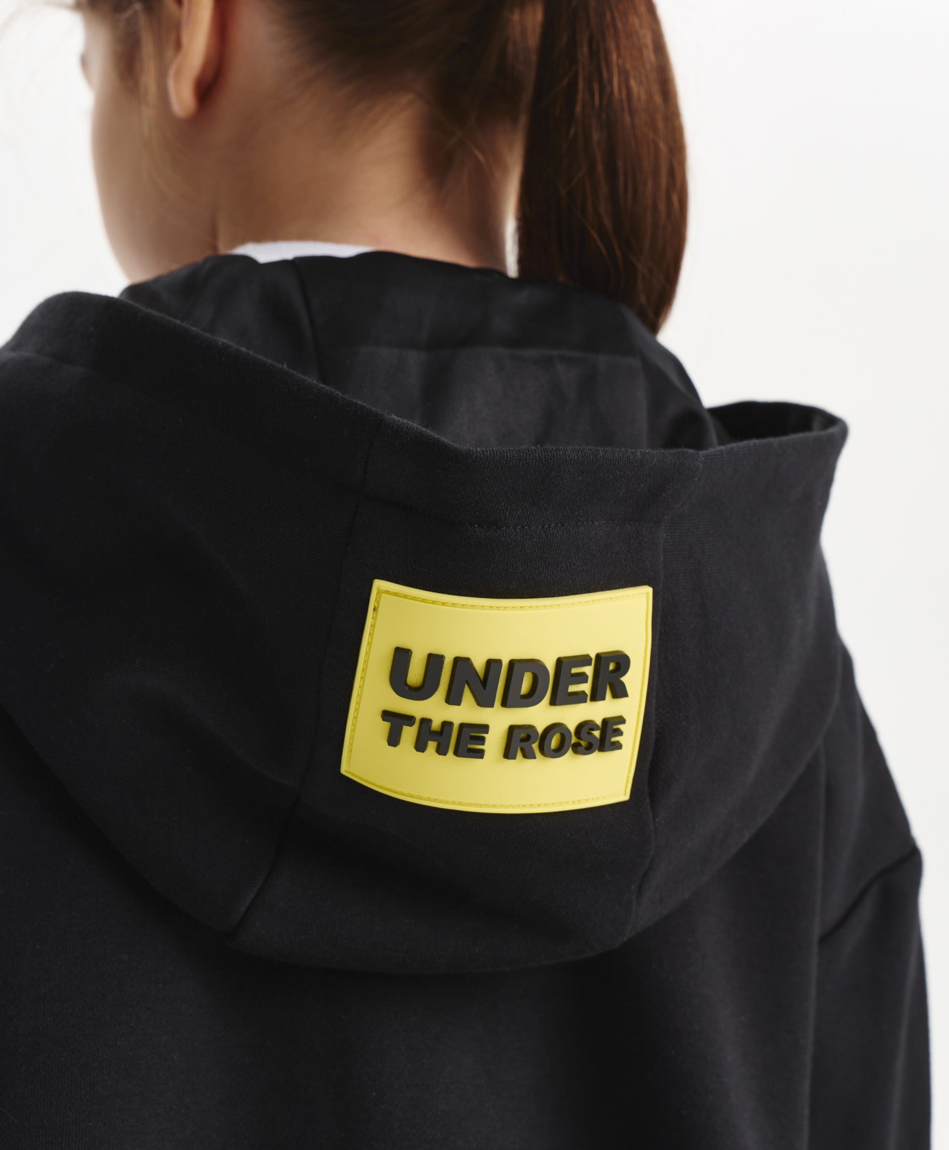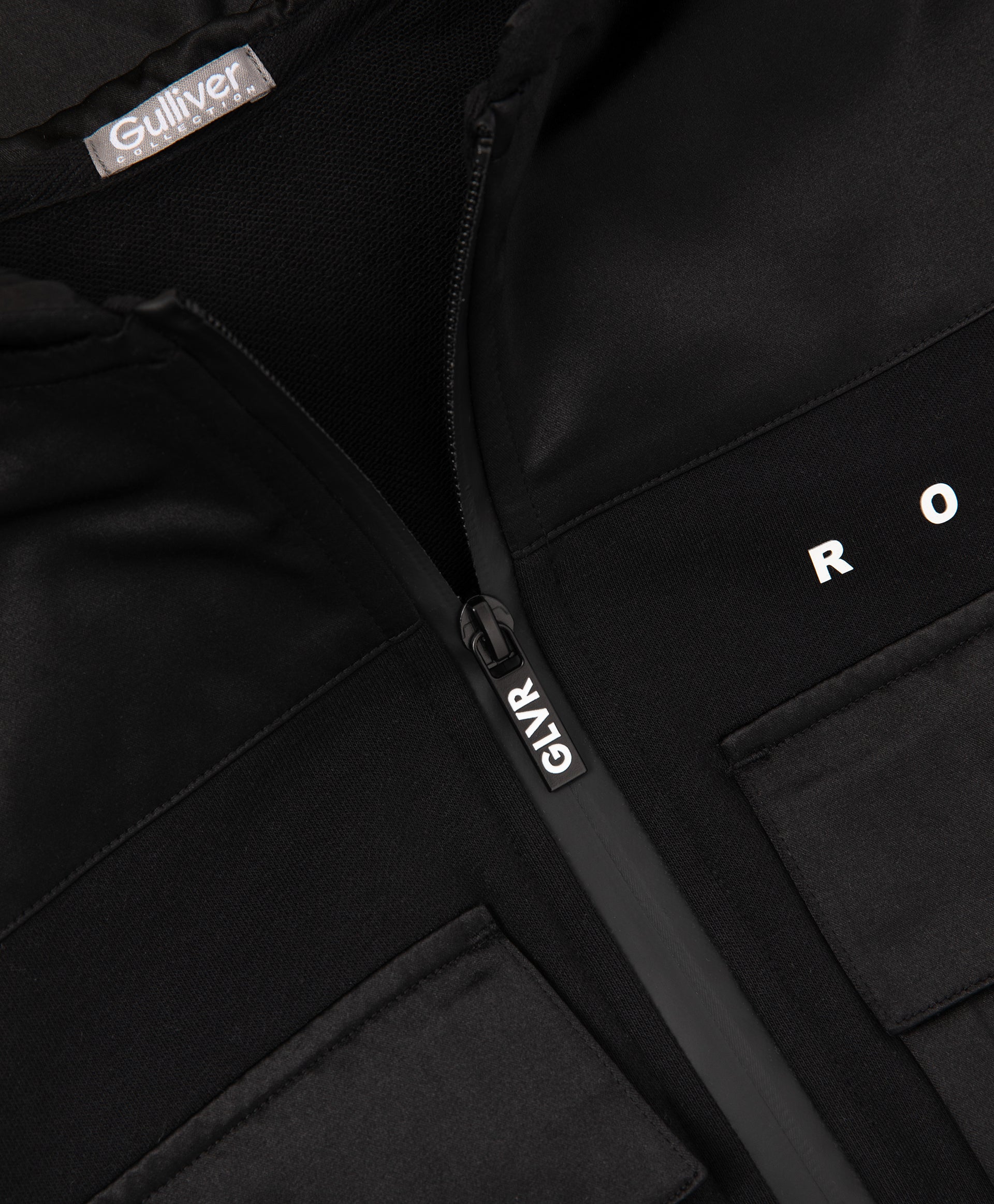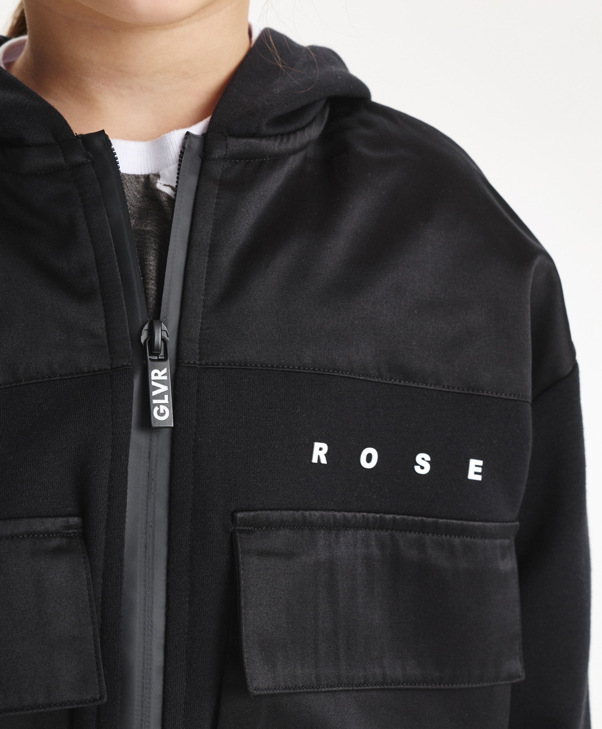 A stylish black bomber-style sweatshirt for girls, designed in a relaxed fit with dropped shoulders. Made from durable cotton French terry, it ensures comfort and shape retention. The textured contrast between the main fabric and the textile yoke adds a modern edge. Large flap pockets give the sweatshirt a practical and trendy look, while the hood with a contrast text patch and minimalist lettering details complete the sporty aesthetic. Perfect for dynamic everyday fall looks.