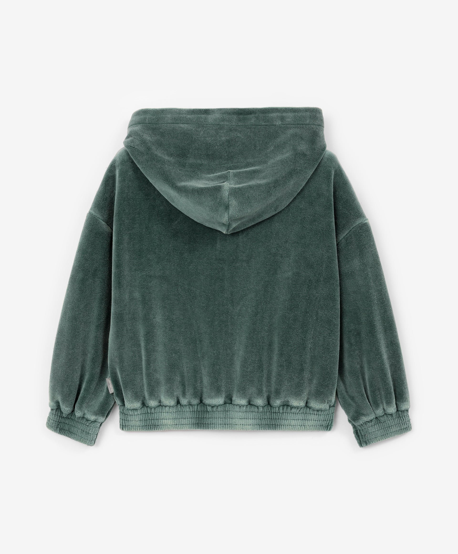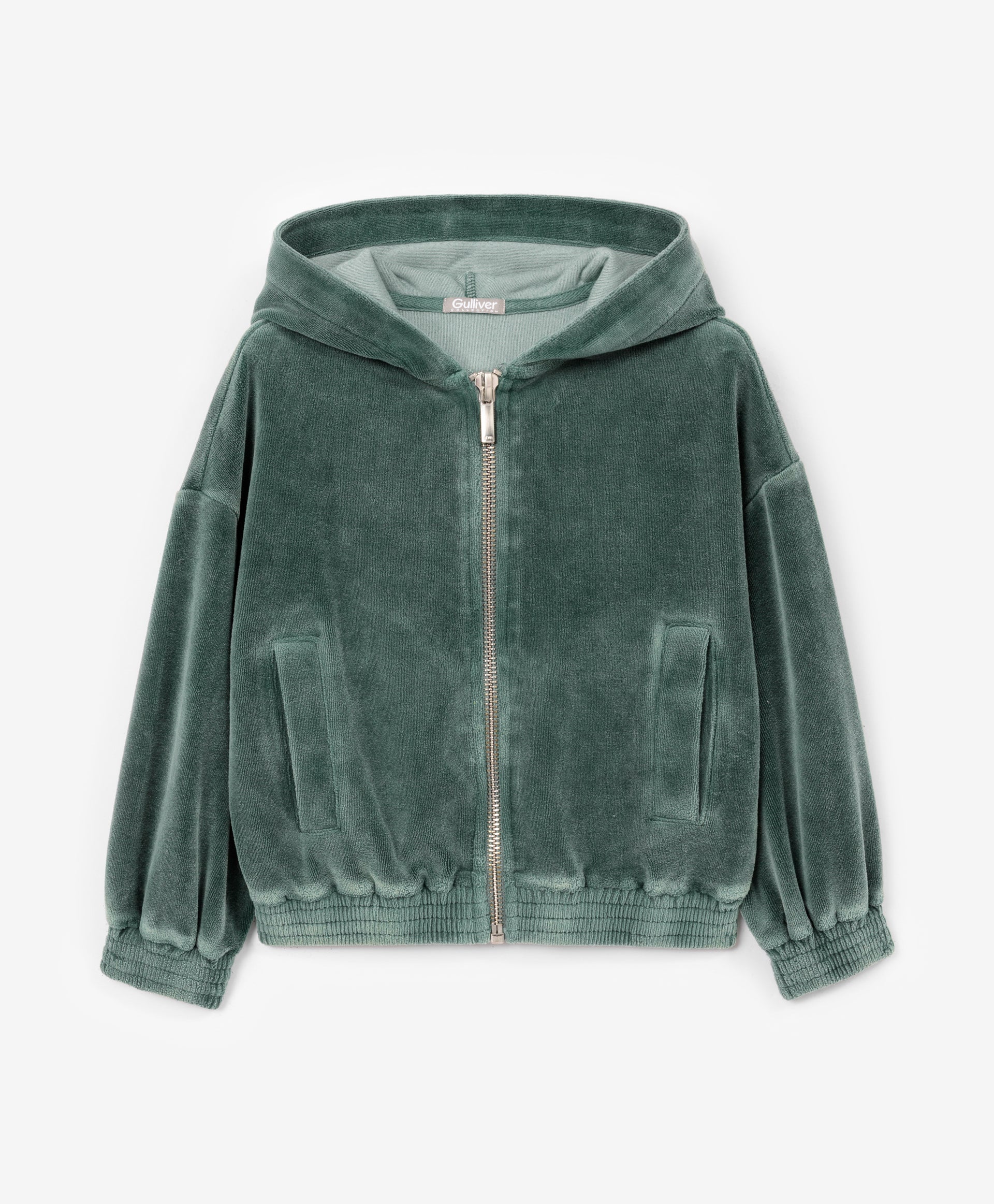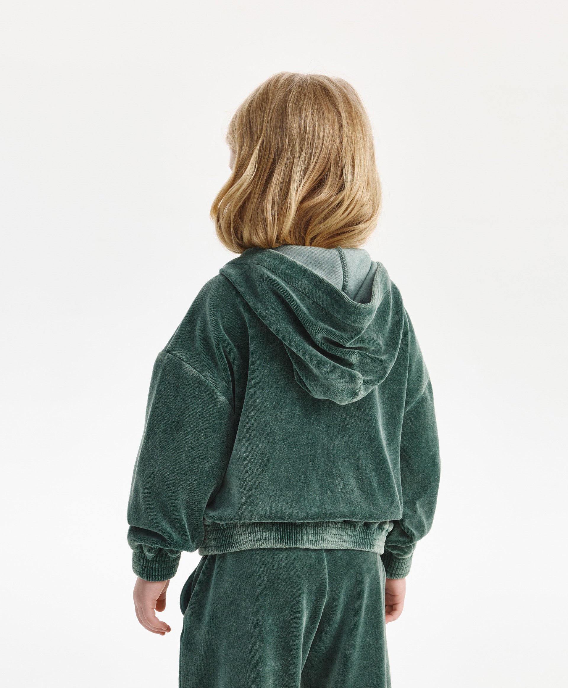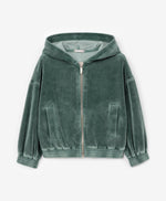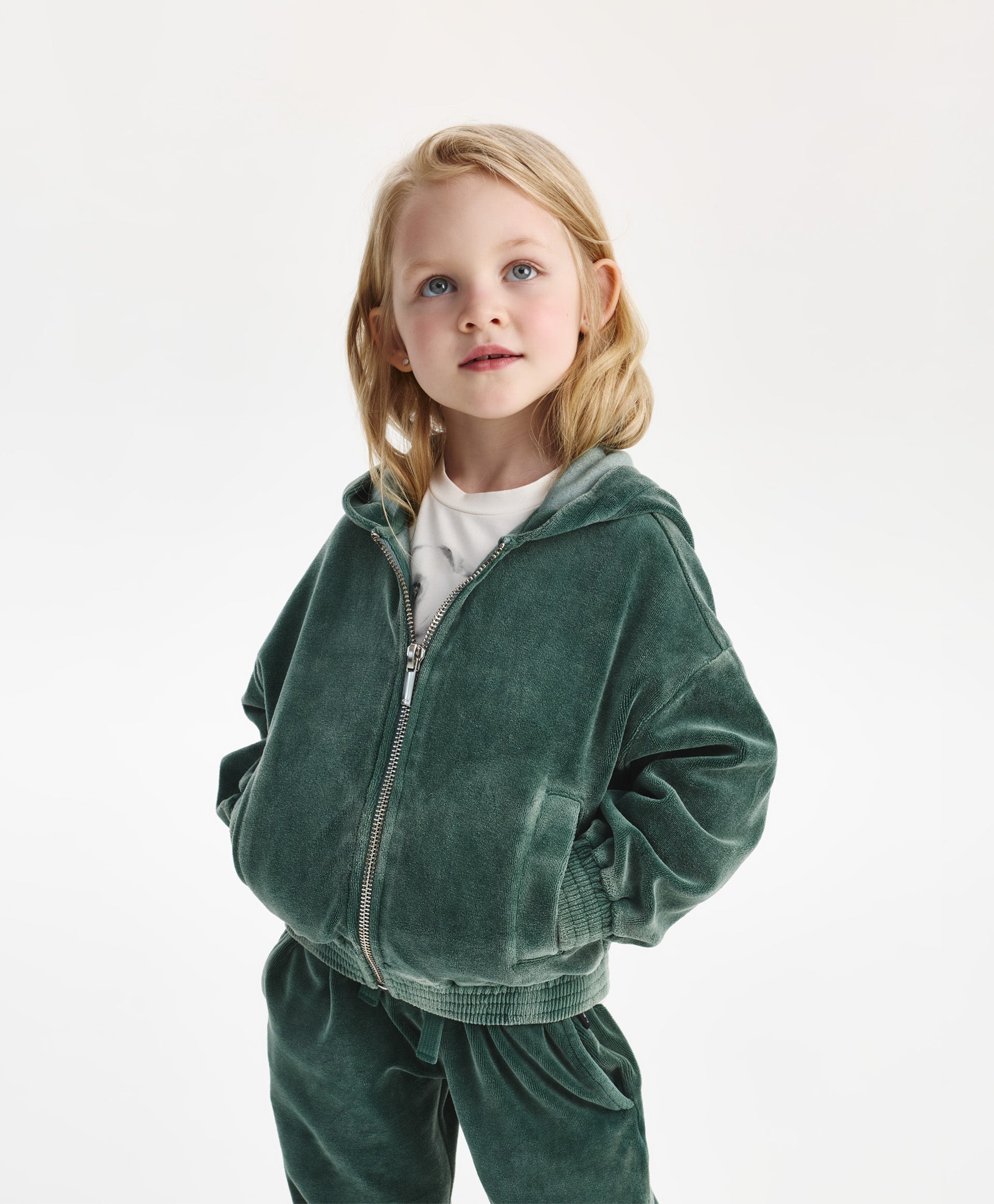 This teal velour zip-up sweatshirt for girls is a cozy and elegant piece for the fall-winter season. Made from soft cotton-blend knit with a washed finish, it offers a fashionable vintage look and exceptional comfort. The relaxed silhouette with dropped shoulders ensures freedom of movement, while the delicate embroidered lettering with transparent rhinestones adds a refined sparkle. The sweatshirt features welt pockets and a front zipper for convenience. Perfect as an outer layer for autumn or a warm layer under a jacket in winter.