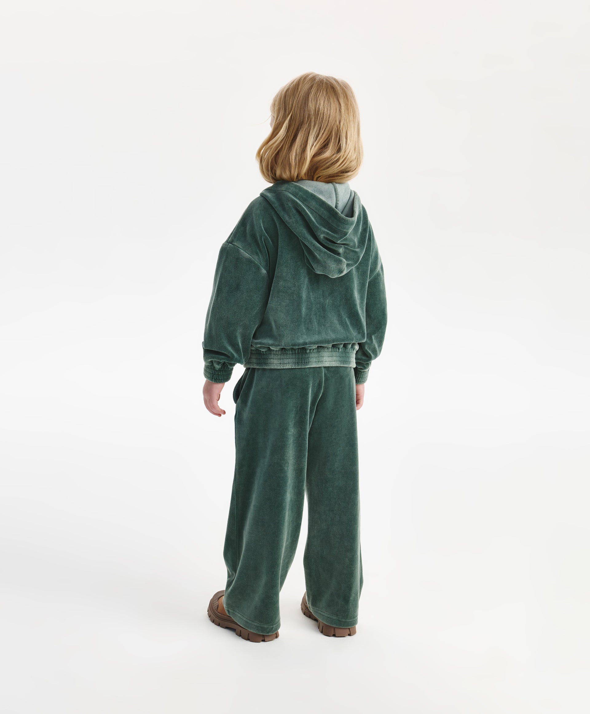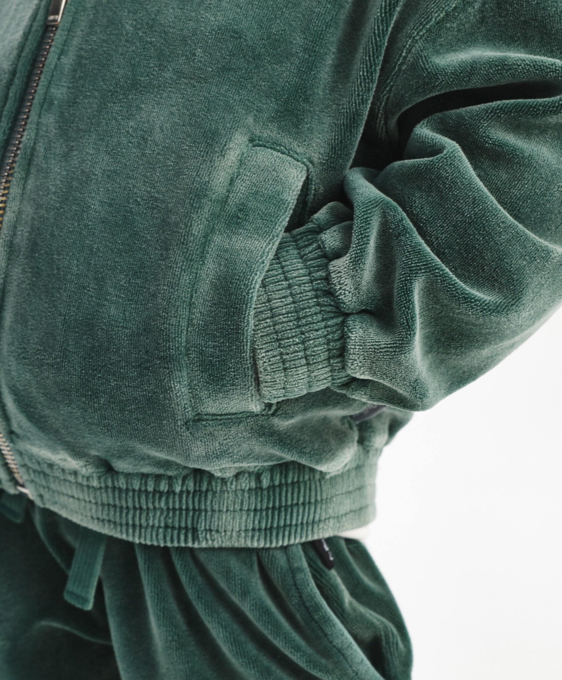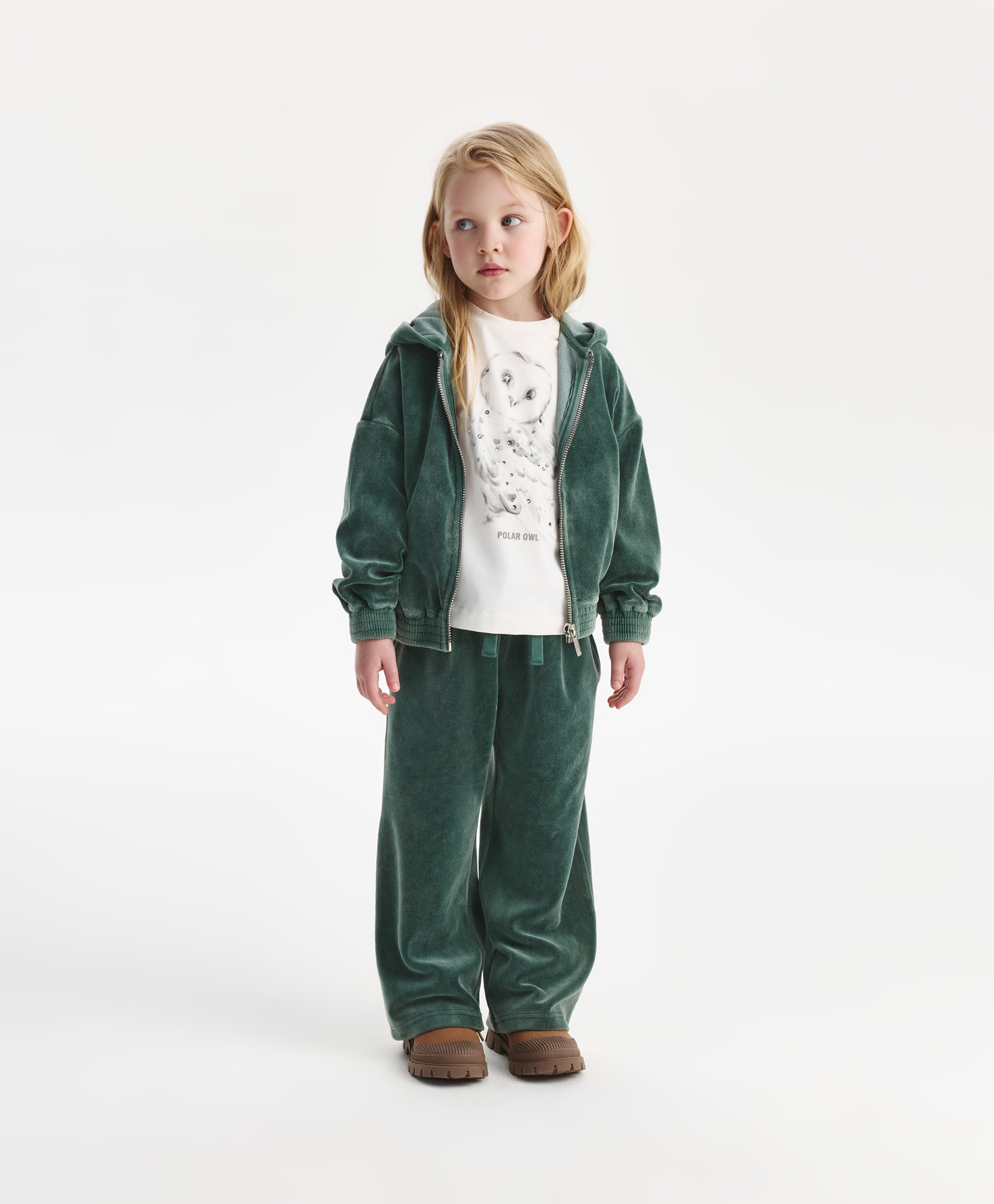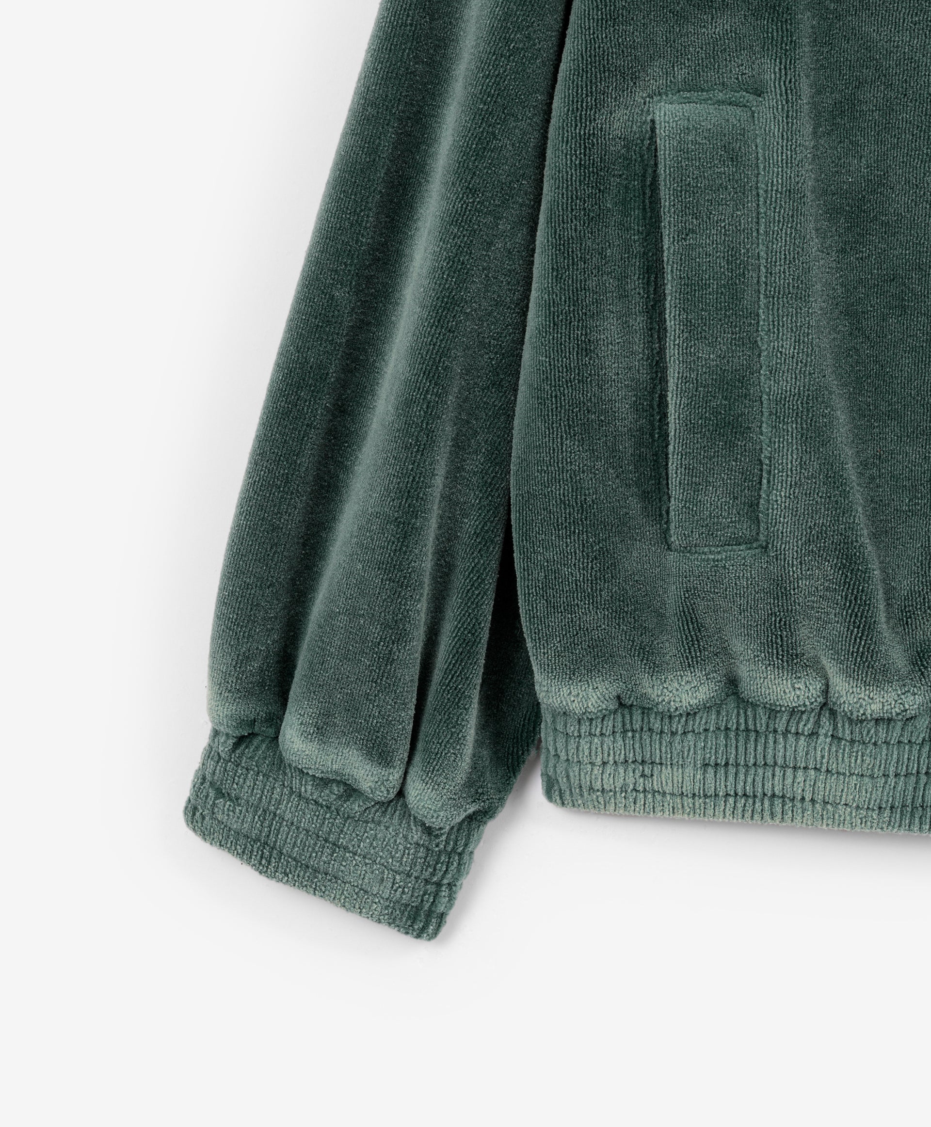 This teal velour zip-up sweatshirt for girls is a cozy and elegant piece for the fall-winter season. Made from soft cotton-blend knit with a washed finish, it offers a fashionable vintage look and exceptional comfort. The relaxed silhouette with dropped shoulders ensures freedom of movement, while the delicate embroidered lettering with transparent rhinestones adds a refined sparkle. The sweatshirt features welt pockets and a front zipper for convenience. Perfect as an outer layer for autumn or a warm layer under a jacket in winter.