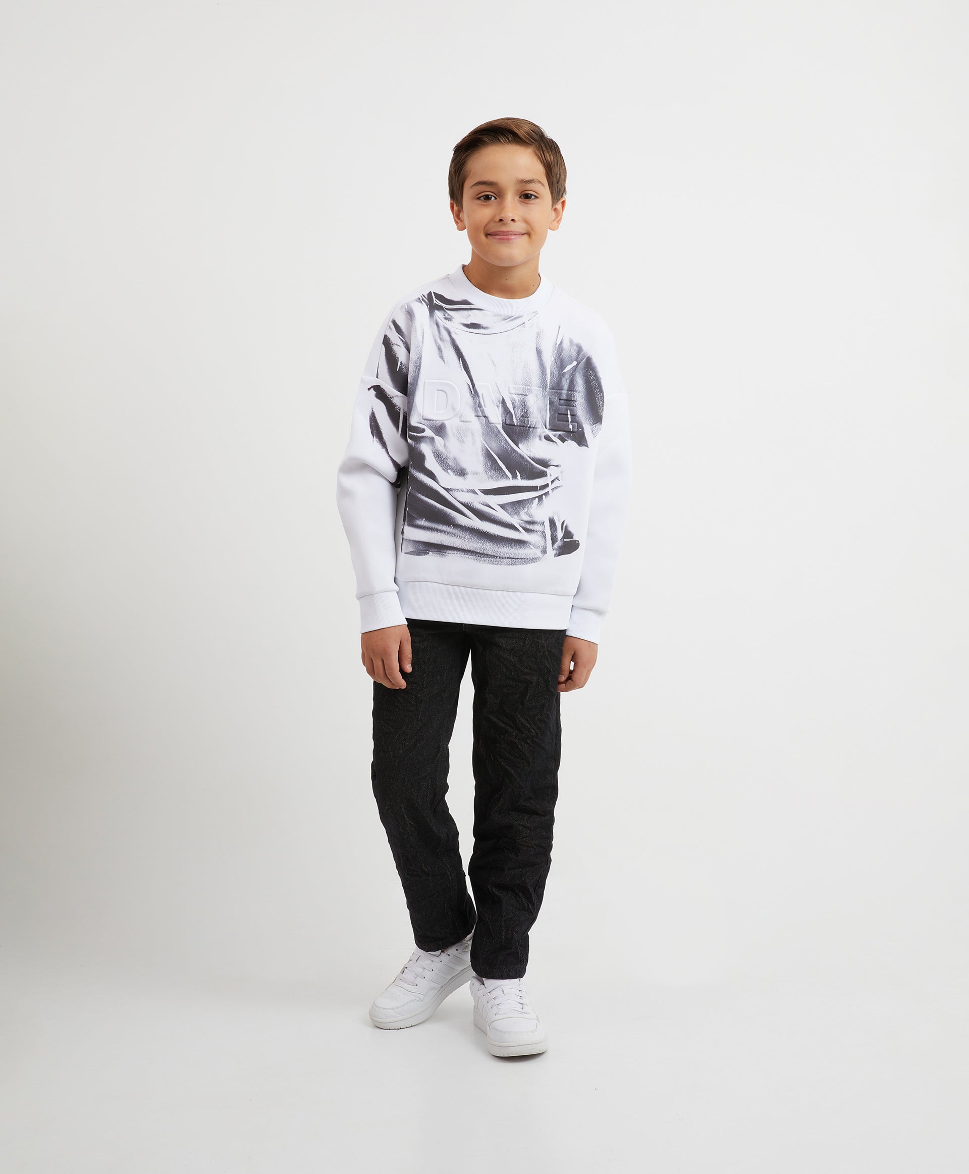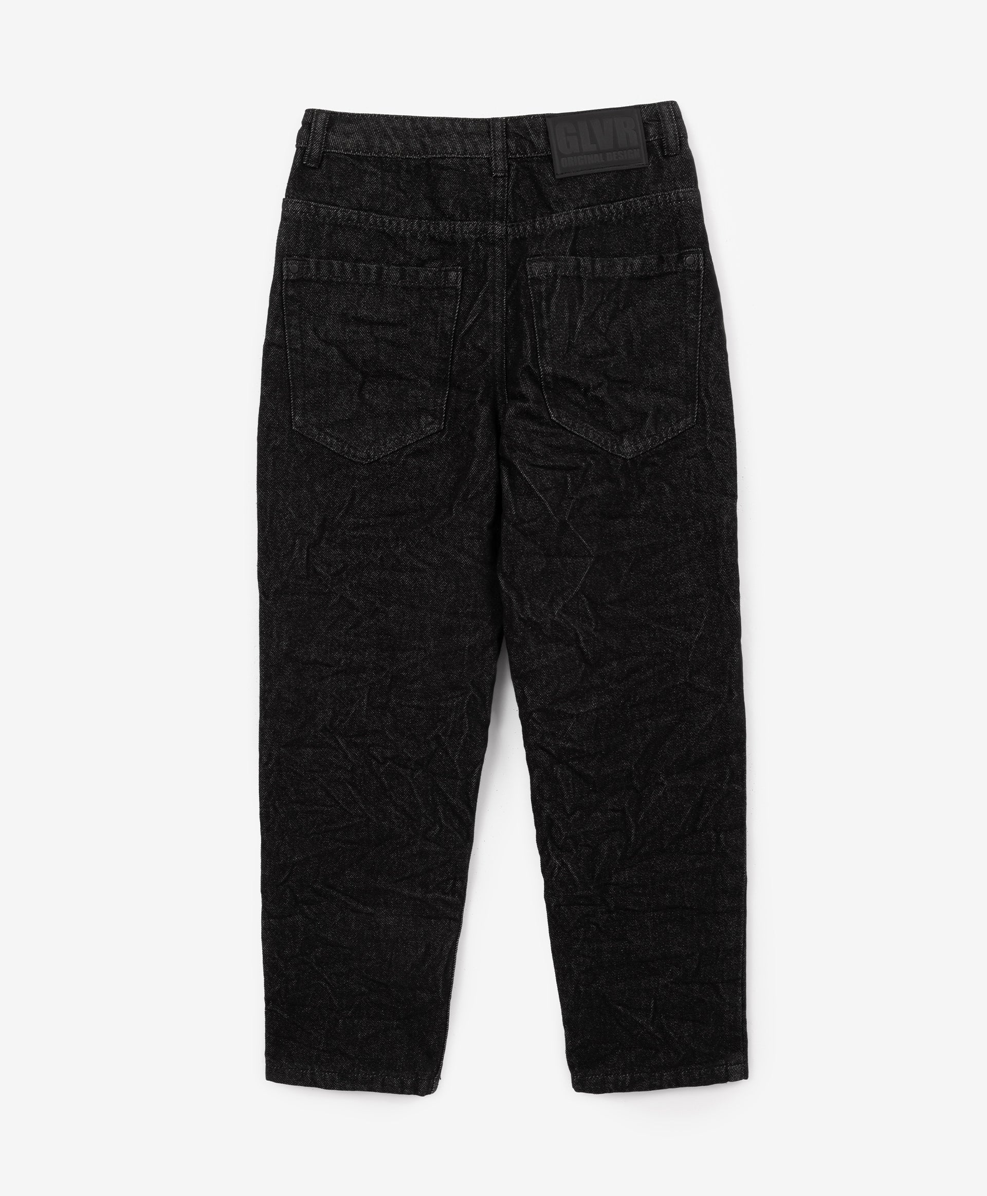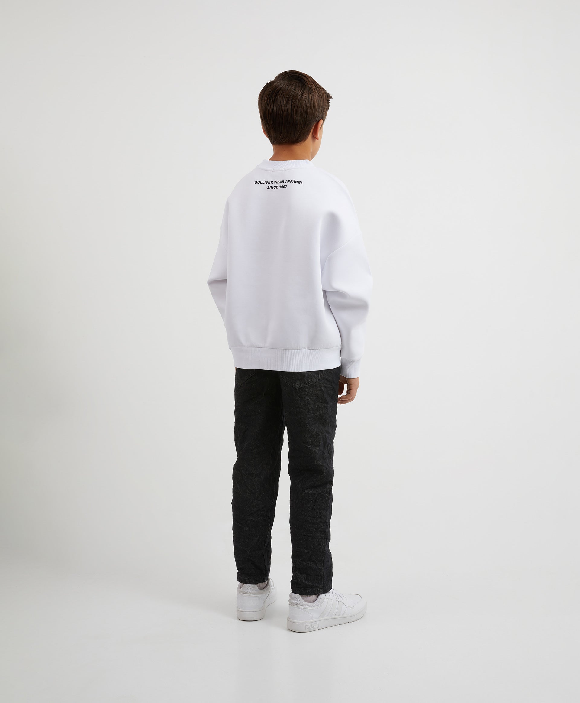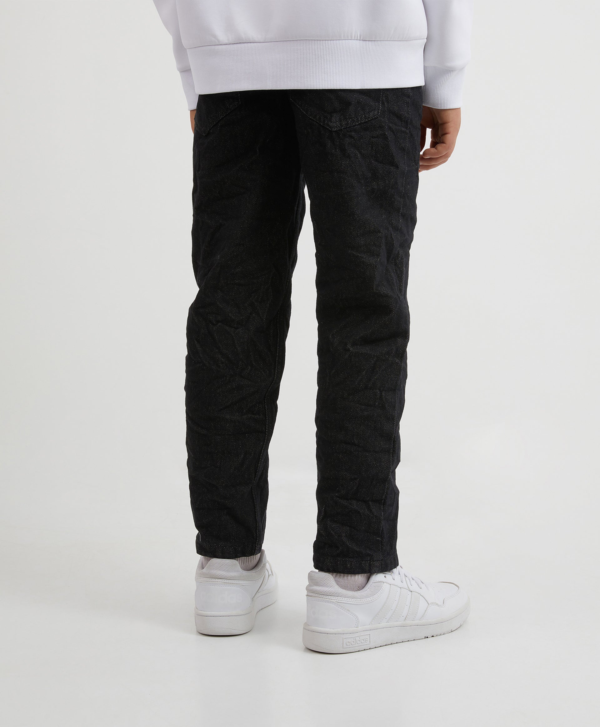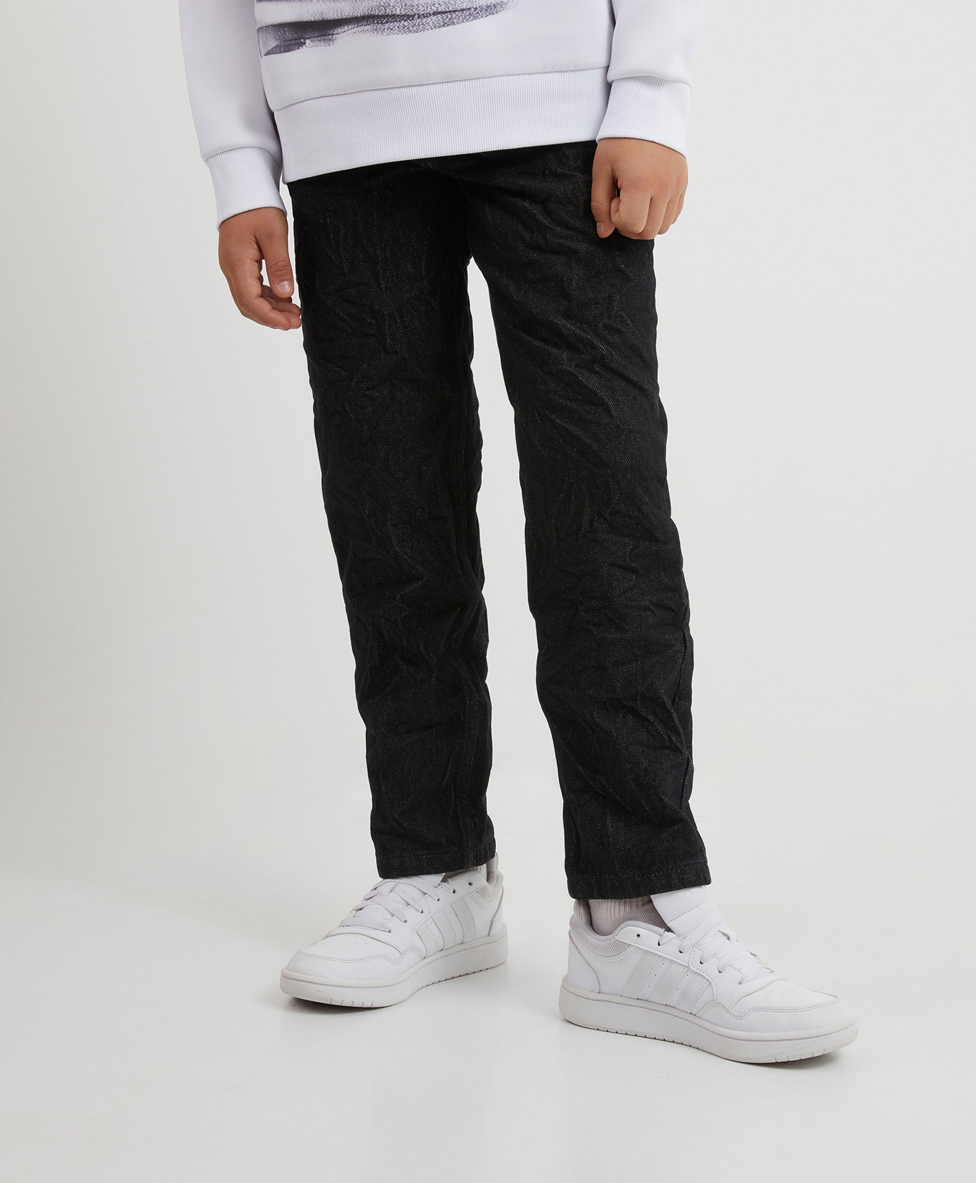 A trendy pair of black straight-fit jeans for boys from Gulliver, featuring a stylish crinkle effect. Made from high-quality cotton with a touch of elastane for comfort, stretch, and durability. Features classic five-pocket styling with a button and zip closure. Perfect for school, casual outings, or everyday wear. The fabric retains its shape, color, and softness after multiple washes.