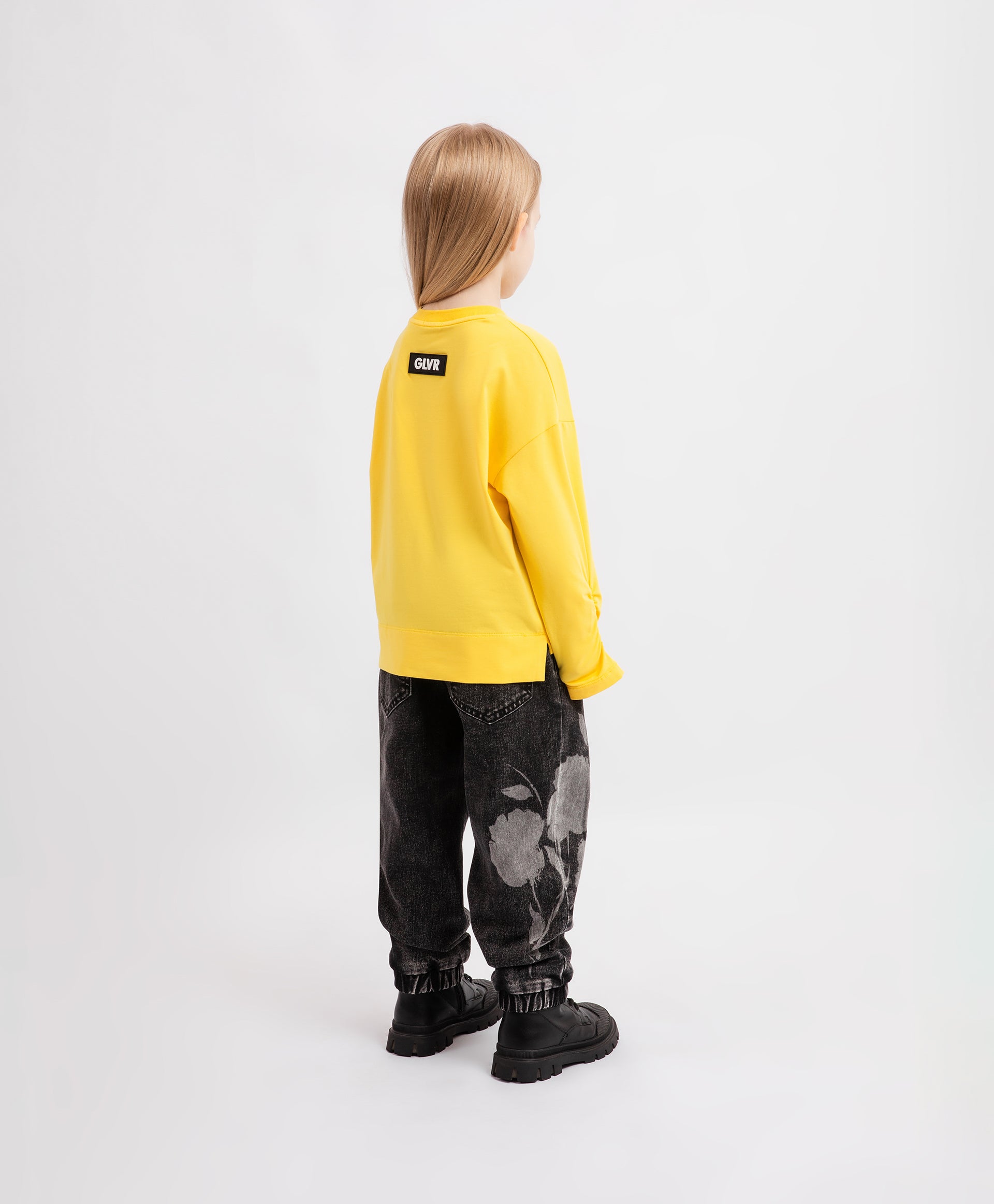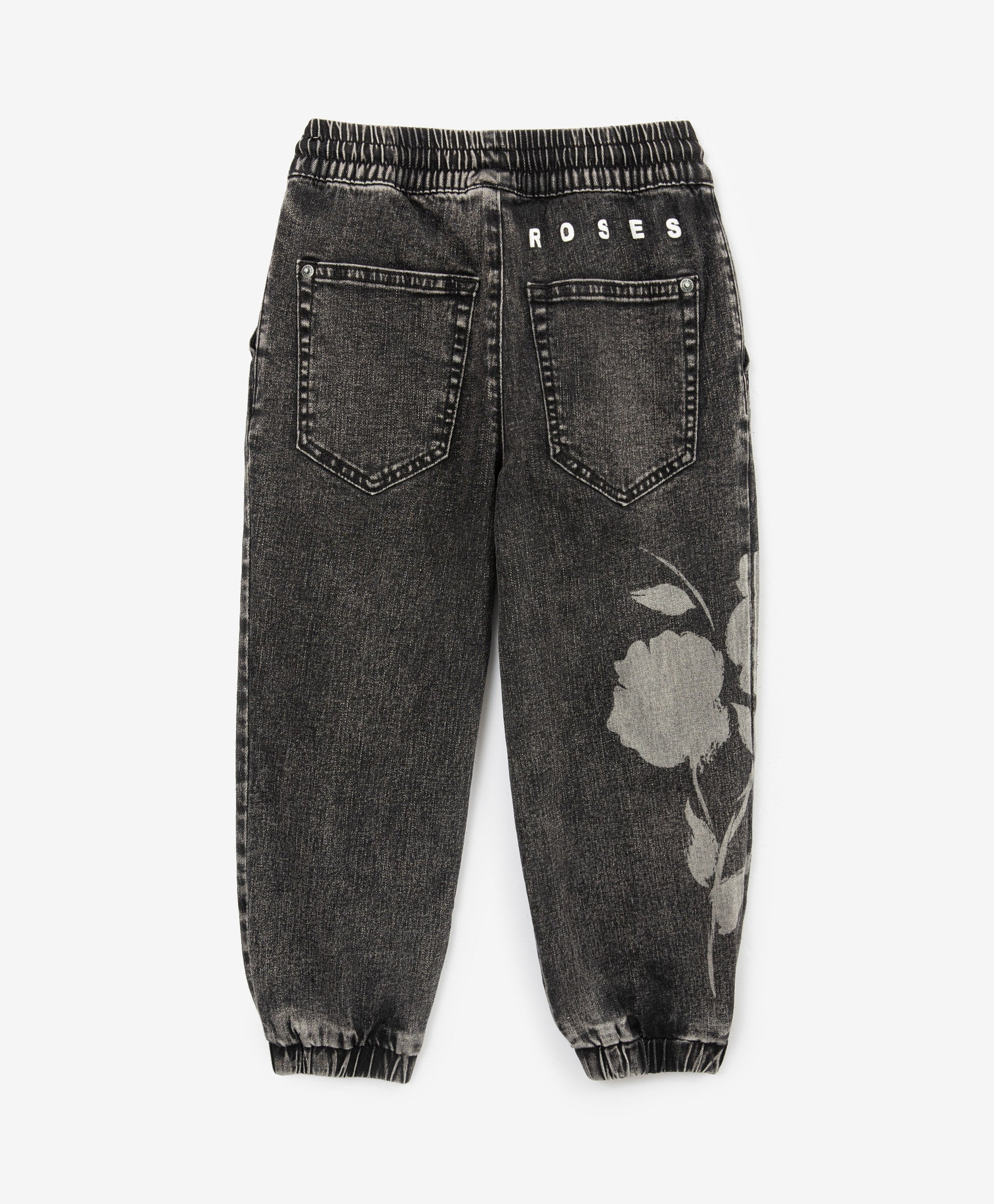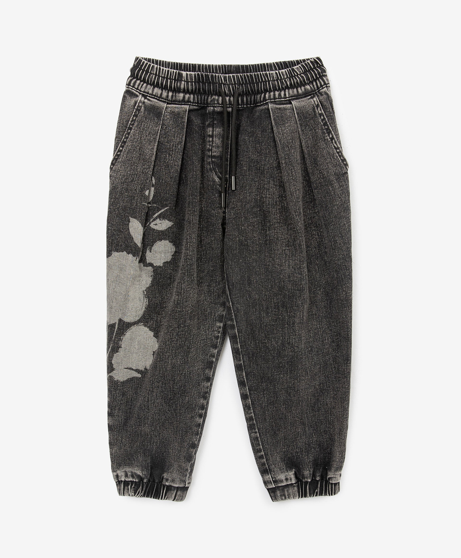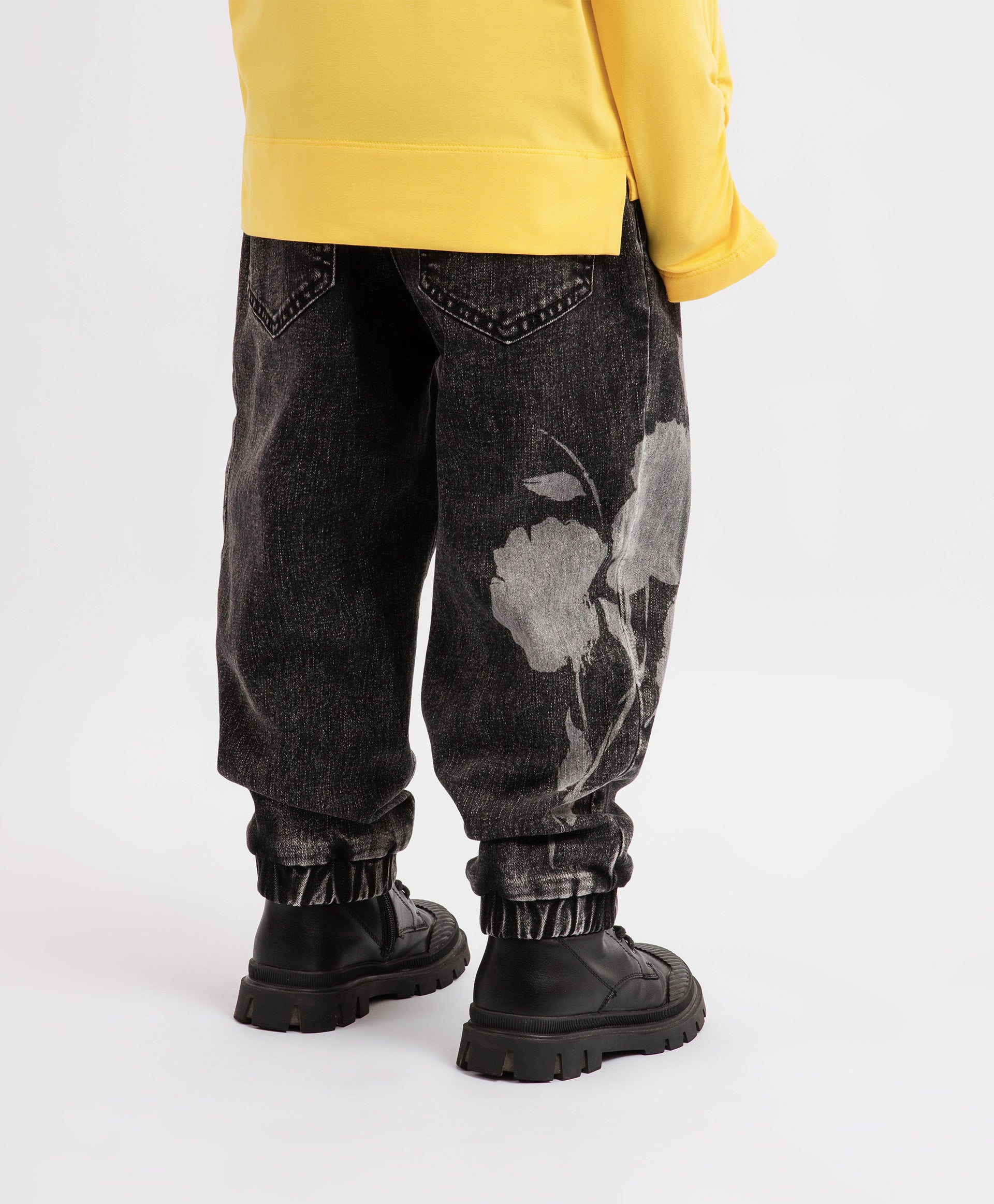 These grey denim jogger pants with an elastic waistband and cuffs are perfect for girls’ autumn outfits. Made from soft cotton denim with washes and distressing, they emphasize a sporty, dynamic style while remaining practical and functional for everyday wear. The faded floral print adds a playful, unique design element, setting these joggers apart from plain alternatives. Features four functional pockets for convenience.
