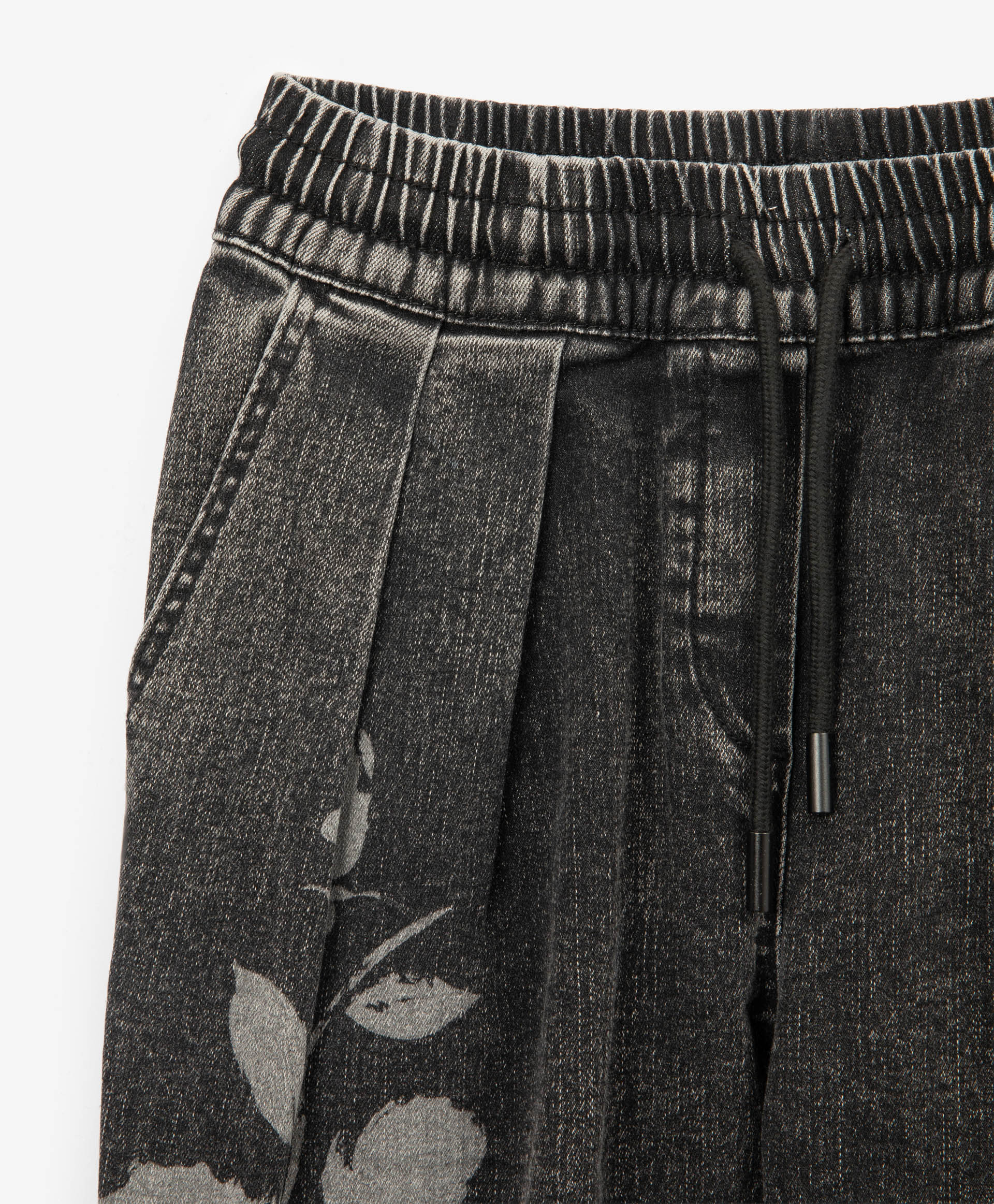 Design: Denim jogger pants, elastic waistband and cuffs, faded floral print, four pockets