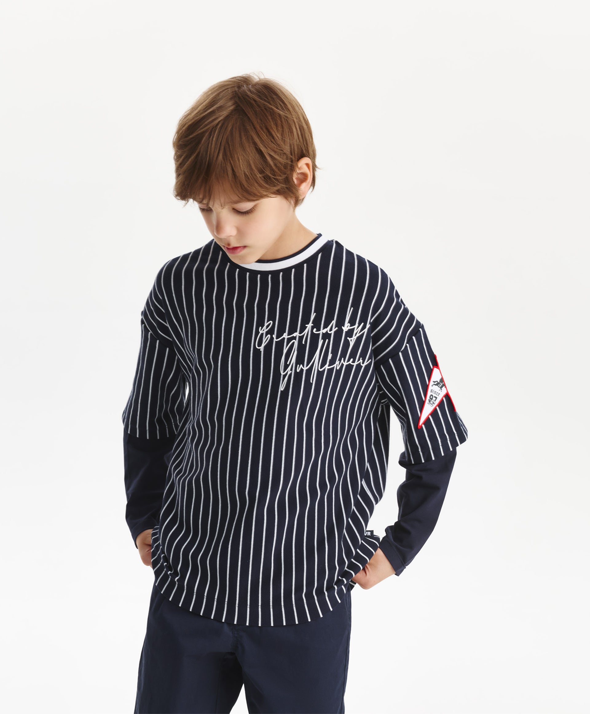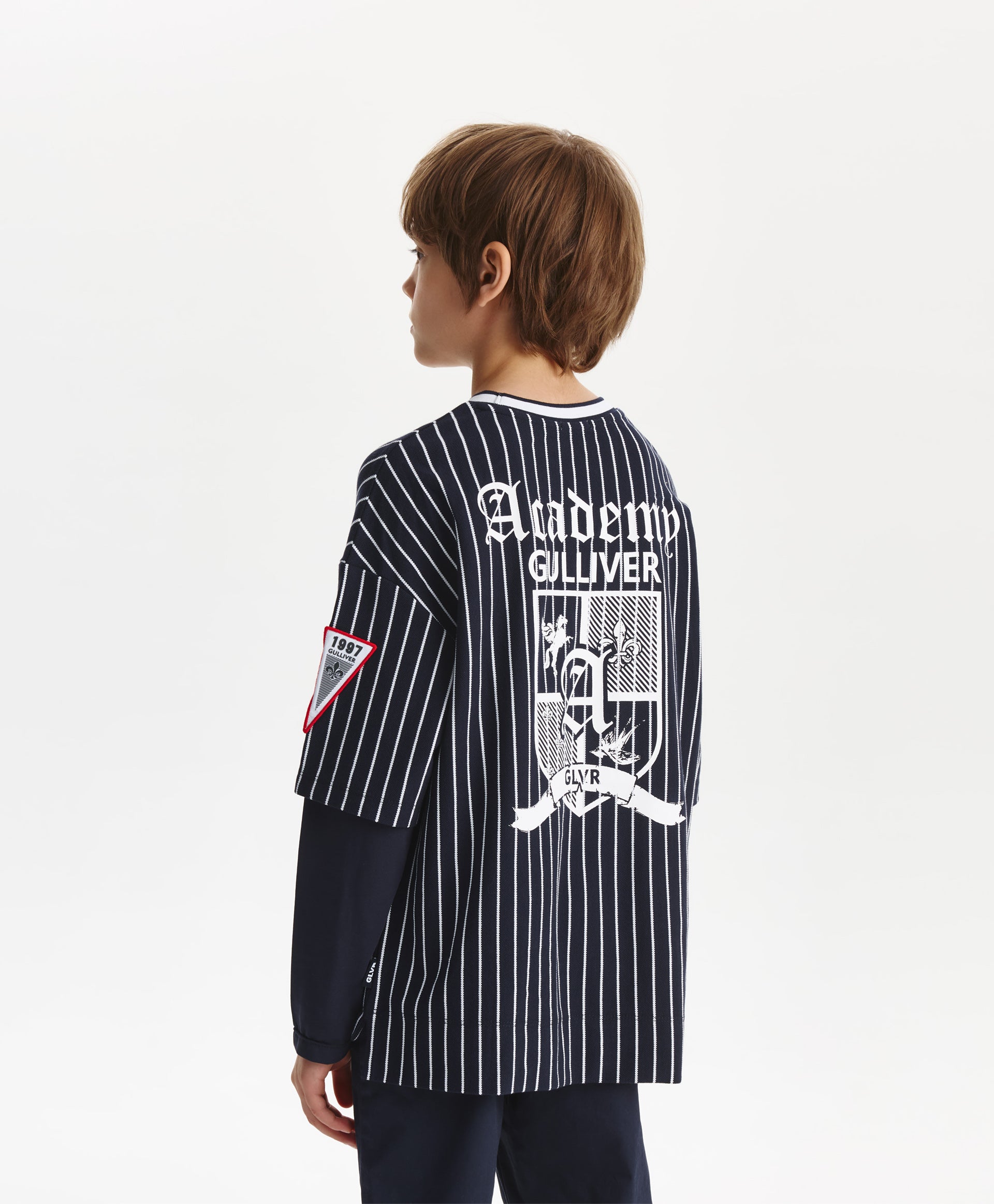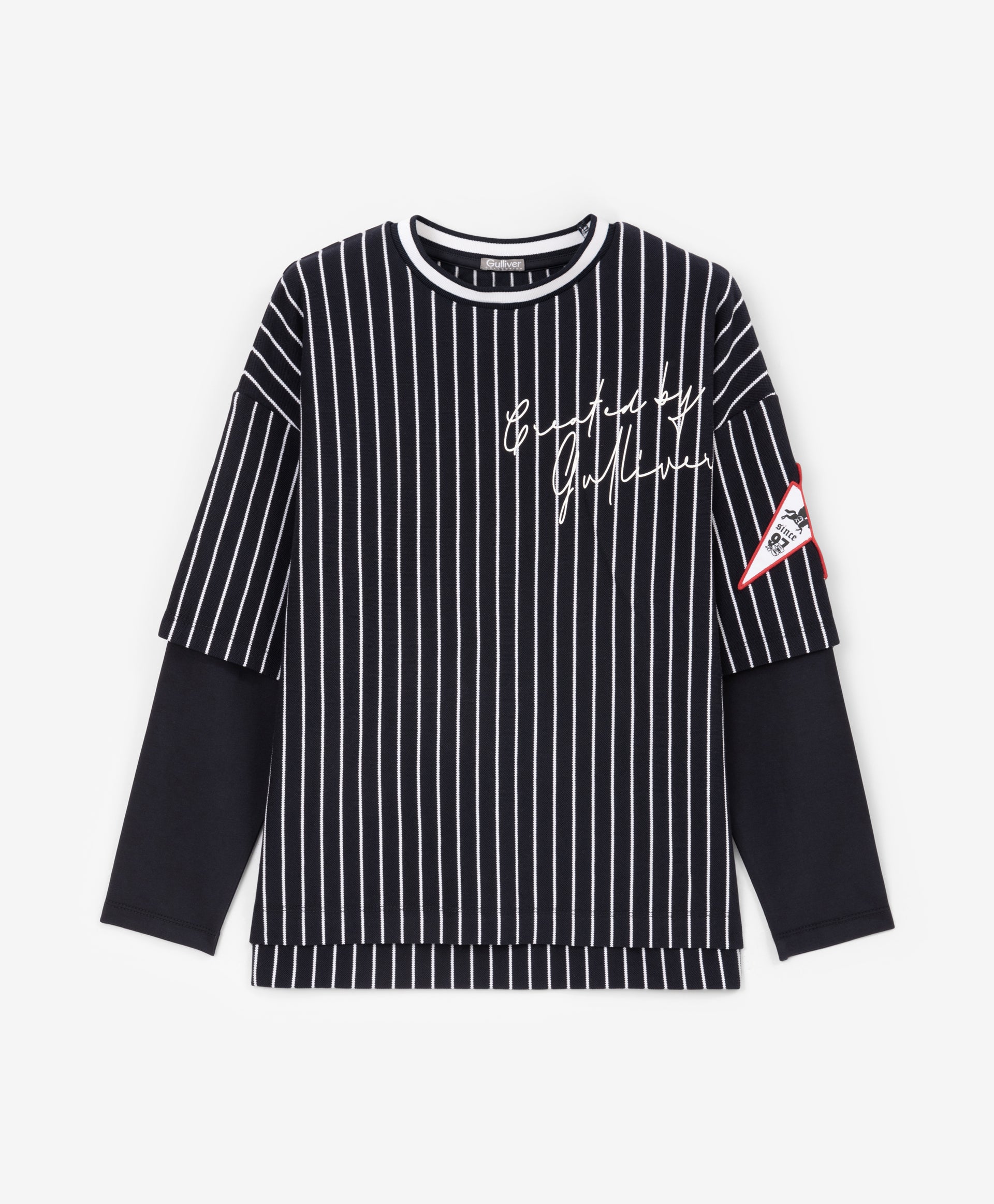 A trendy oversized long sleeve top for boys from Gulliver, featuring blue stripes for a stylish casual look. Made from soft cotton blend with a touch of elastane for comfort and stretch. The relaxed oversized fit allows freedom of movement, making it ideal for school, casual outings, or layering over T-shirts. Durable fabric maintains its color, shape, and softness after multiple washes. Perfect for spring and autumn wear.