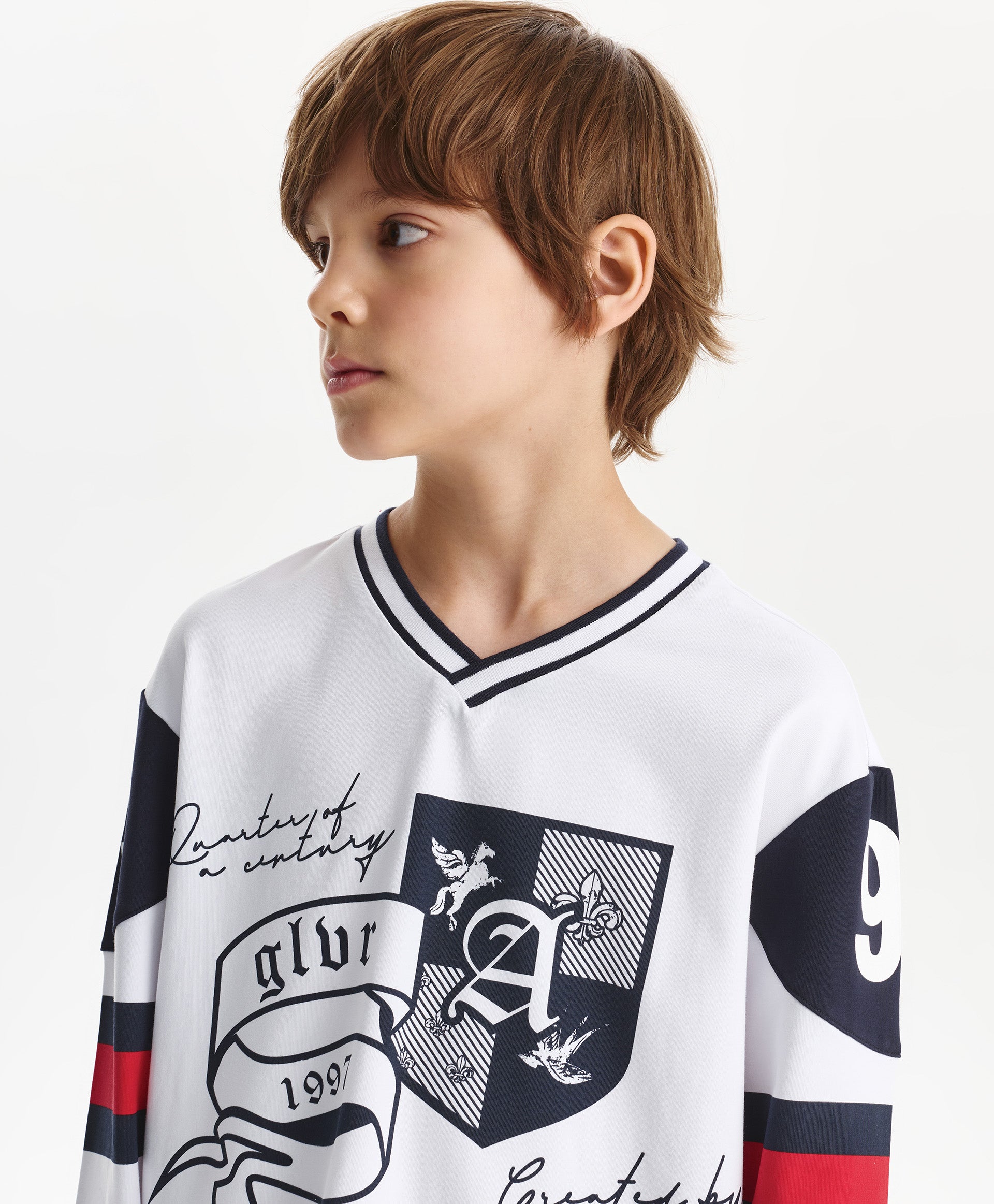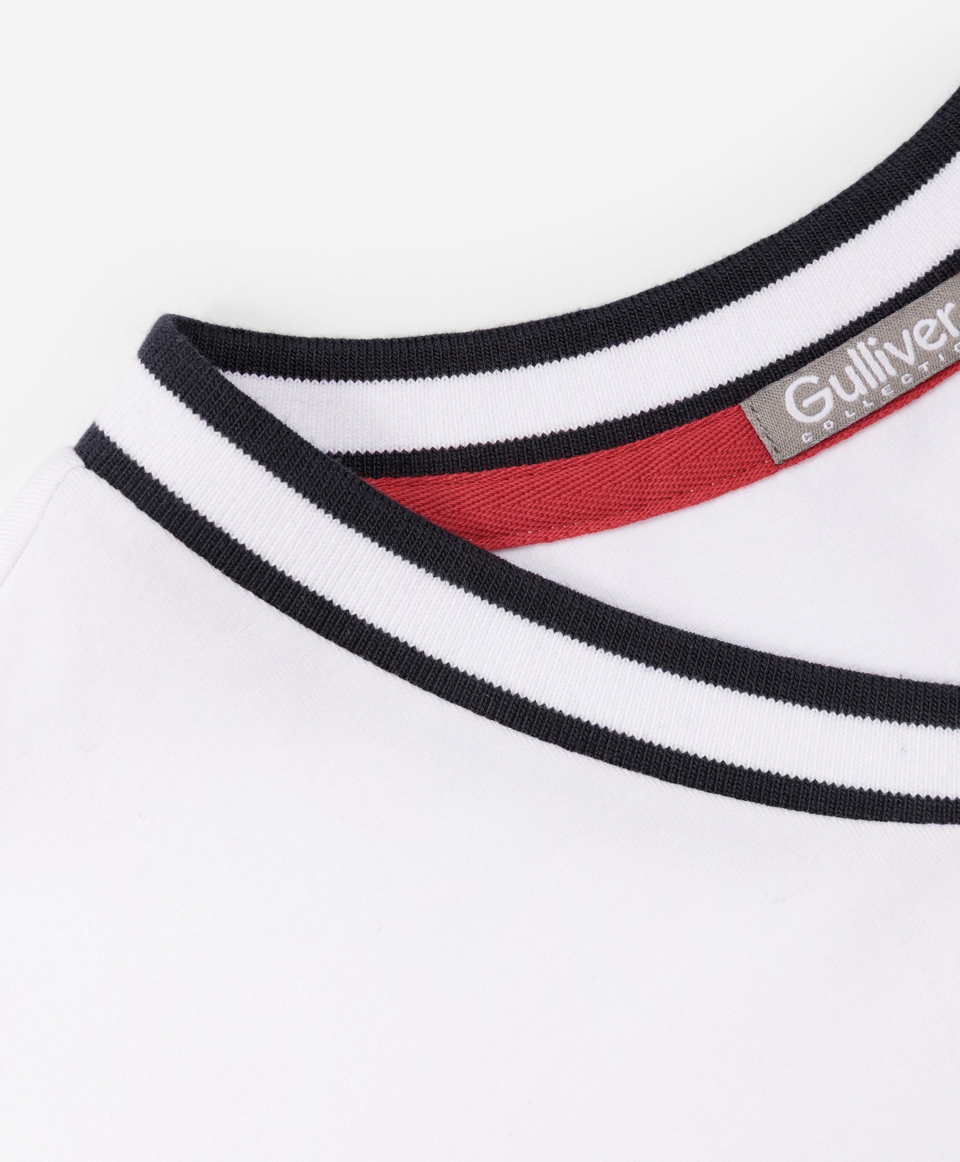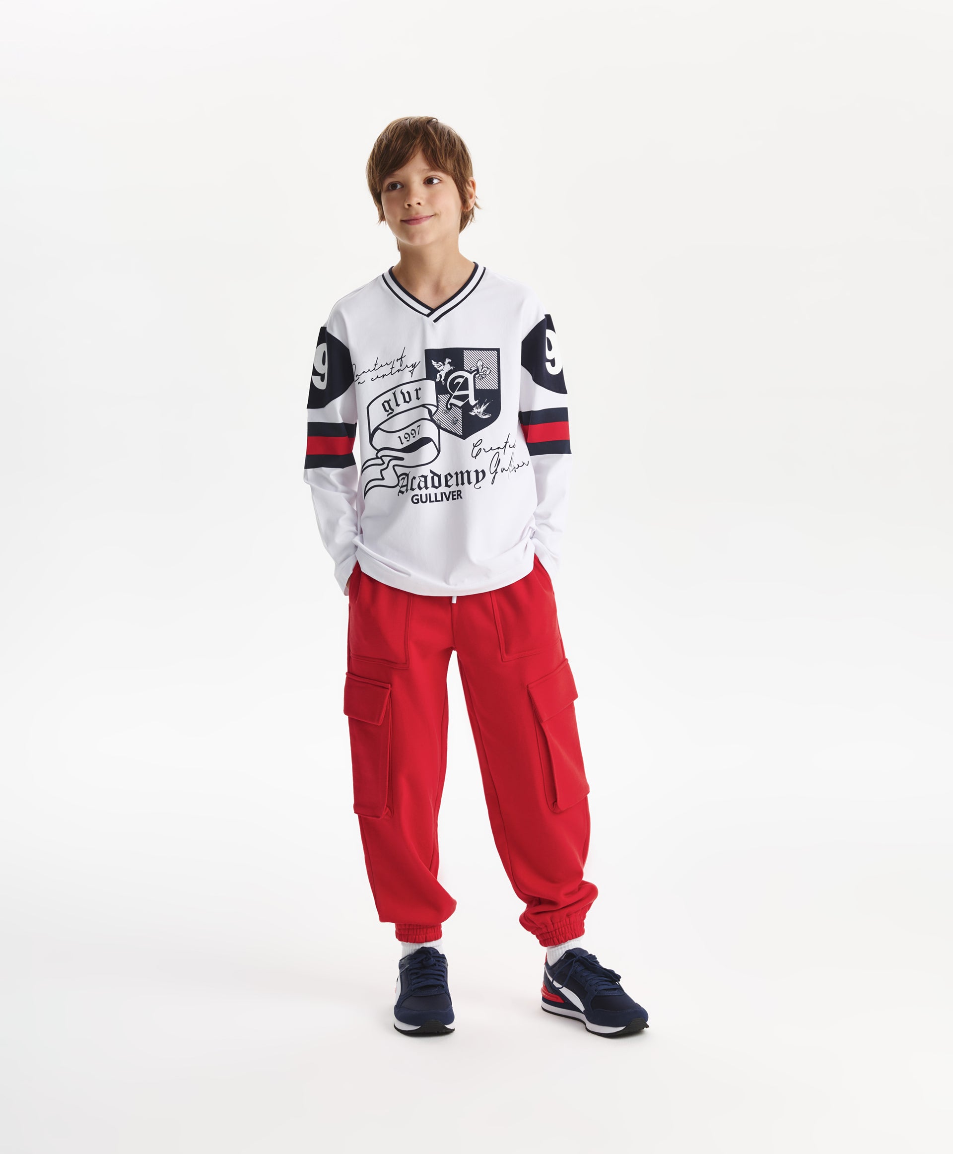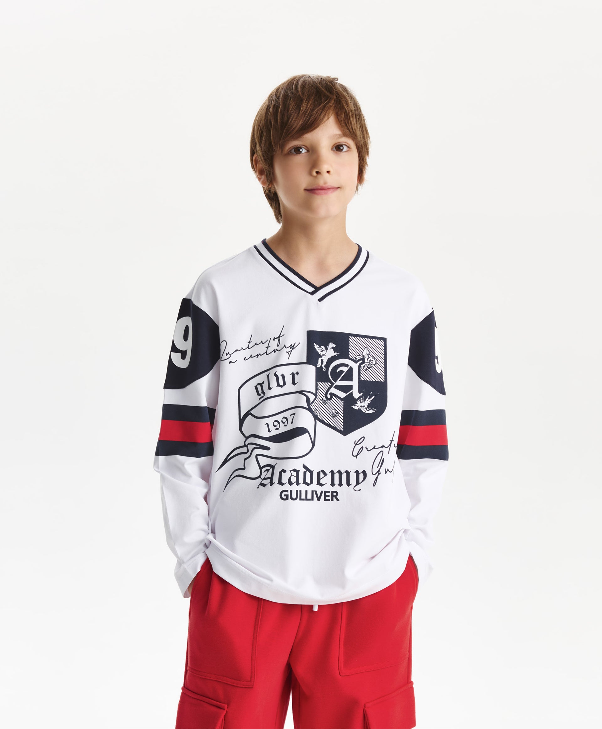 A classic white V-neck long sleeve top for boys from Gulliver, made from soft cotton blend with a touch of elastane for comfort and stretch. Features a neat V-neckline and a relaxed fit, perfect for layering under jackets or wearing alone. Ideal for school, casual outings, or everyday wear. Durable fabric maintains its shape, softness, and color after multiple washes. Suitable for spring and autumn seasons.
