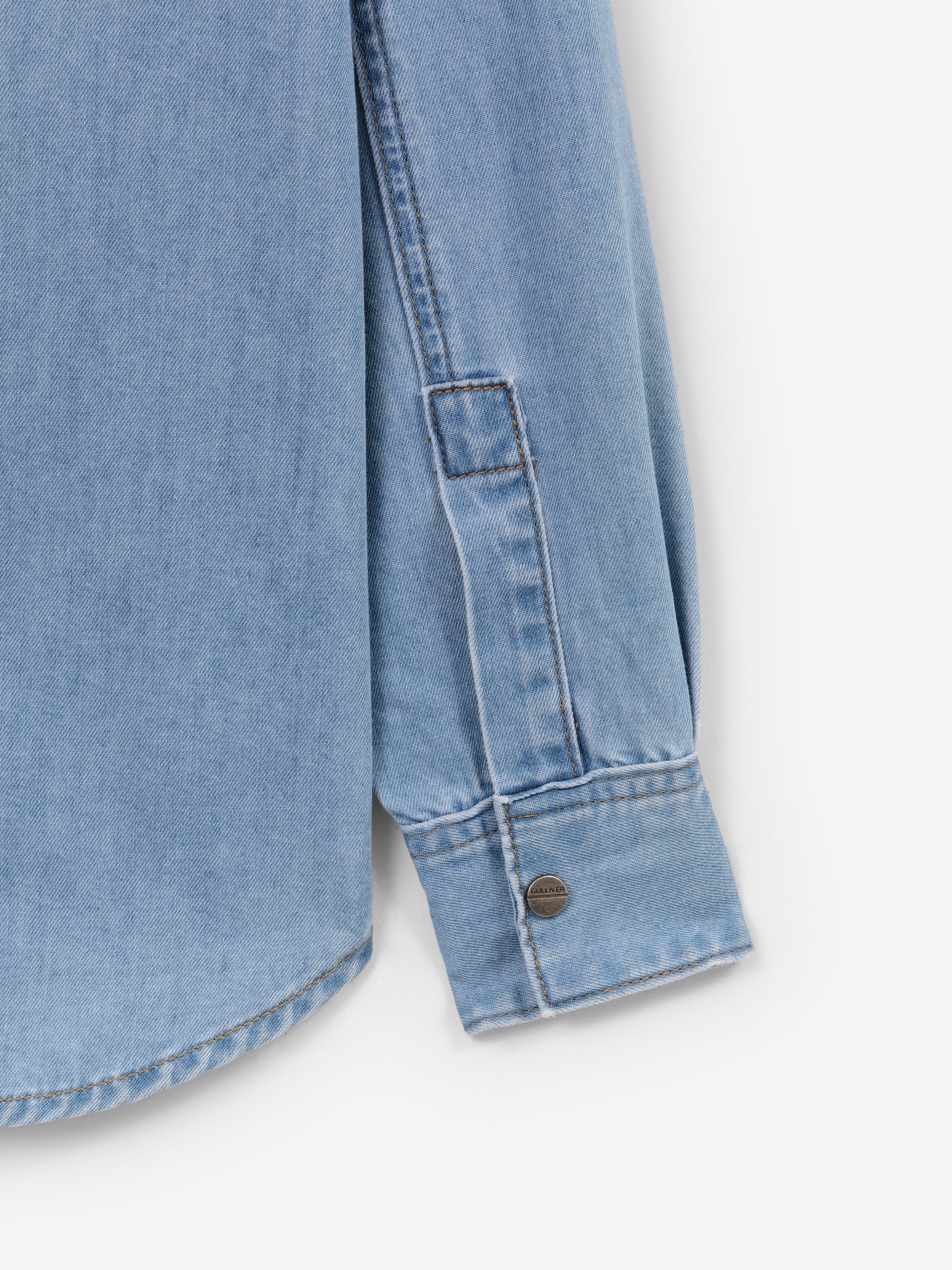 • Design: Long sleeves, button-up front, chest pockets, classic denim shirt