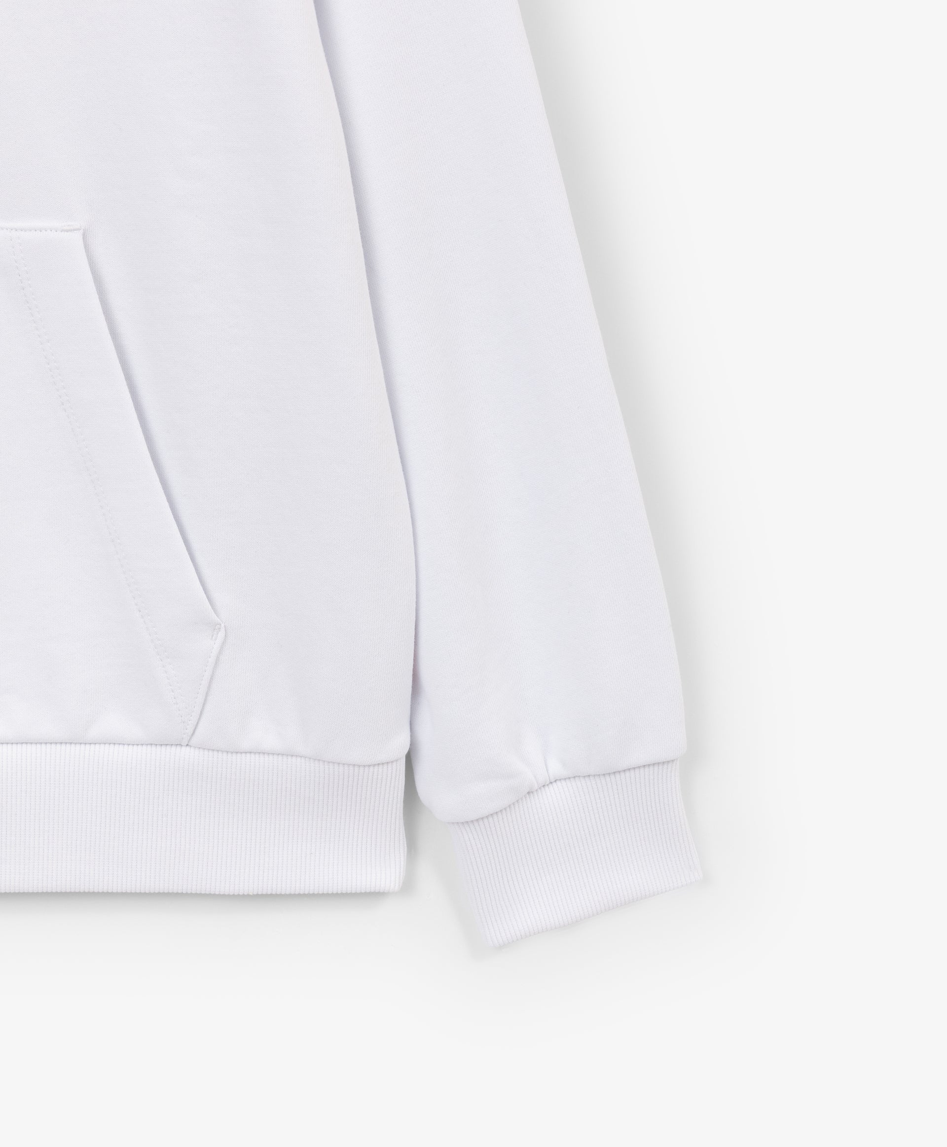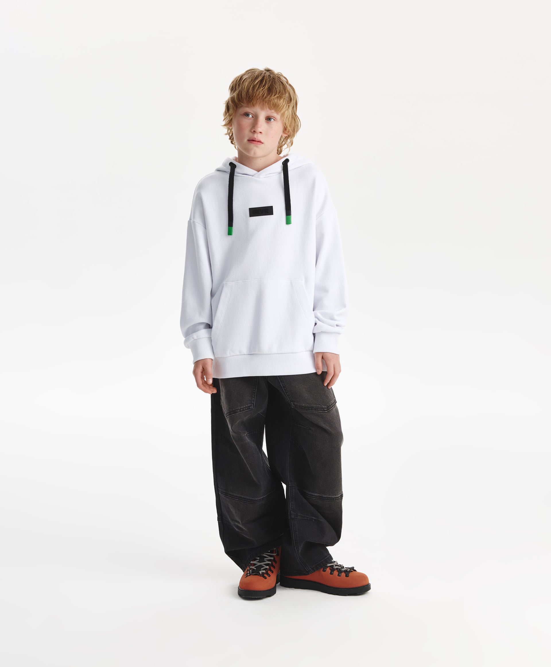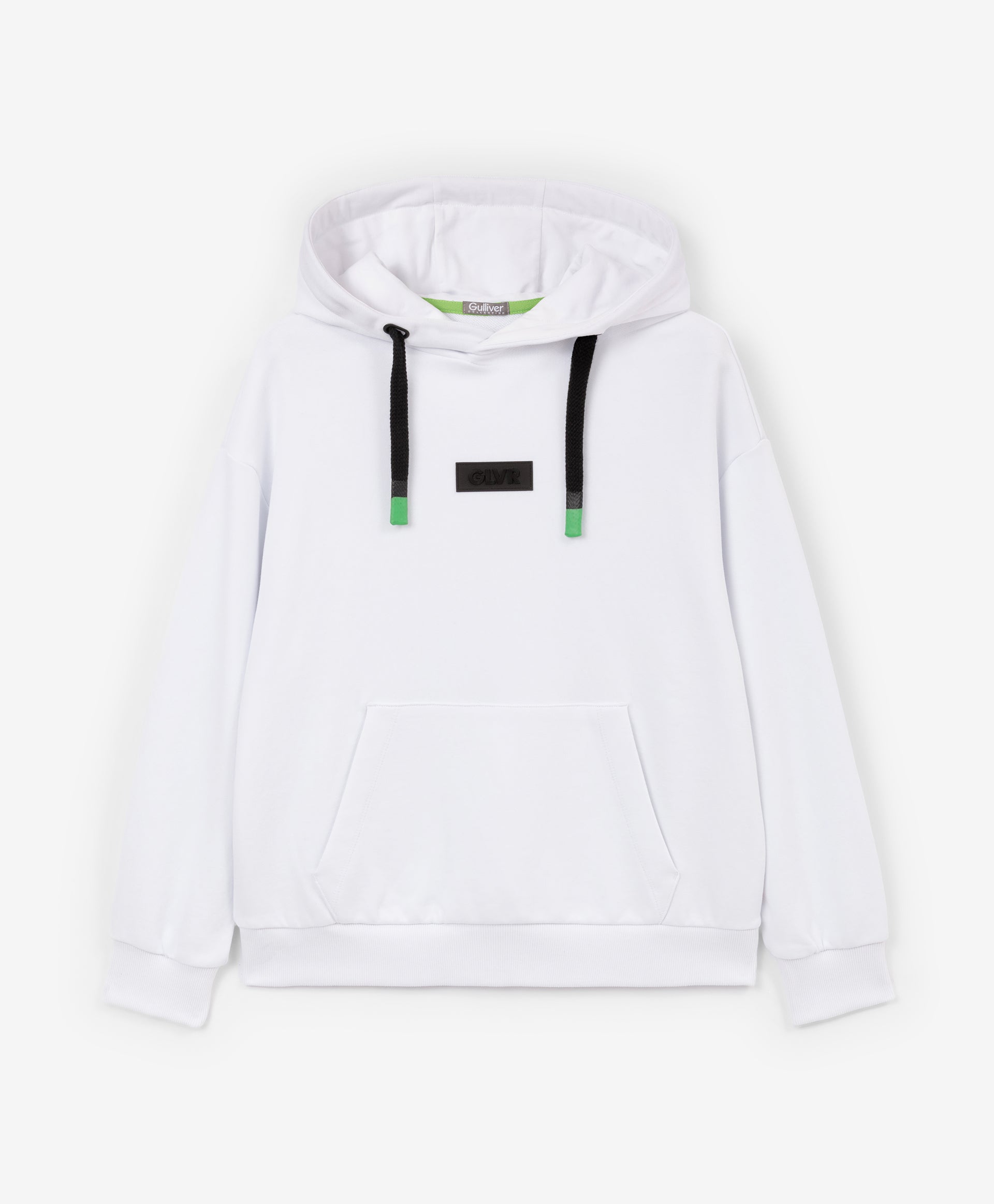 A stylish white hoodie for boys from Gulliver, featuring contrast trim details on the cuffs, hem, and hood. Made from soft brushed cotton fabric (fleece) for warmth, comfort, and durability. Features a front kangaroo pocket and a relaxed fit for freedom of movement. Ideal for school, casual outings, or layering. The fabric retains its shape, softness, and color after multiple washes. Perfect for autumn and winter.