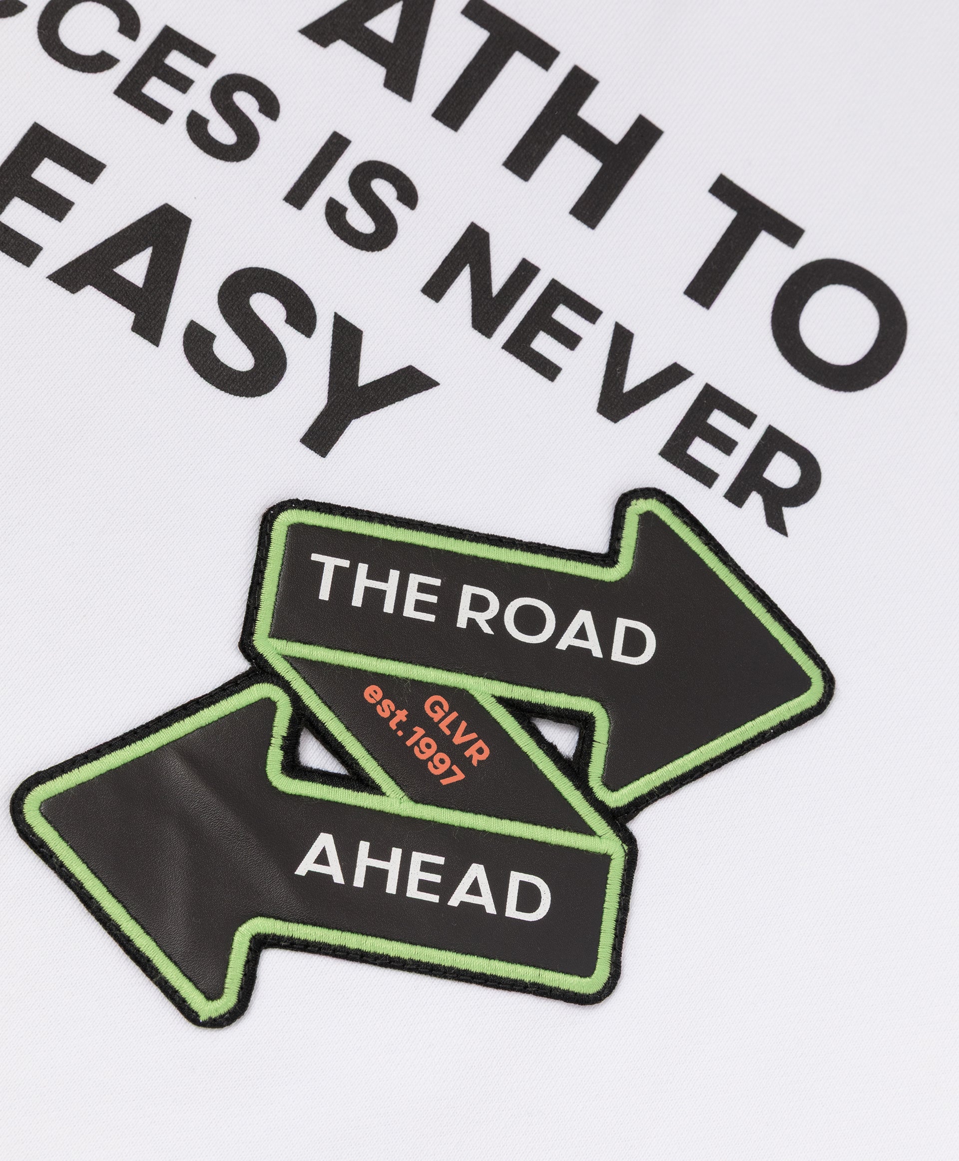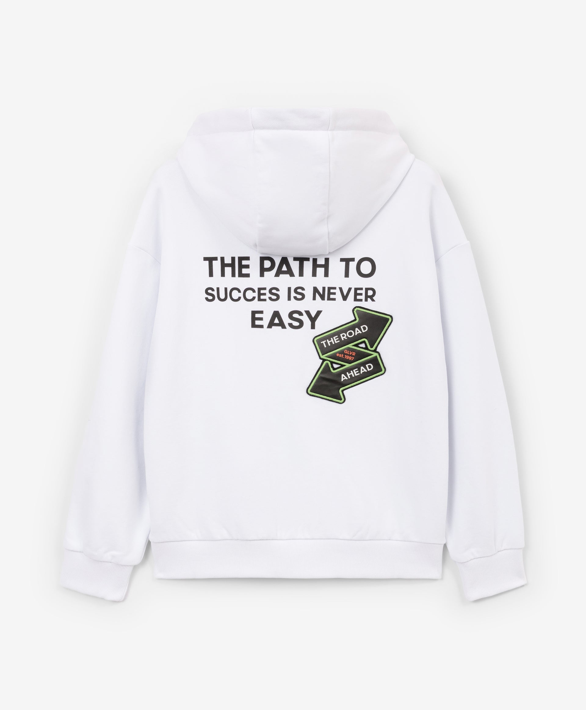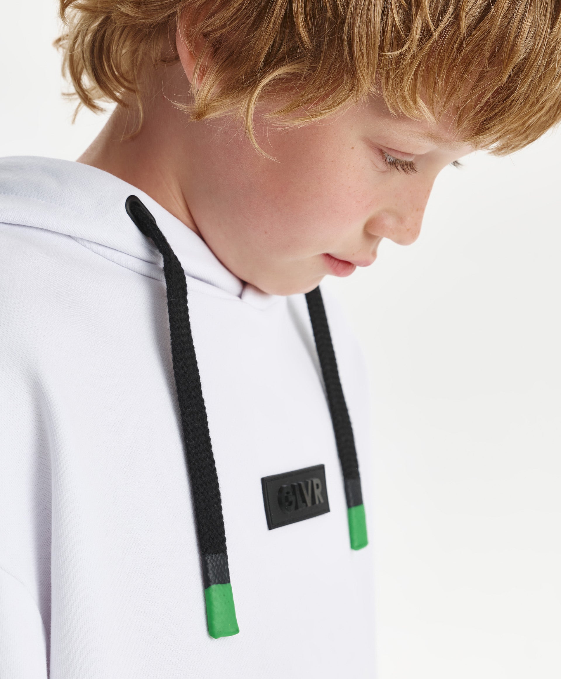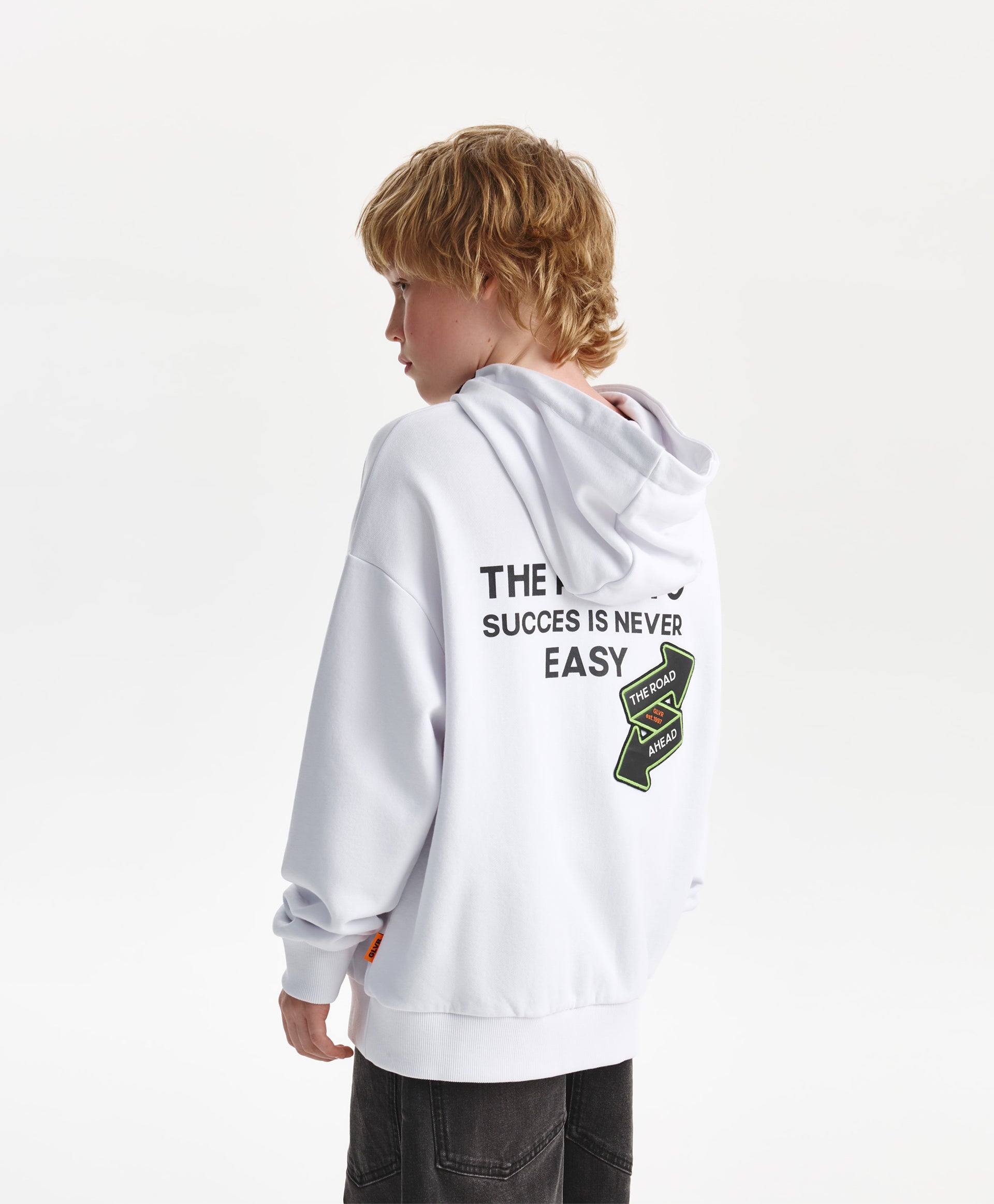 A stylish white hoodie for boys from Gulliver, featuring contrast trim details on the cuffs, hem, and hood. Made from soft brushed cotton fabric (fleece) for warmth, comfort, and durability. Features a front kangaroo pocket and a relaxed fit for freedom of movement. Ideal for school, casual outings, or layering. The fabric retains its shape, softness, and color after multiple washes. Perfect for autumn and winter.