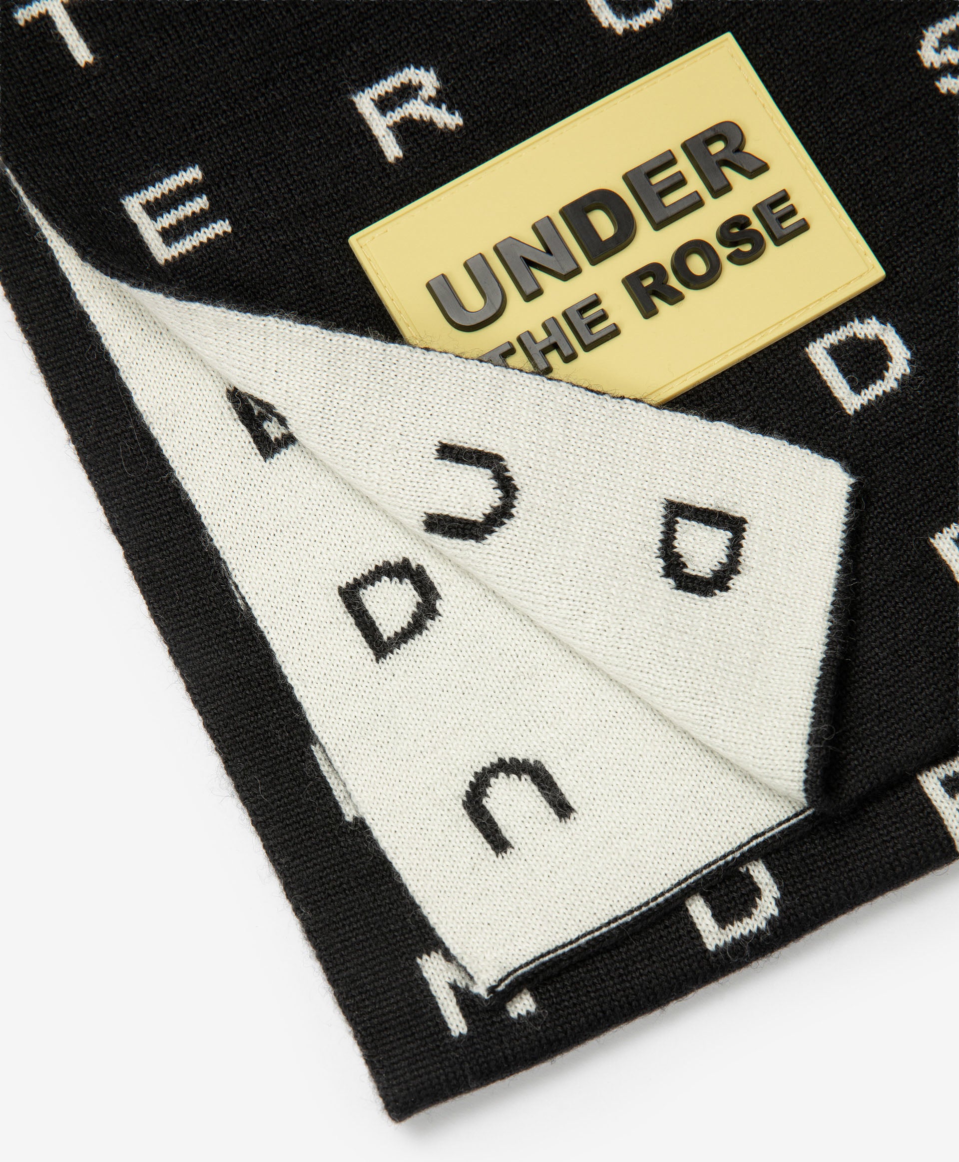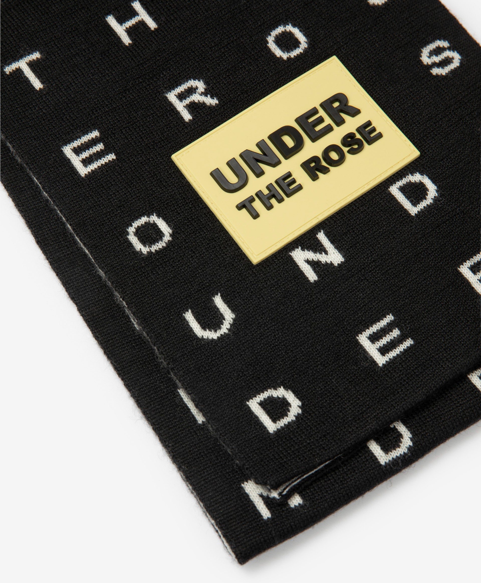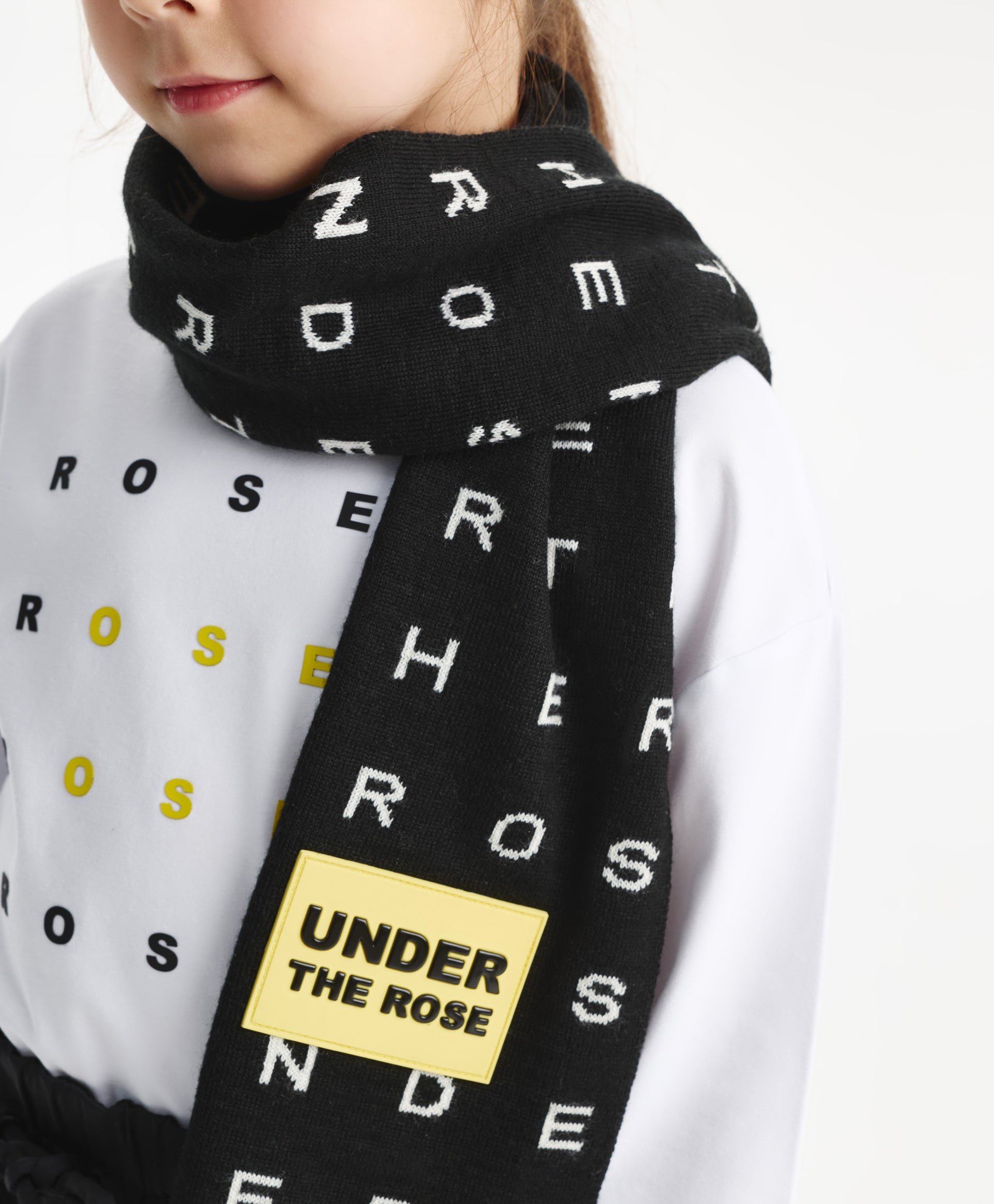 This black knitted scarf, made from soft wool-acrylic blend yarn, is an essential accessory for girls’ autumn-winter walks. The design features a black-and-white graphic in a jacquard weave, with small text elements and a bright accent patch, making the scarf stylish, fresh, and visually interesting.
