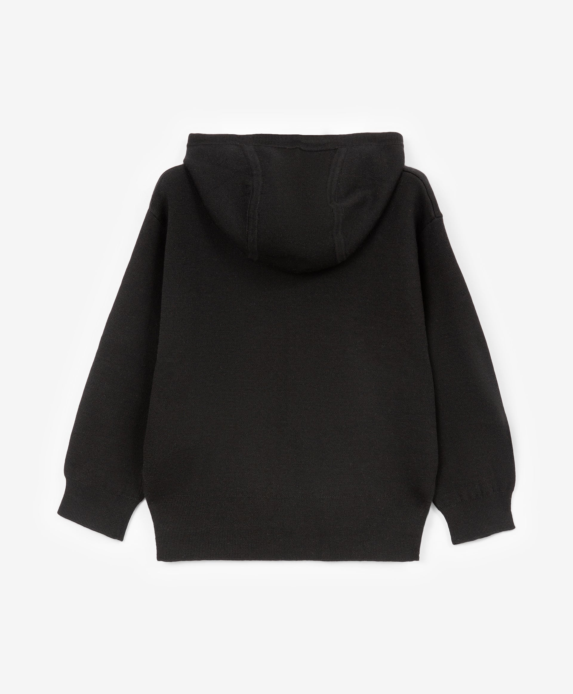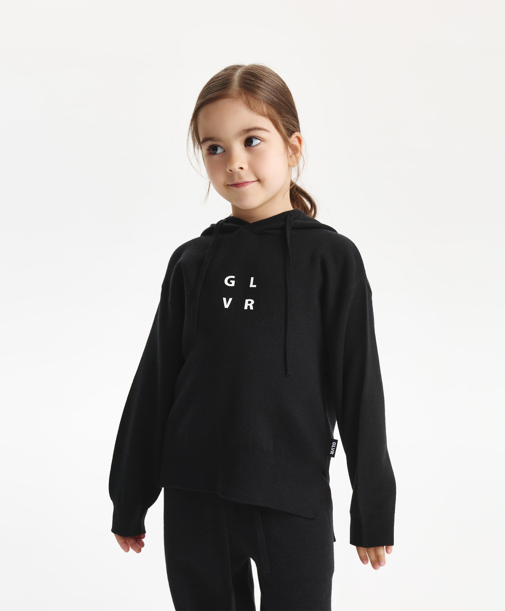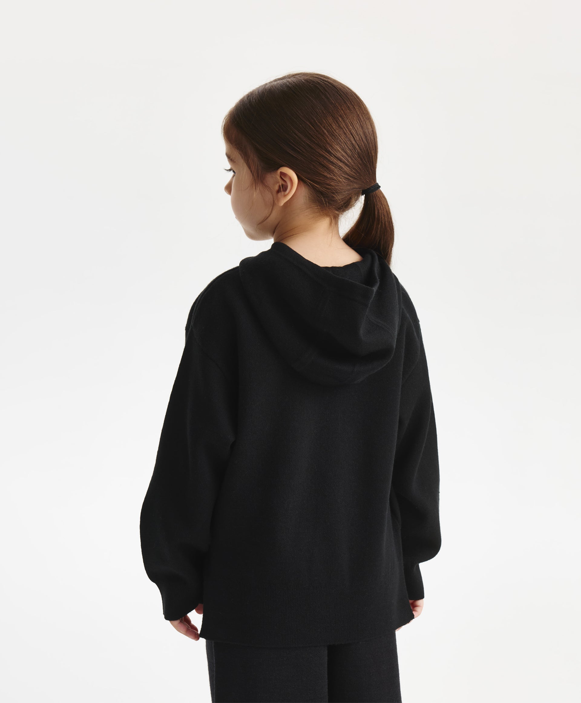 Stylish black knitted hoodie for girls in a moderate oversized silhouette. Made from a soft wool-acrylic blend, it offers warmth, comfort, and a pleasant tactile feel. The elongated back and high side slits add a modern touch, creating a relaxed casual look. A cozy hood with adjustable cords provides extra comfort and protection from chilly weather. Minimalist text decoration on the front adds a subtle stylish accent. Perfect for creating laid-back fall and winter outfits.
