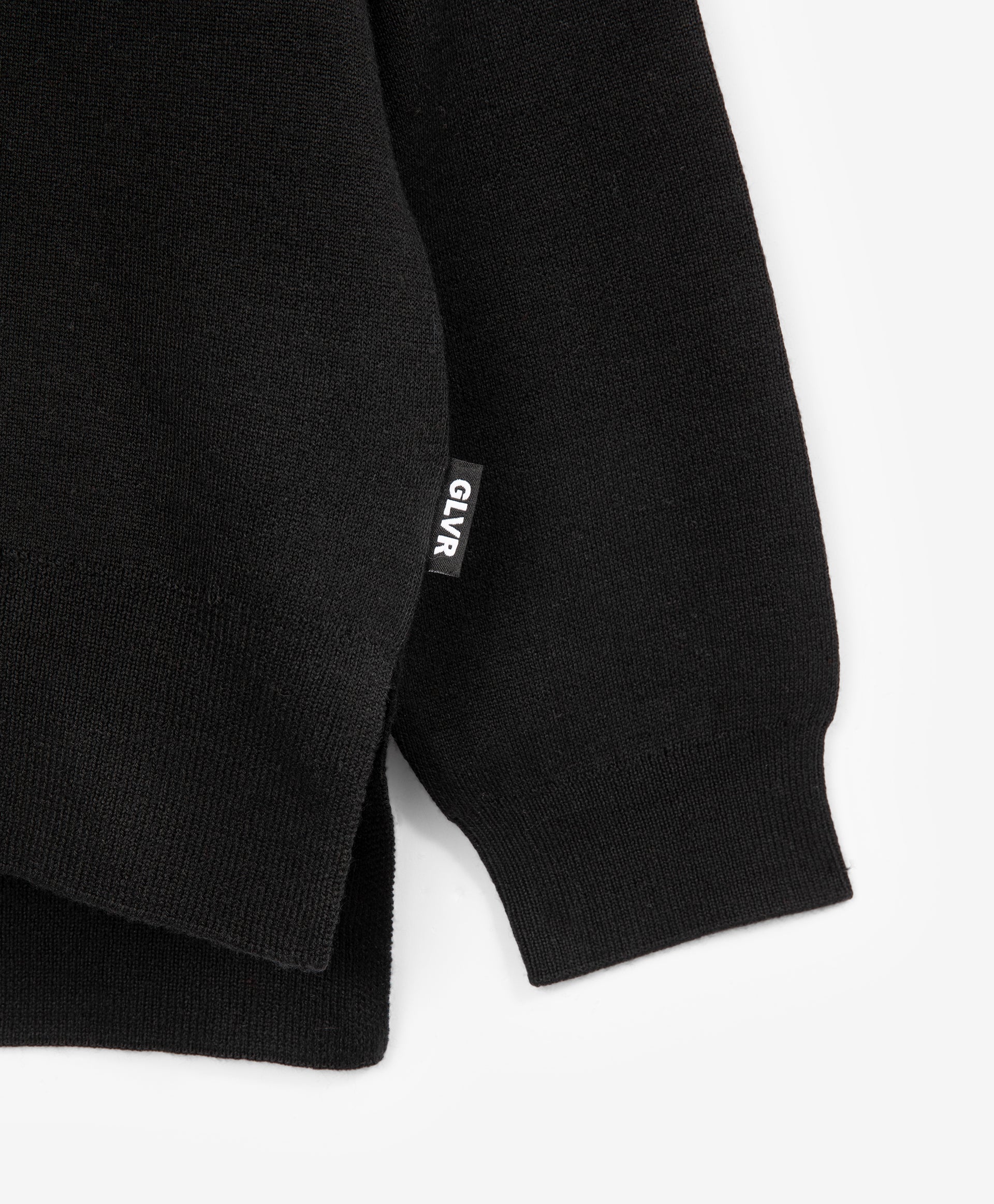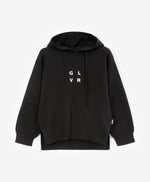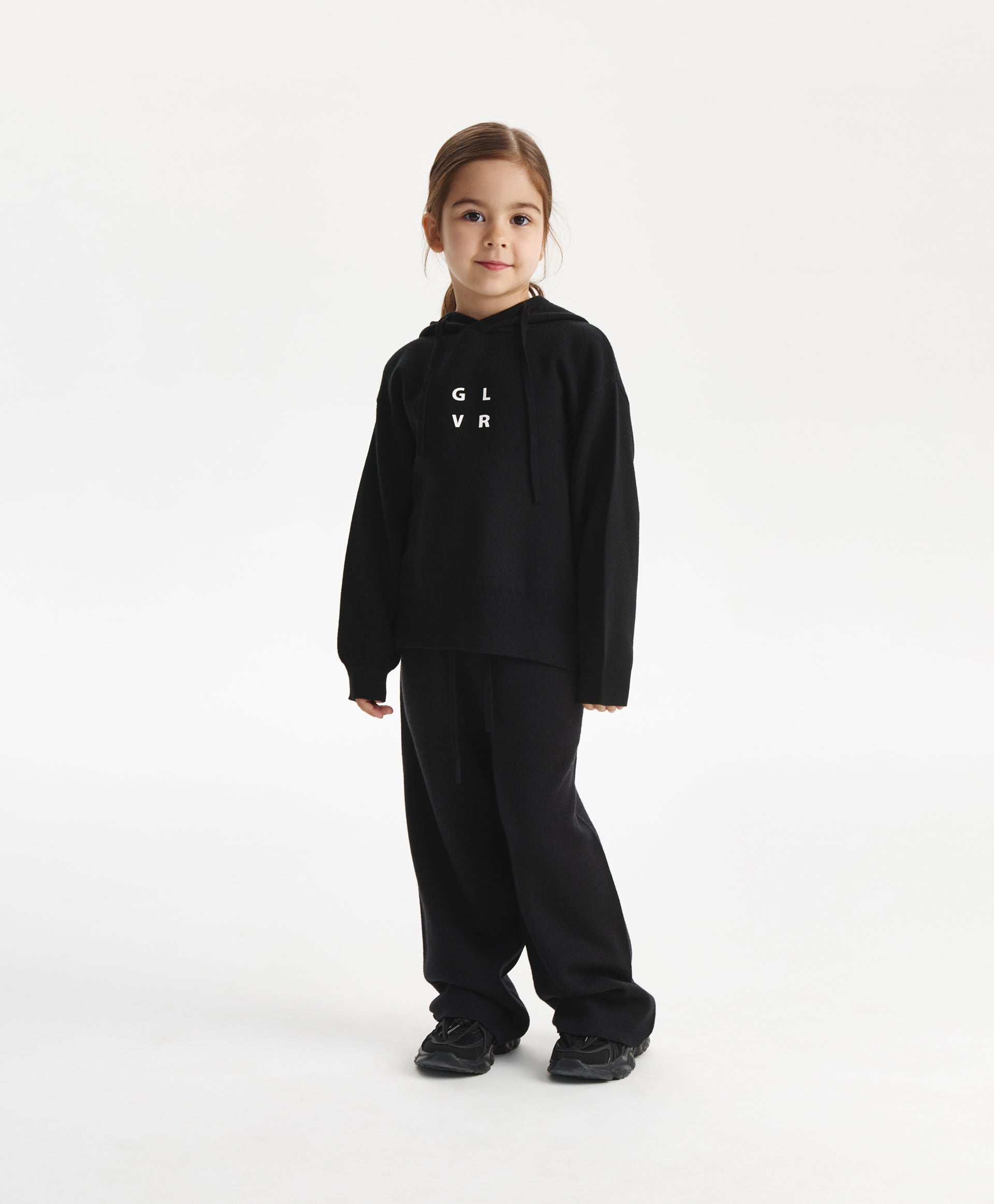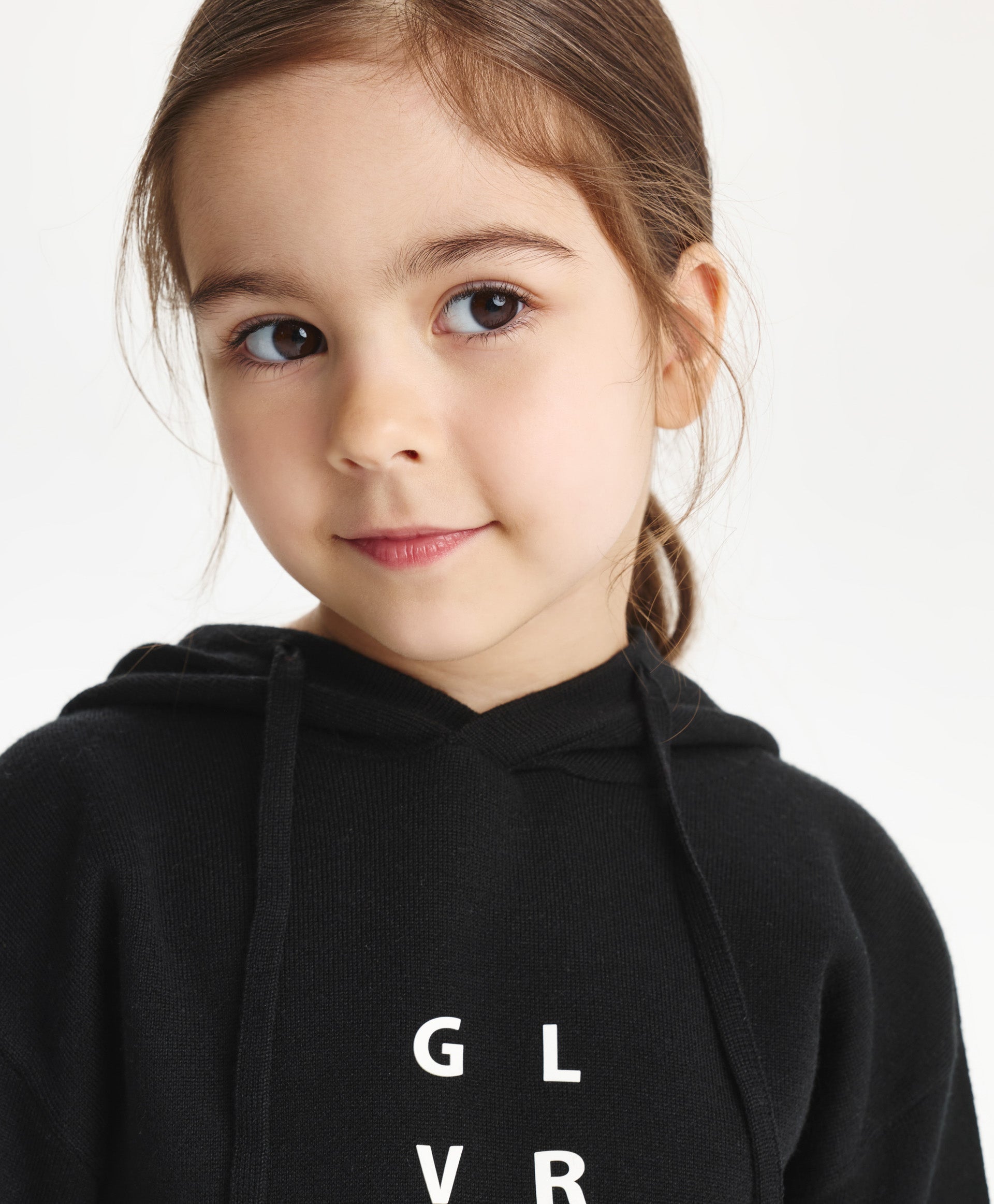 Stylish black knitted hoodie for girls in a moderate oversized silhouette. Made from a soft wool-acrylic blend, it offers warmth, comfort, and a pleasant tactile feel. The elongated back and high side slits add a modern touch, creating a relaxed casual look. A cozy hood with adjustable cords provides extra comfort and protection from chilly weather. Minimalist text decoration on the front adds a subtle stylish accent. Perfect for creating laid-back fall and winter outfits.