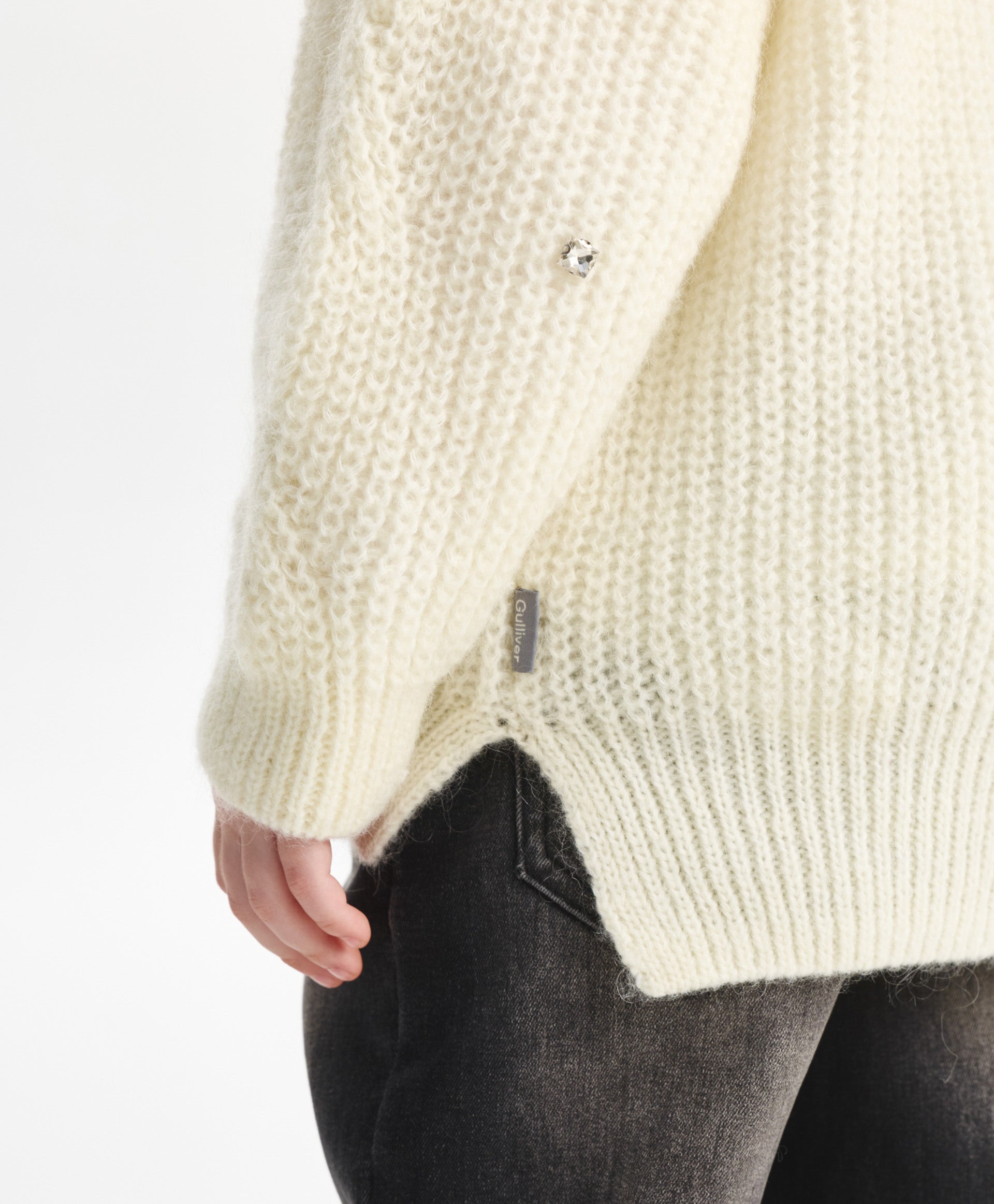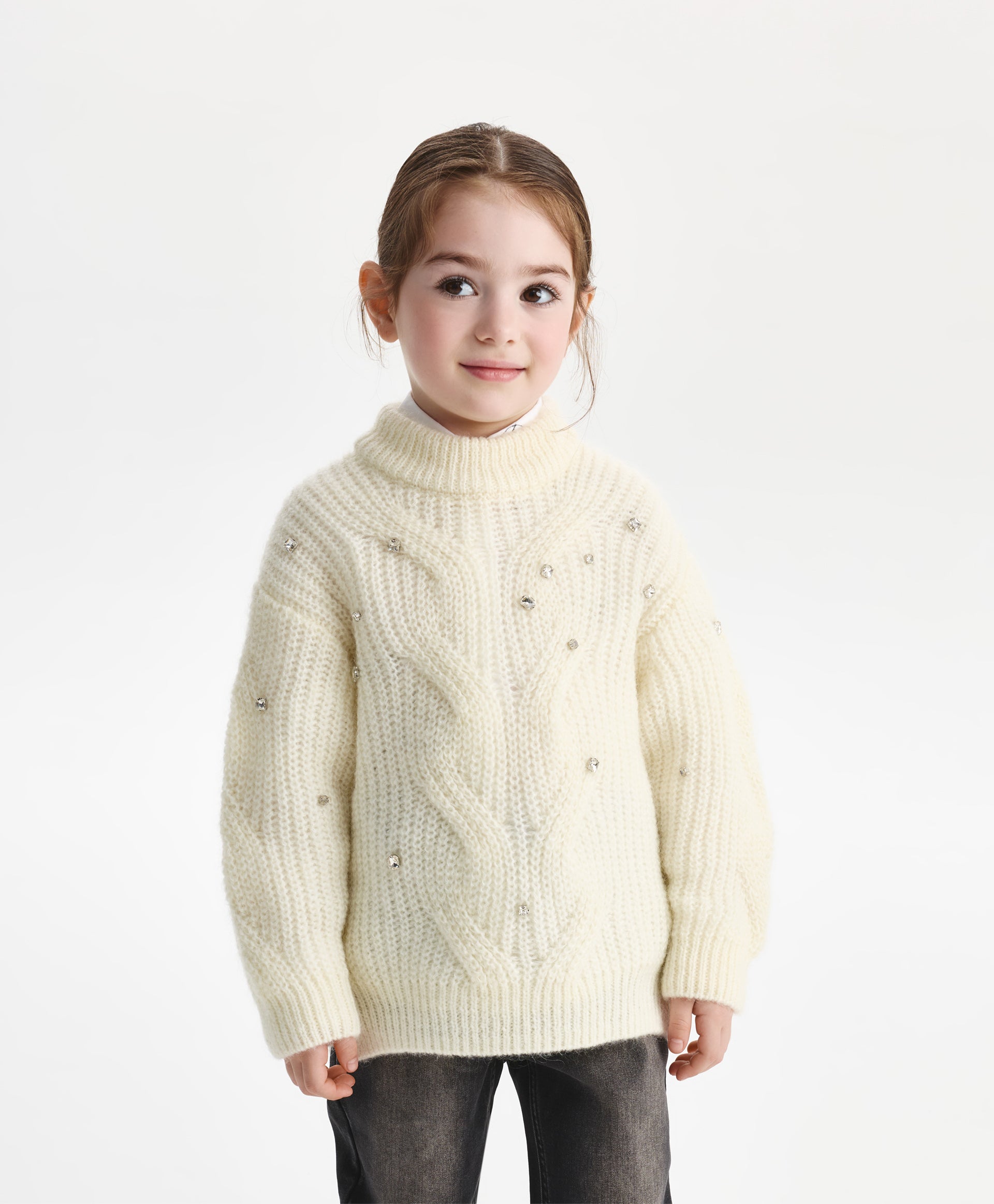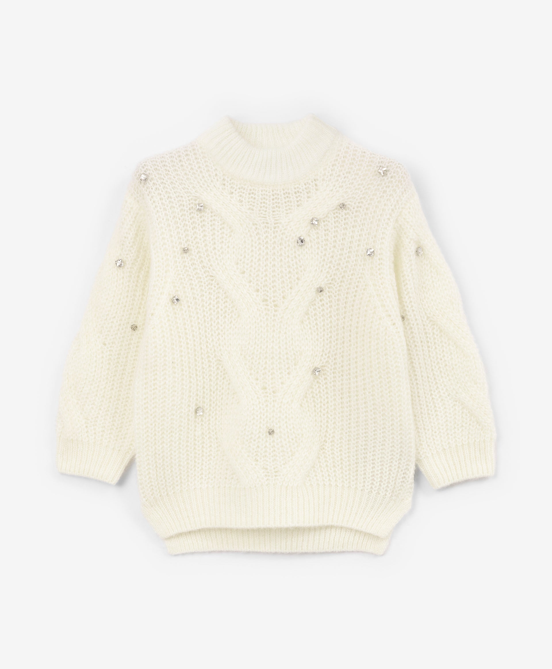This milk-colored cable knit sweater combines style and comfort in a moderate oversized silhouette. Crafted from a soft yarn blend with merino wool and mohair, it has a fluffy texture that feels gentle on the skin. The openwork cable pattern adds warmth without weight, while large transparent sequins on the front create a subtle shimmer, making the sweater a stylish choice for fall and winter outfits.
