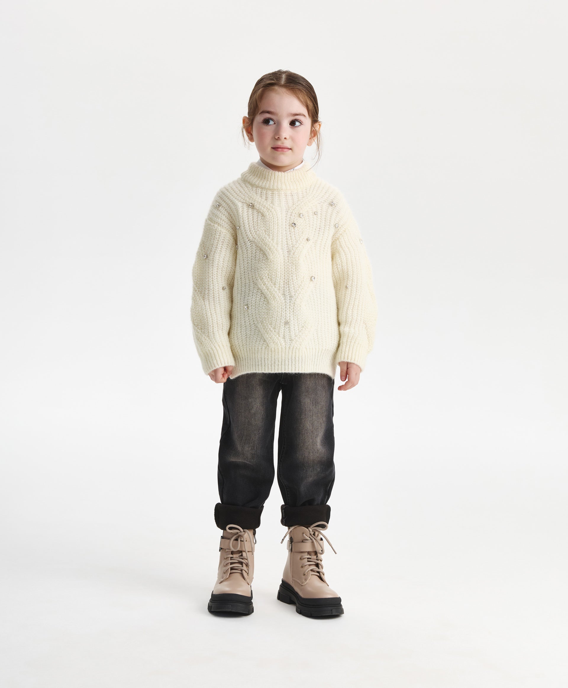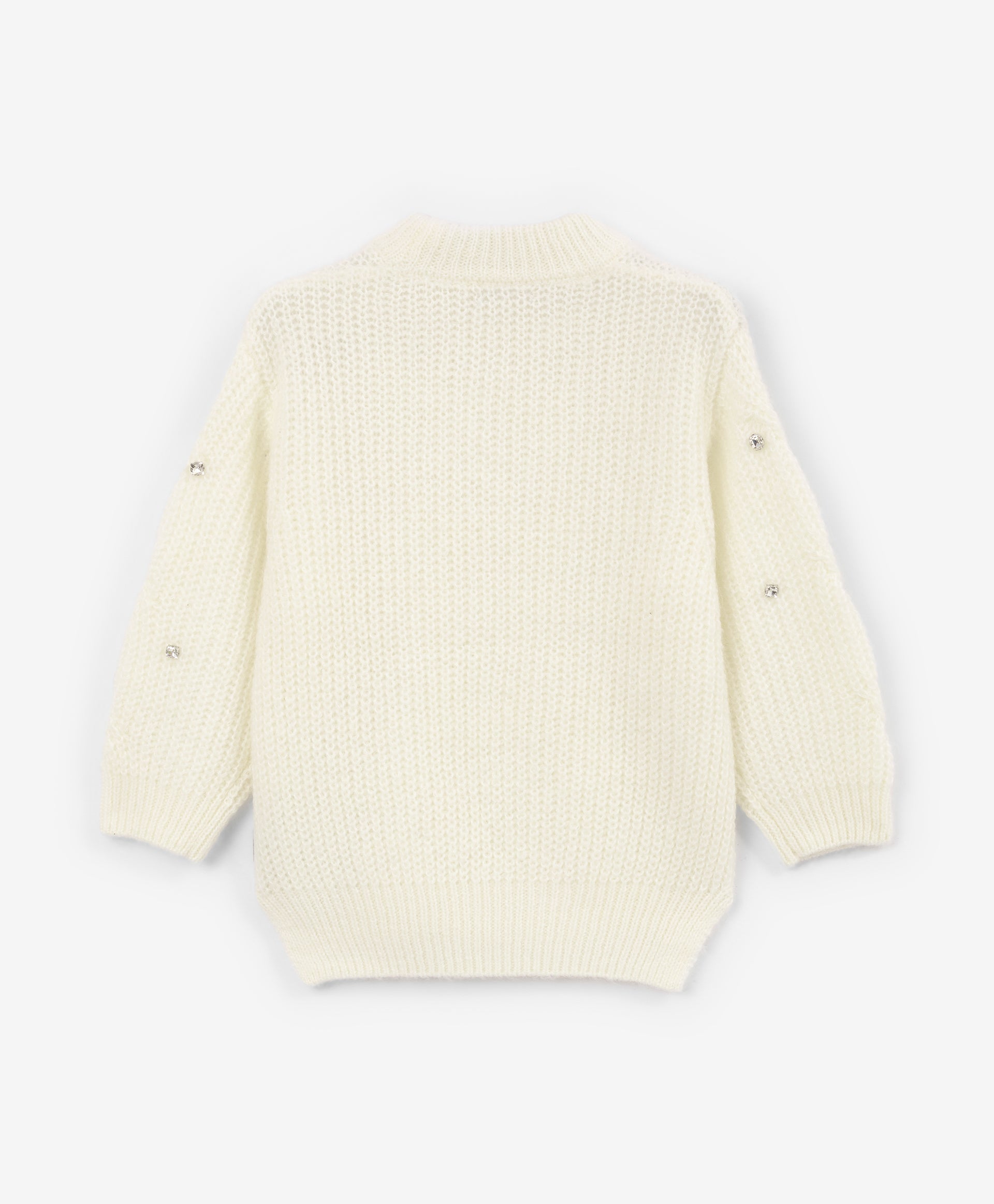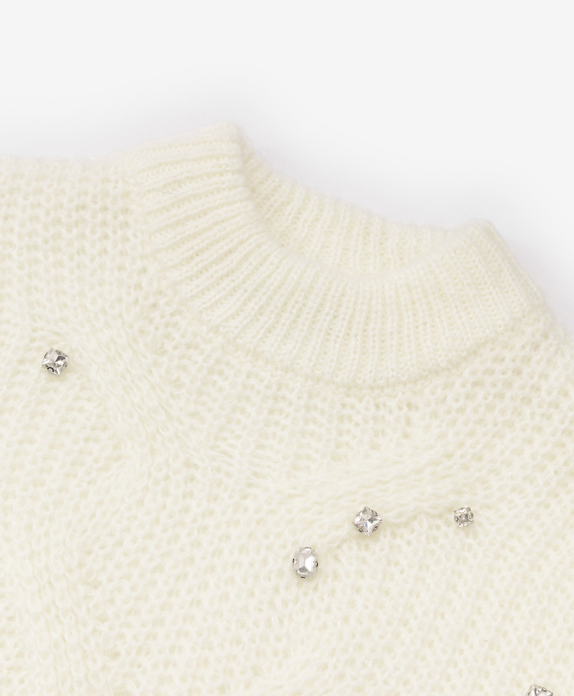 This milk-colored cable knit sweater combines style and comfort in a moderate oversized silhouette. Crafted from a soft yarn blend with merino wool and mohair, it has a fluffy texture that feels gentle on the skin. The openwork cable pattern adds warmth without weight, while large transparent sequins on the front create a subtle shimmer, making the sweater a stylish choice for fall and winter outfits.