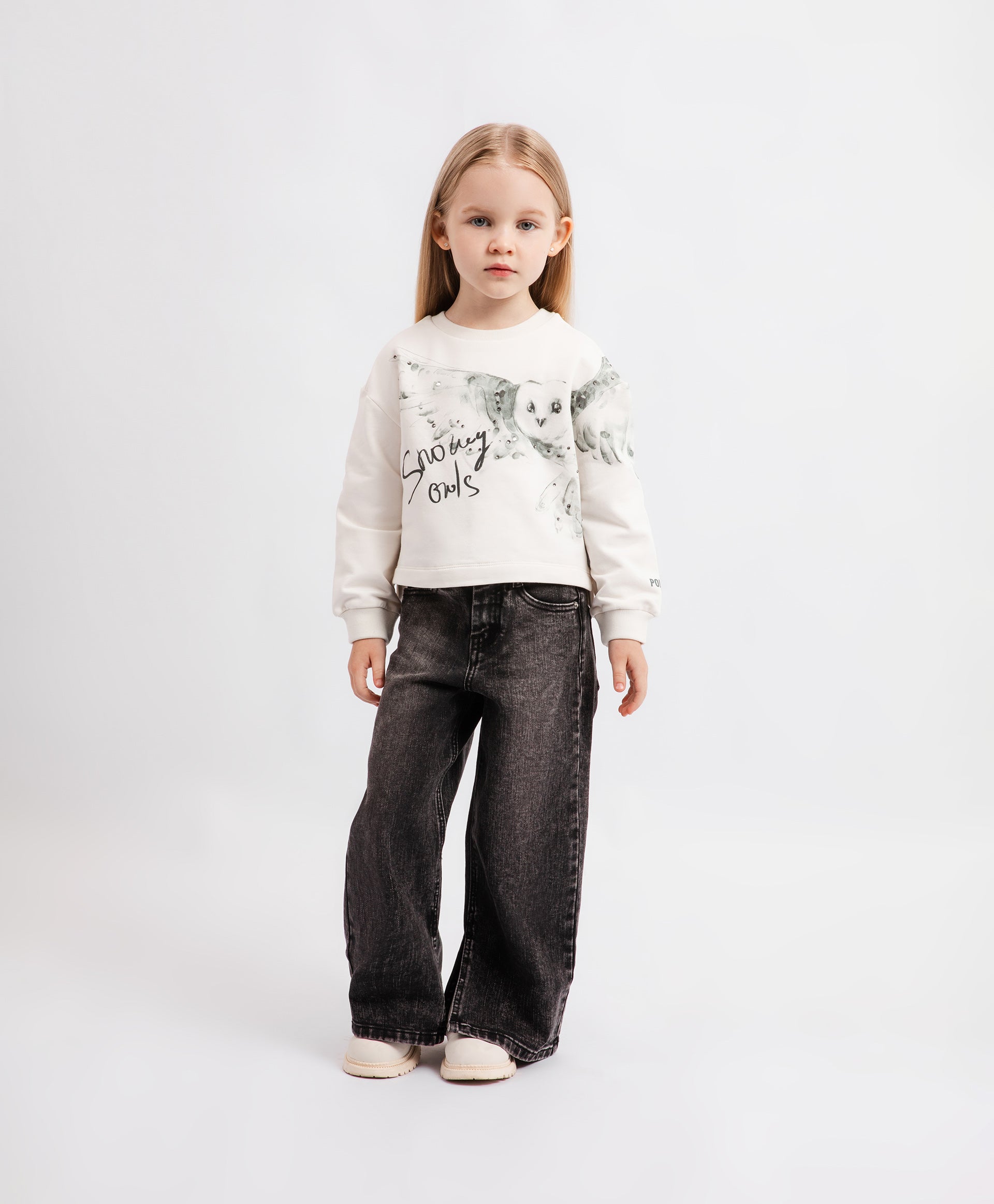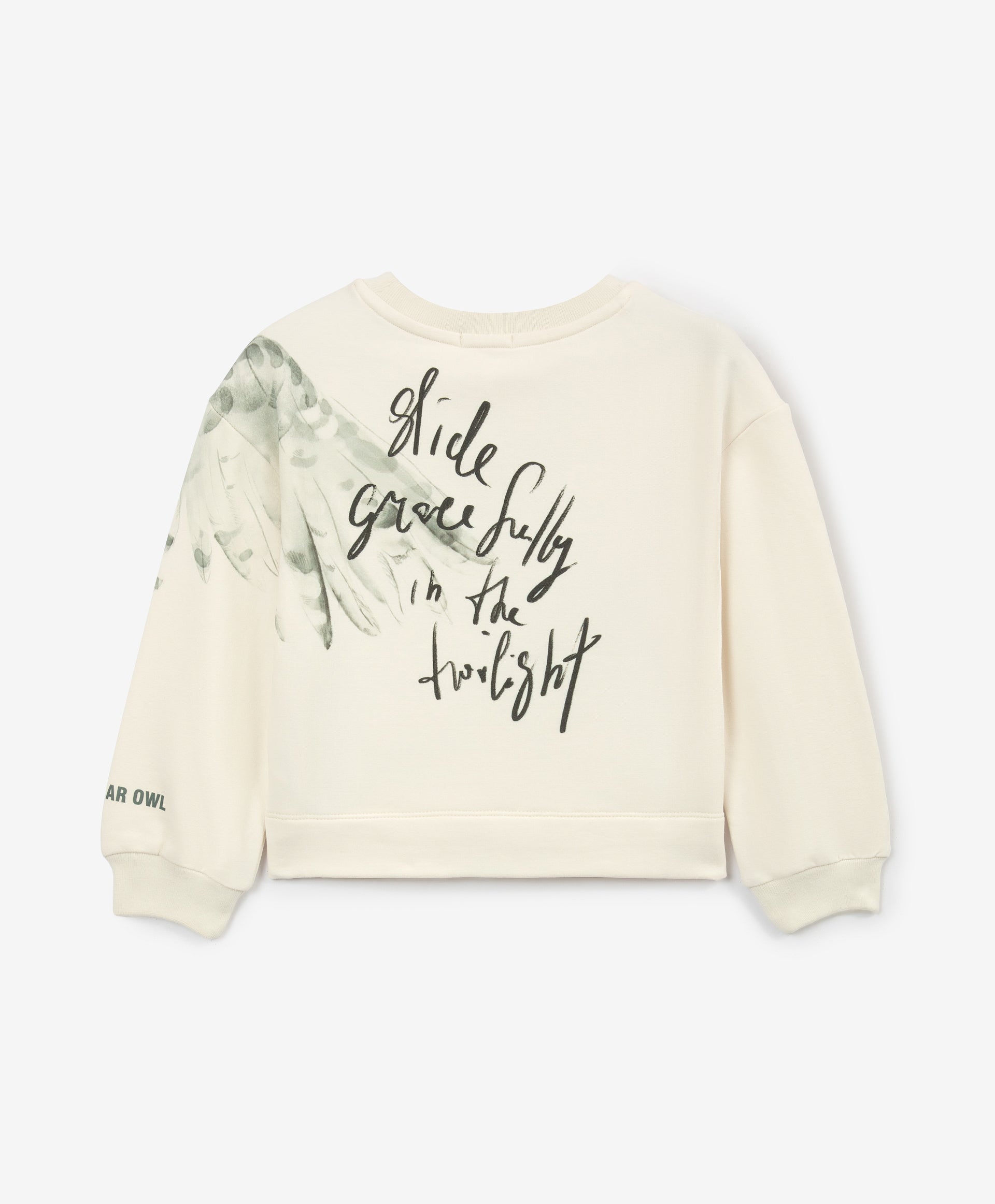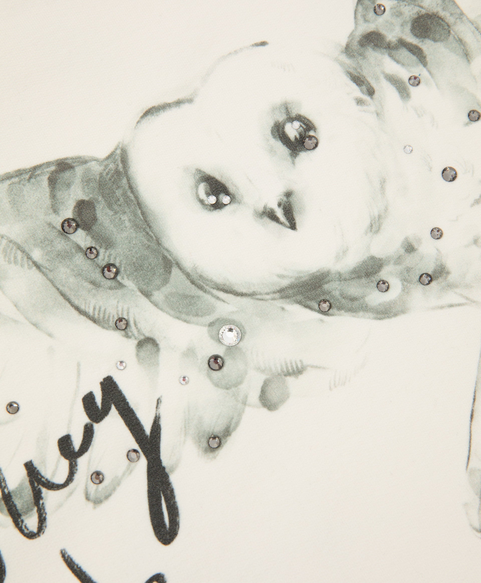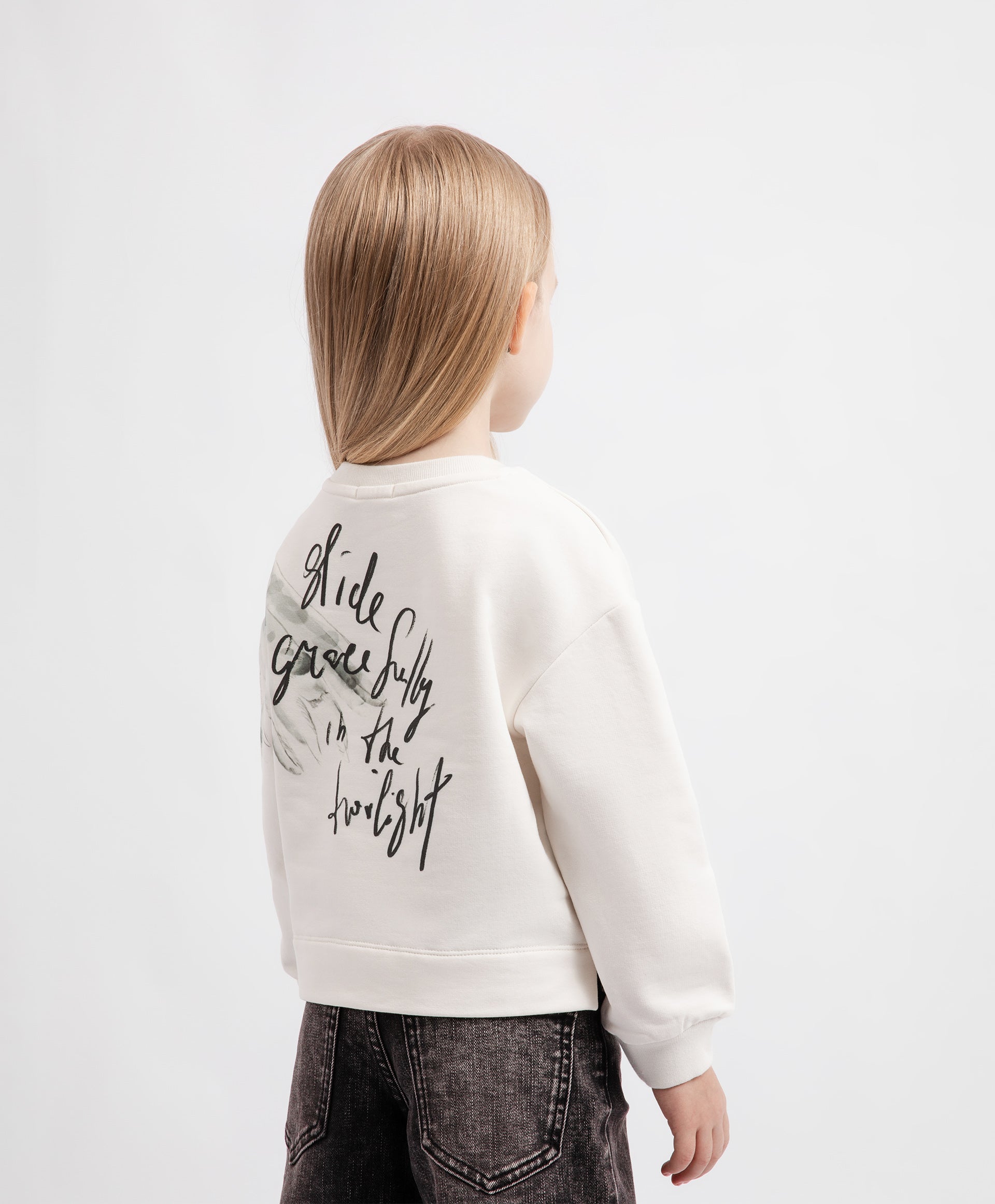 This cream oversized sweatshirt for girls is a stylish and cozy must-have for the fall-winter season. Made from soft brushed cotton fleece, it provides warmth and comfort on cool days. The relaxed silhouette with dropped shoulders and an elongated back creates a trendy casual look. A large artistic animal print adorned with sparkling rhinestones decorates the front, sleeve, and back, adding elegance and charm. Perfect for pairing with jeans, skirts, or joggers, this sweatshirt is both fashionable and practical for everyday wear.