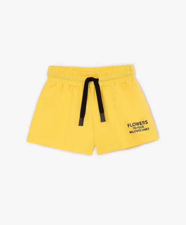 These yellow knit shorts for girls are the perfect choice for hot weather. Made from soft interlock fabric, they feature a comfortable elastic waistband and a unique design with vertical seams on the front. The vibrant colour, complemented by contrasting text graphics, cords with plastic tips, and a woven jacquard label, makes these shorts both stylish and functional. With side pockets for added convenience, they offer comfort and a sporty look for your little one.