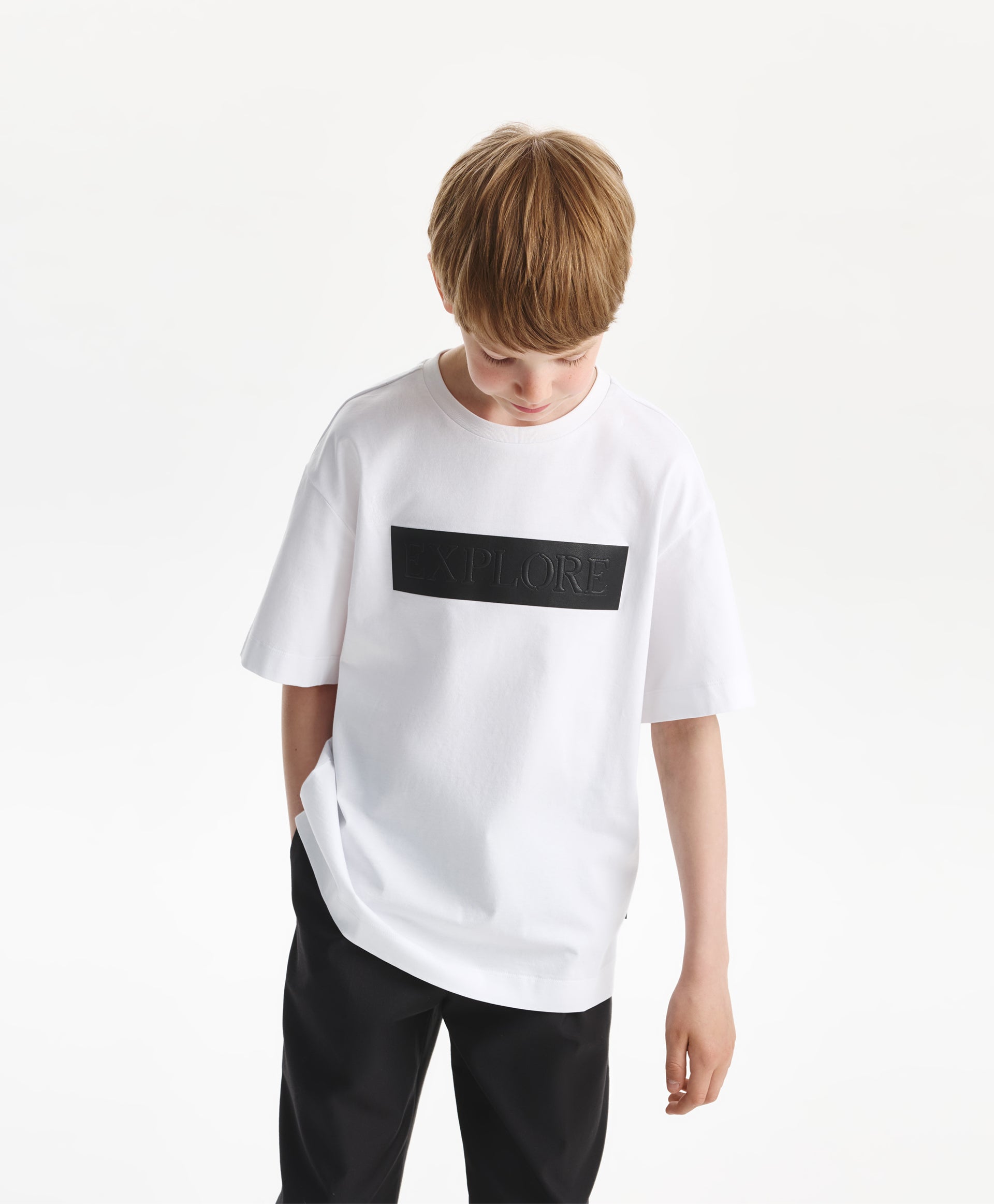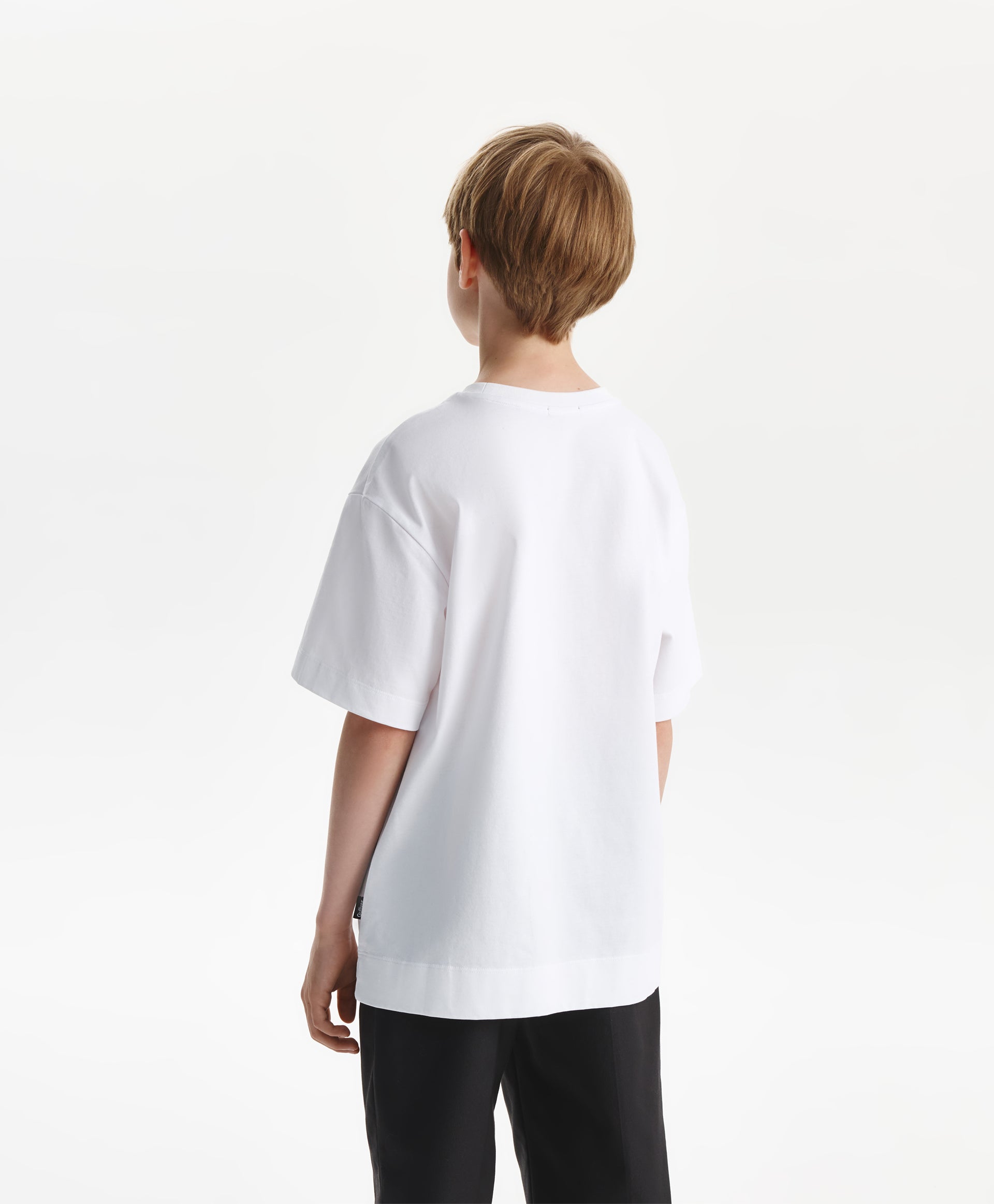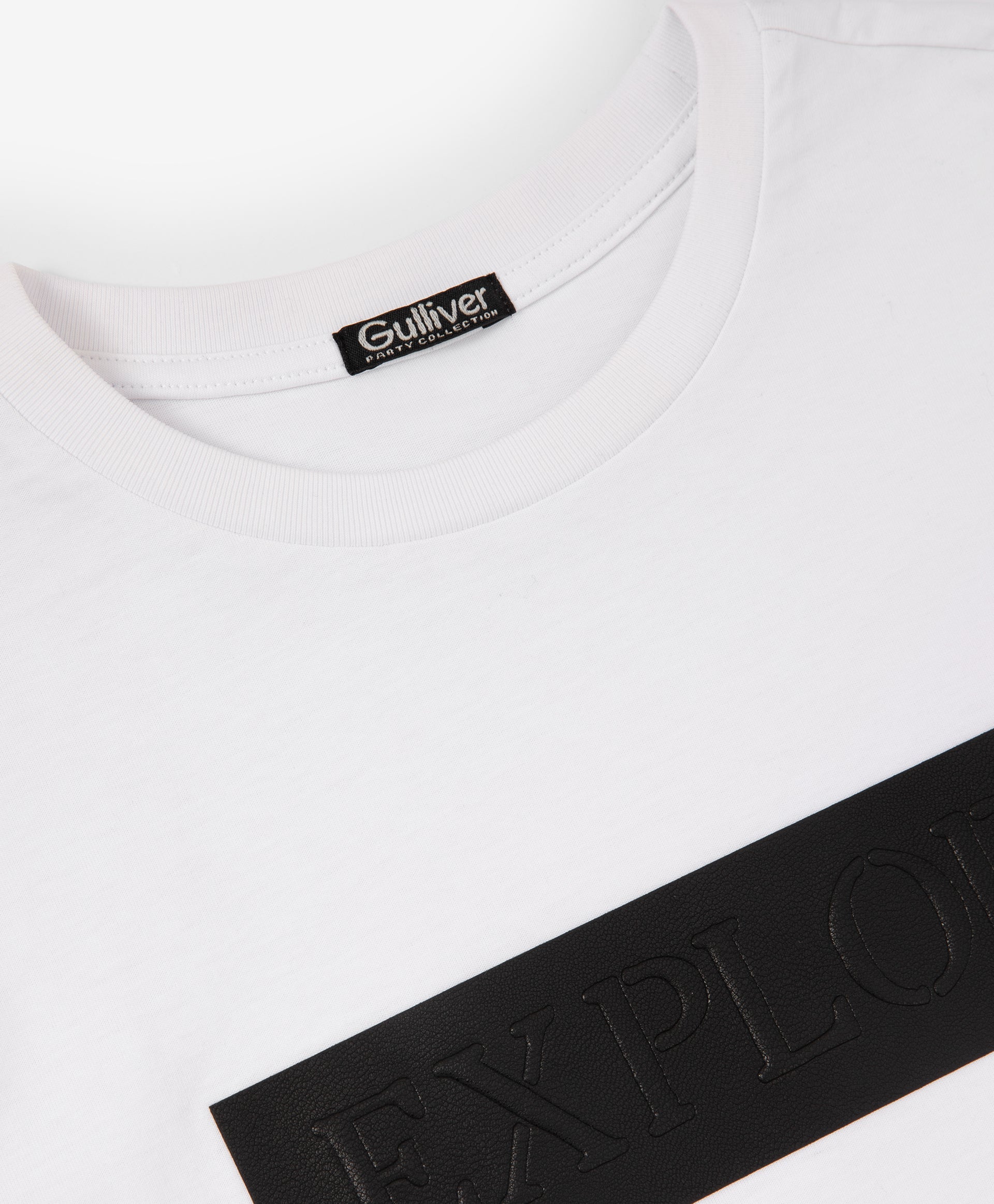 White short-sleeve T-shirt for boys from Gulliver’s Pink Quartz collection. Made from mercerized cotton for a smooth, silky feel, it features a minimalist text print and extended back hem. Breathable and durable, this T-shirt maintains its shape and pairs effortlessly with blazers, trousers, or jeans. Its relaxed fit makes it perfect for both everyday wear and special occasions.