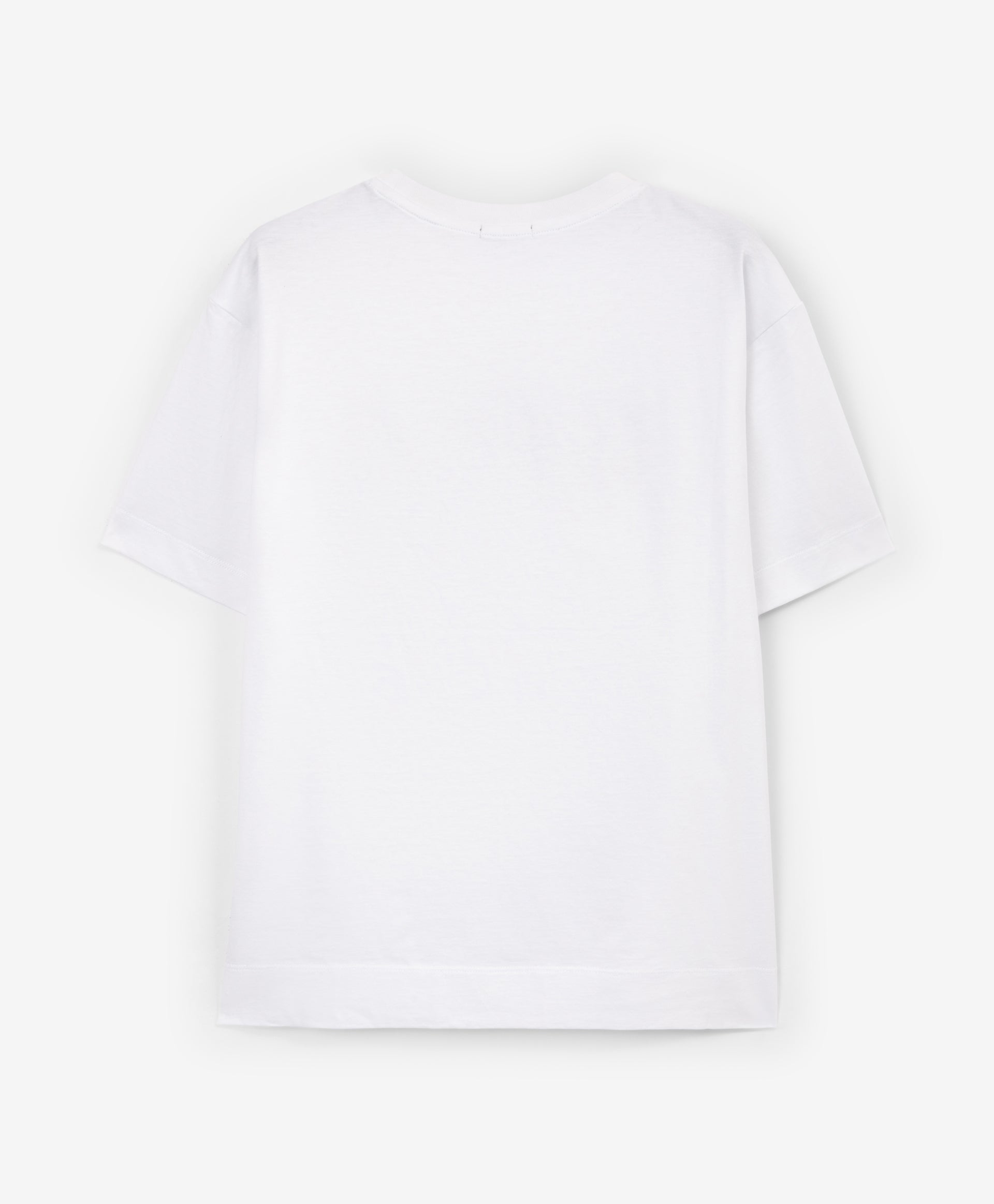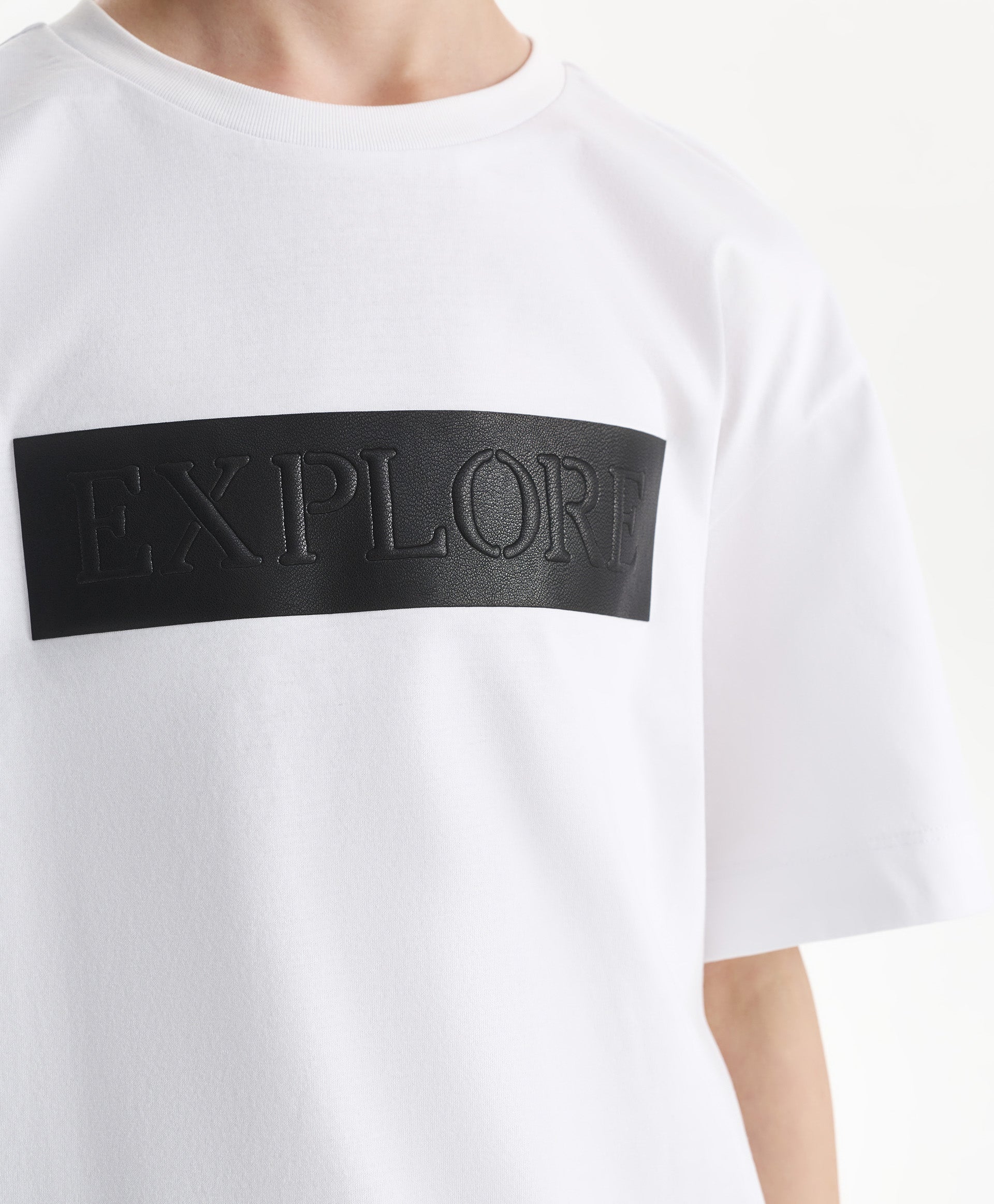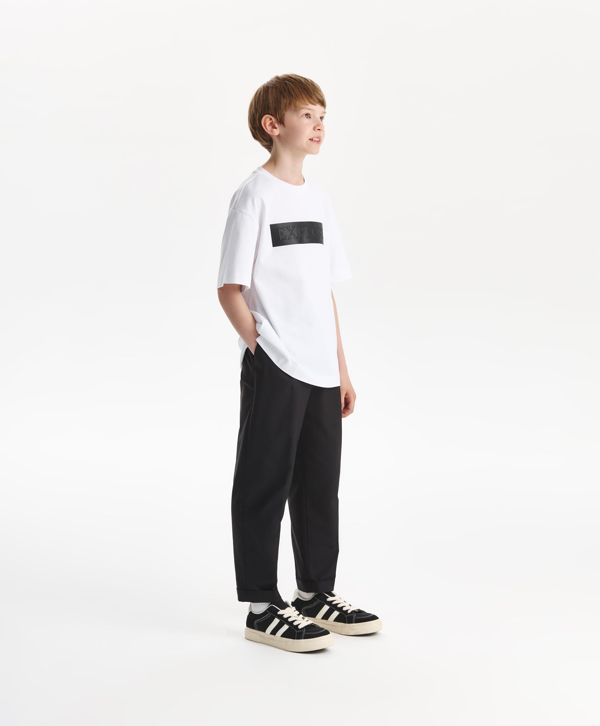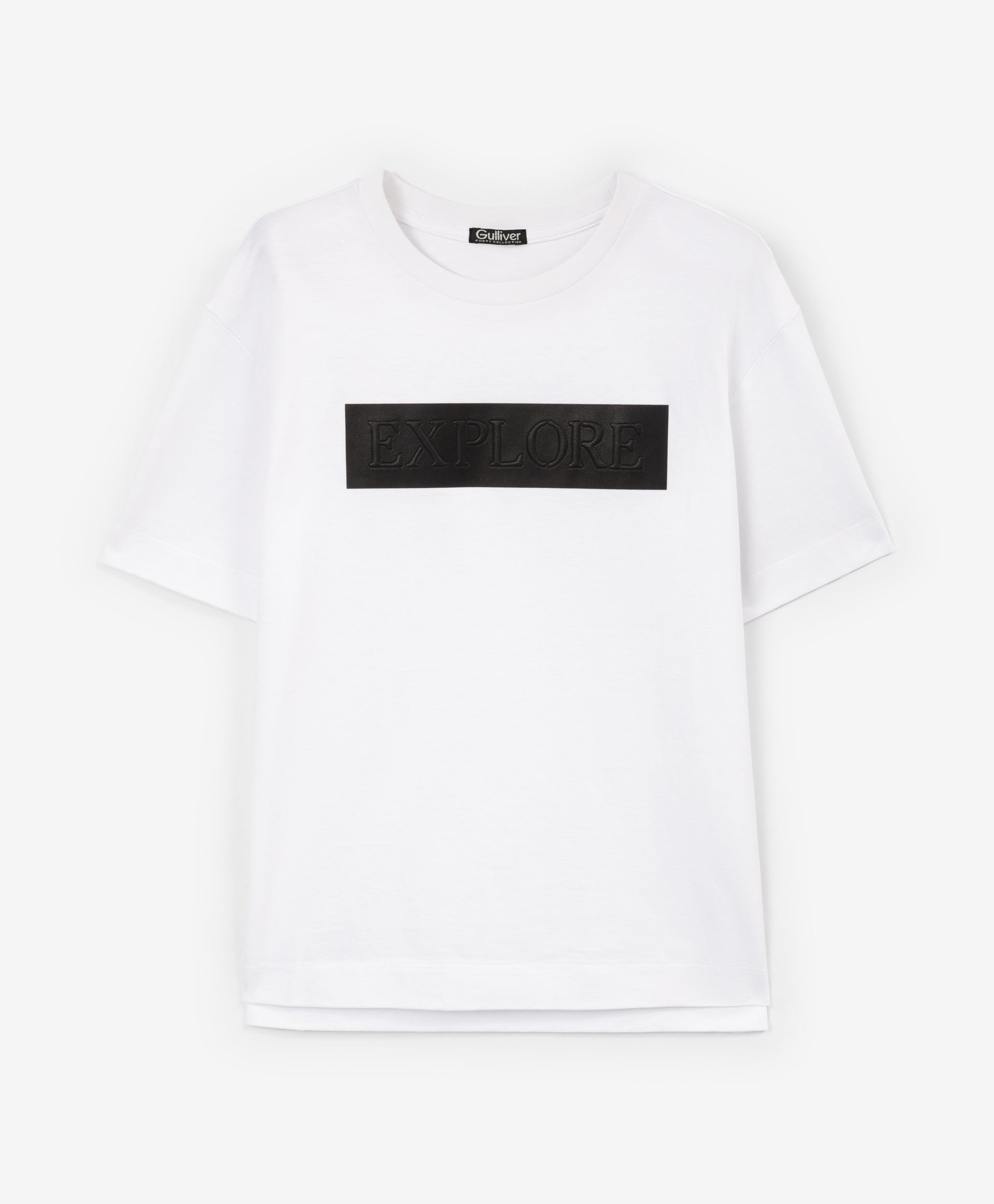 White short-sleeve T-shirt for boys from Gulliver’s Pink Quartz collection. Made from mercerized cotton for a smooth, silky feel, it features a minimalist text print and extended back hem. Breathable and durable, this T-shirt maintains its shape and pairs effortlessly with blazers, trousers, or jeans. Its relaxed fit makes it perfect for both everyday wear and special occasions.