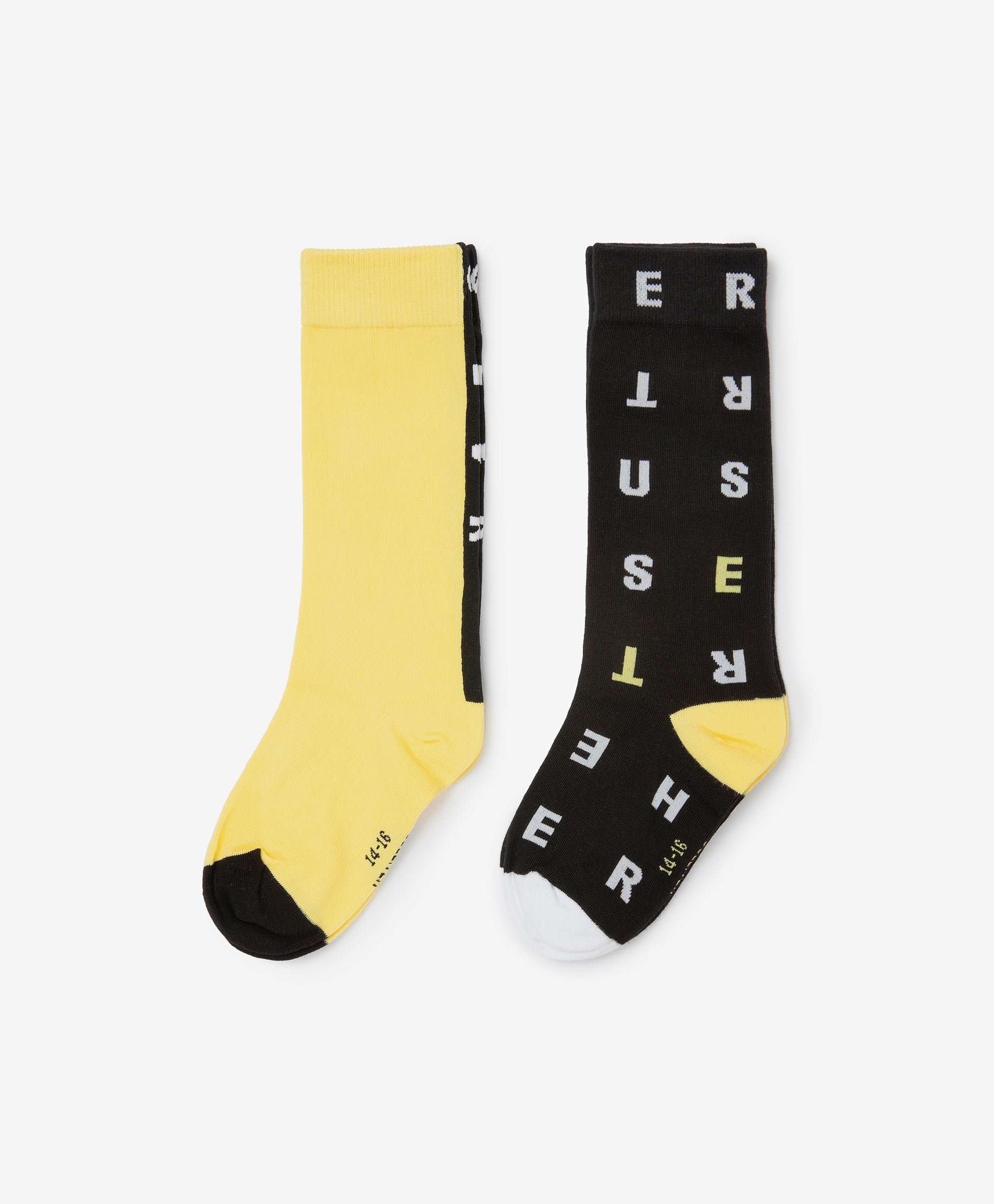 Two pairs of high socks made from soft, breathable yarn with a high cotton content – perfect accessories for girls’ autumn-winter outfits. Designed to fit the foot comfortably, these socks keep feet warm and add a playful, colorful touch to every step.