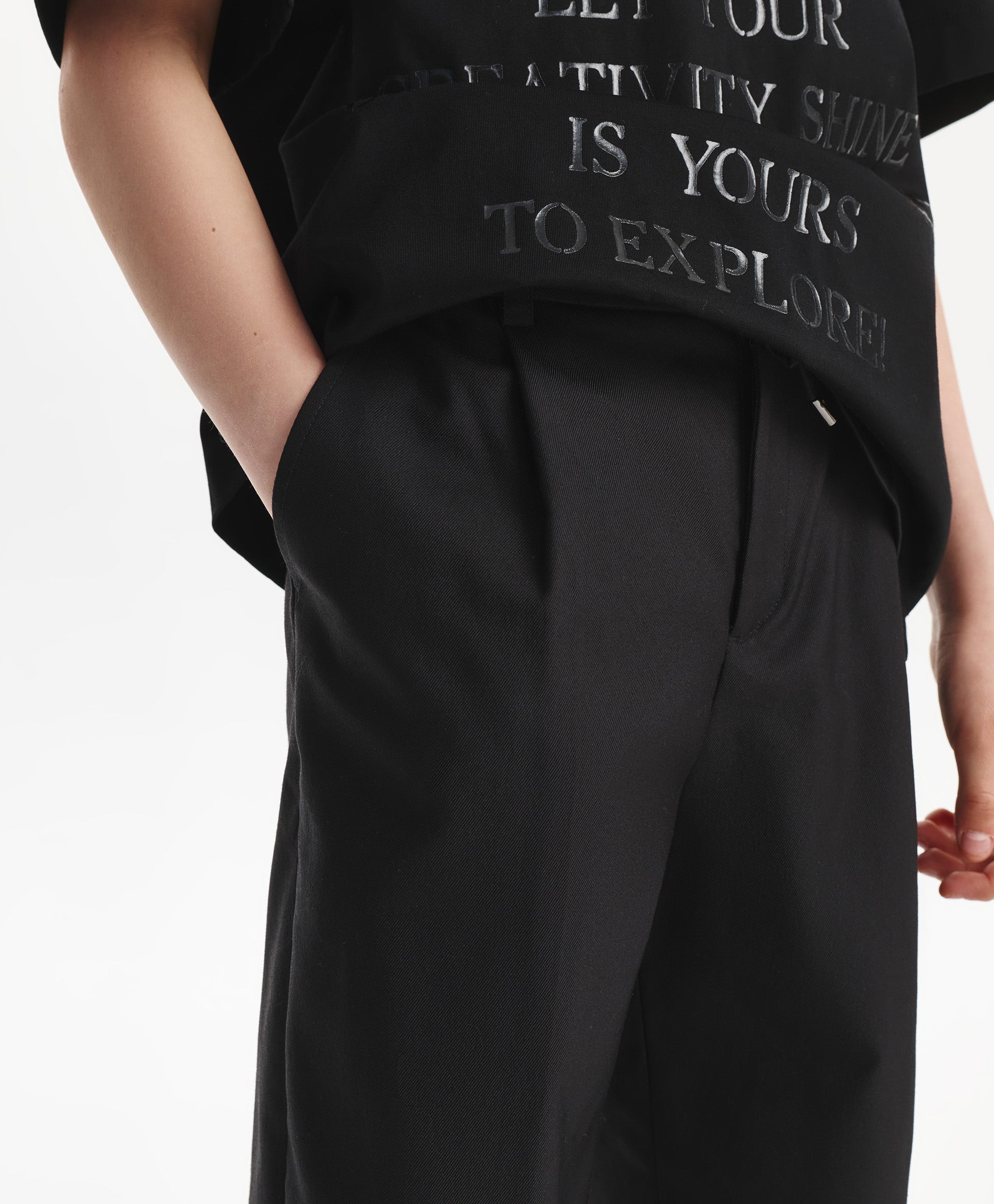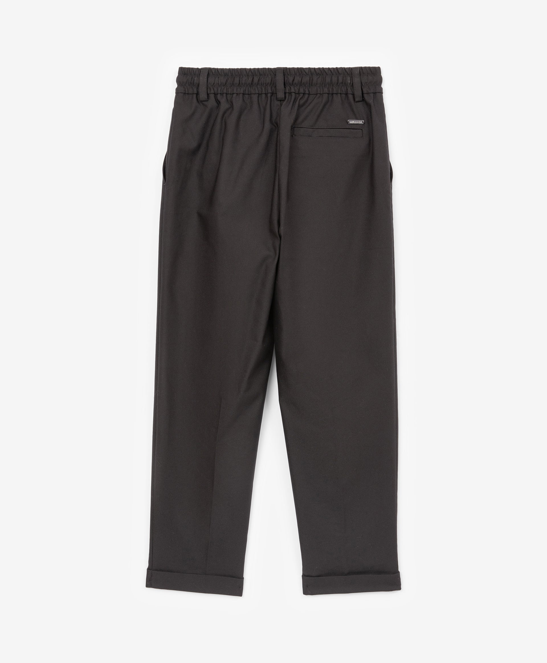 Classic black straight-fit trousers for boys from Gulliver’s Pink Quartz collection. Crafted from smooth cotton-textile with a silky viscose-polyester lining, they combine comfort and style. The elastic waistband with drawstrings ensures a perfect fit, while slanted front pockets and a functional back welt pocket add practicality. Secures with a zipper, button, and hook closure. Ideal for both casual and dressy occasions.
