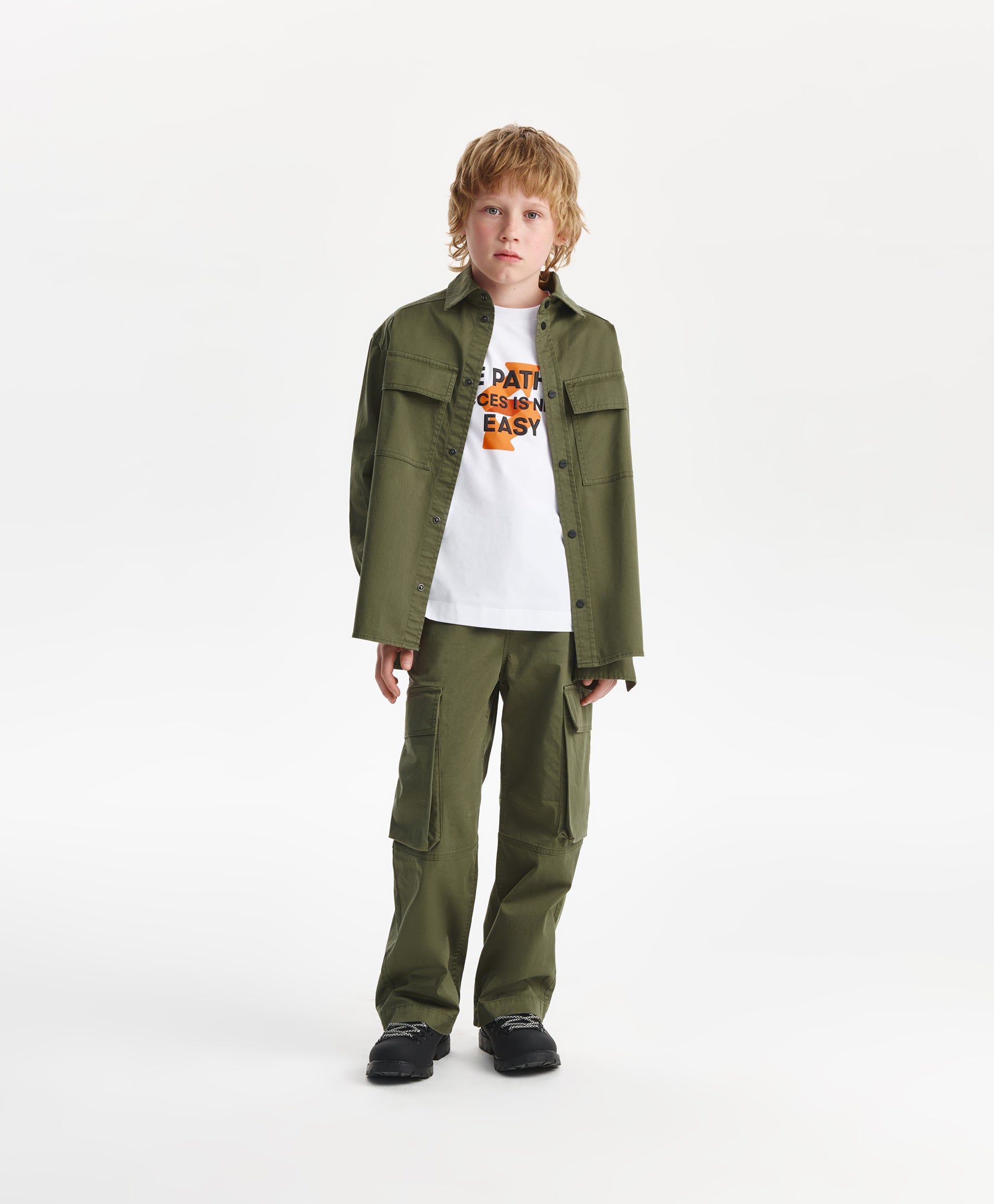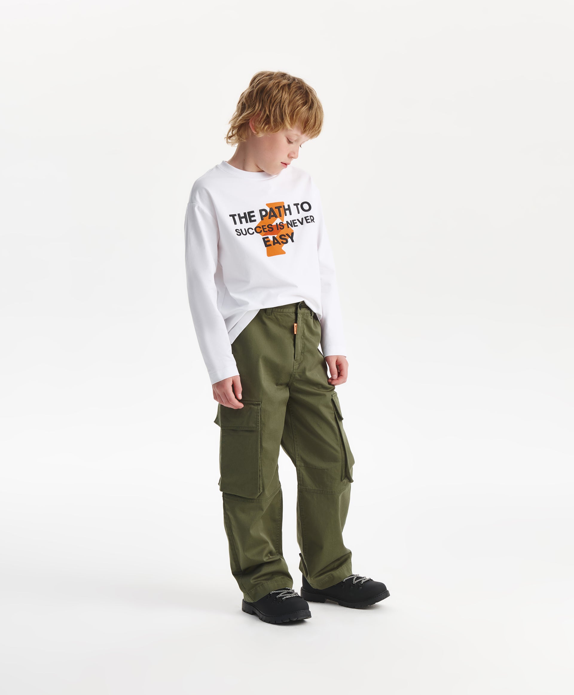 Durable and stylish khaki cargo pants for boys from Gulliver. Made from high-quality cotton with a small percentage of elastane for stretch and comfort. Features multiple functional cargo pockets, a classic button and zip closure, and a straight-leg design for easy movement. Perfect for school, casual outings, or outdoor adventures. The fabric maintains its shape, color, and softness after repeated washes, ensuring long-lasting wear.