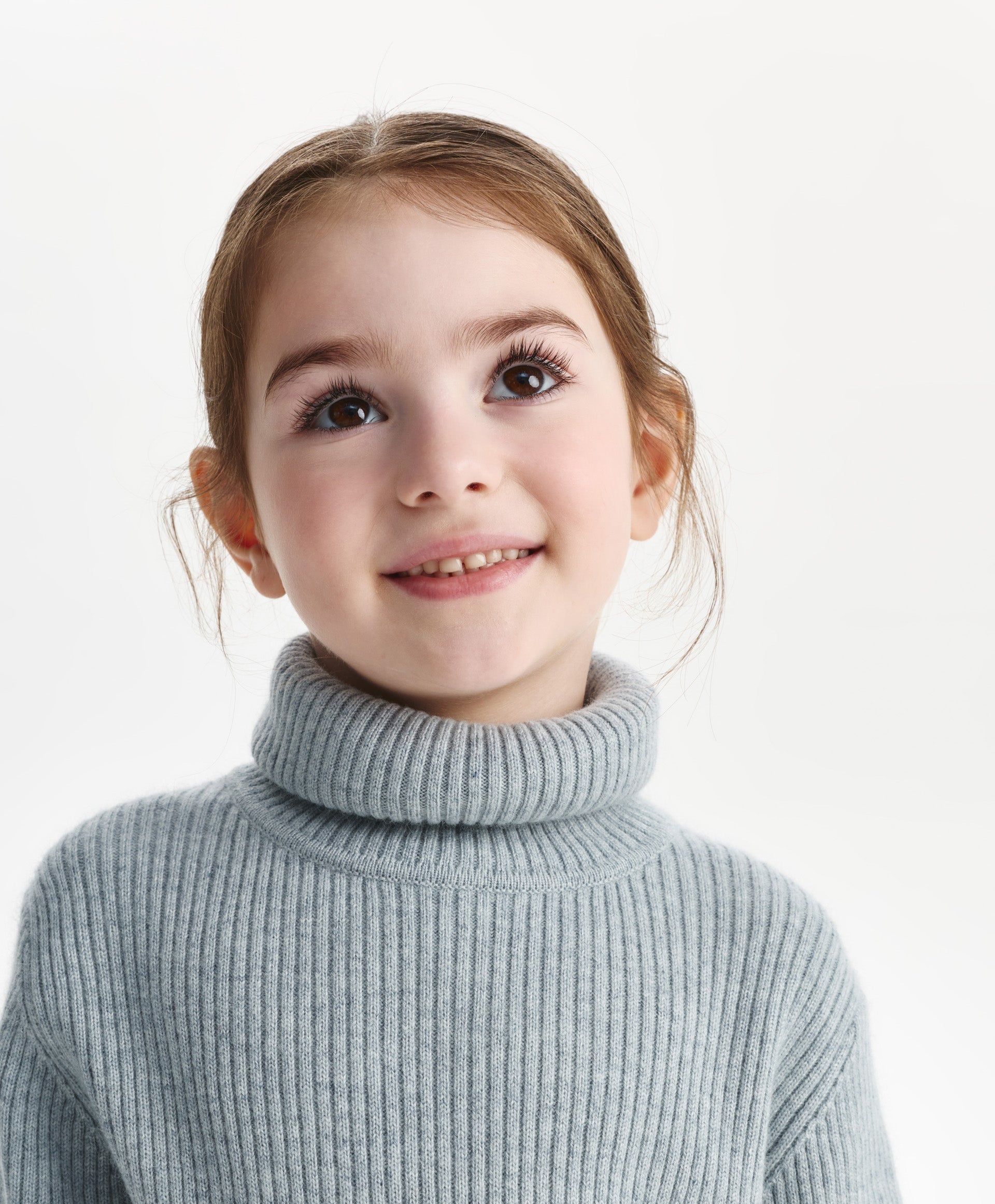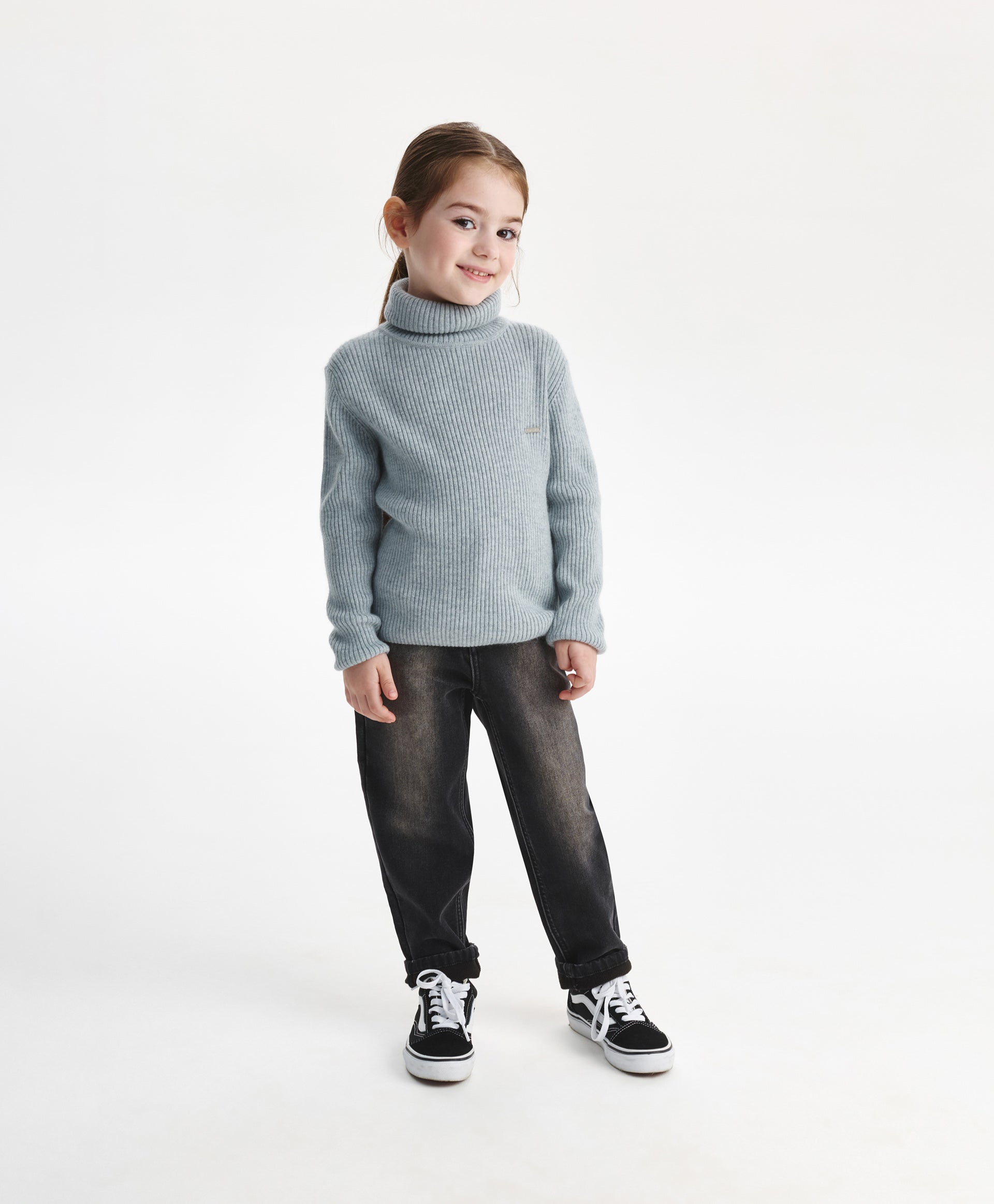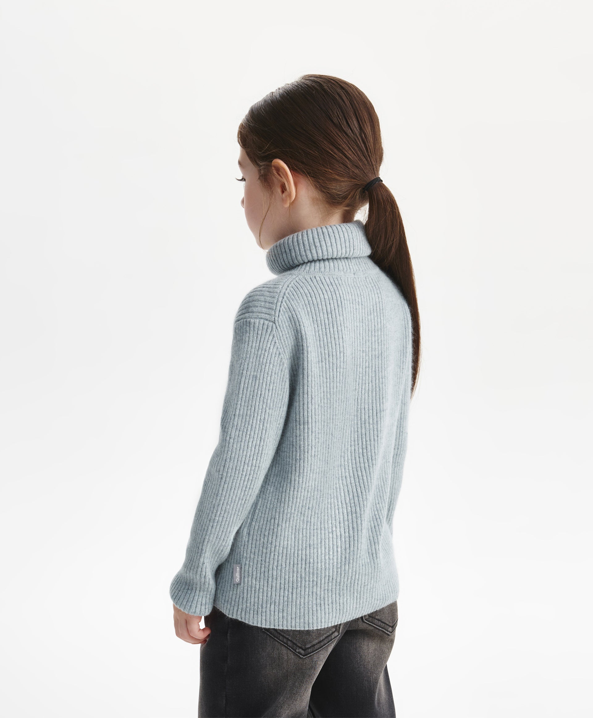 This gray knitted turtleneck is a cozy essential for a girl’s fall-winter wardrobe. Crafted from ultra-soft yarn with merino wool and angora, it provides warmth, comfort, and a gentle feel on the skin. The high neckline ensures extra protection on cold days, while the minimalist design adds a touch of refined elegance. Perfect for pairing with skirts, jeans, or layered under dresses for stylish seasonal looks.