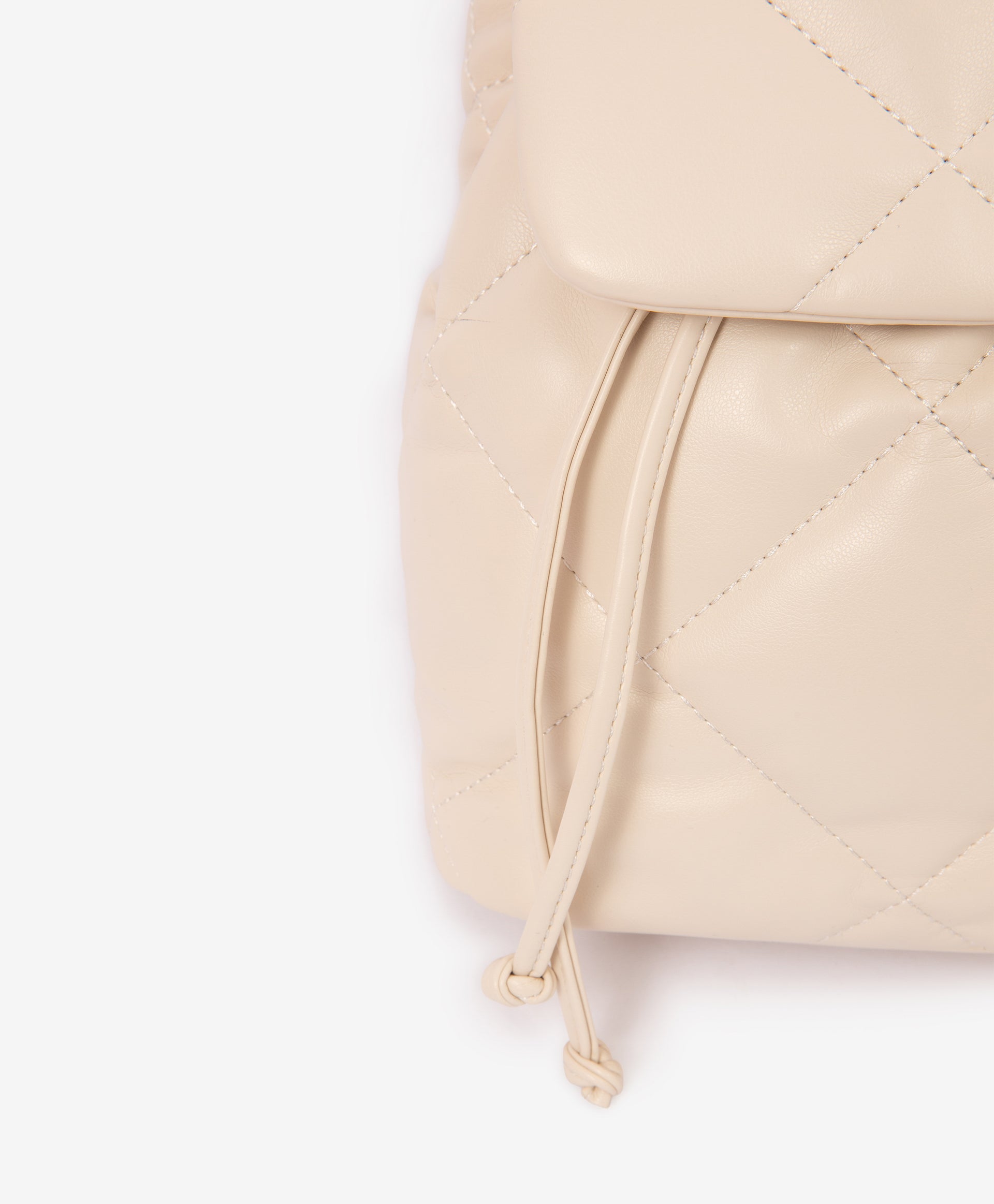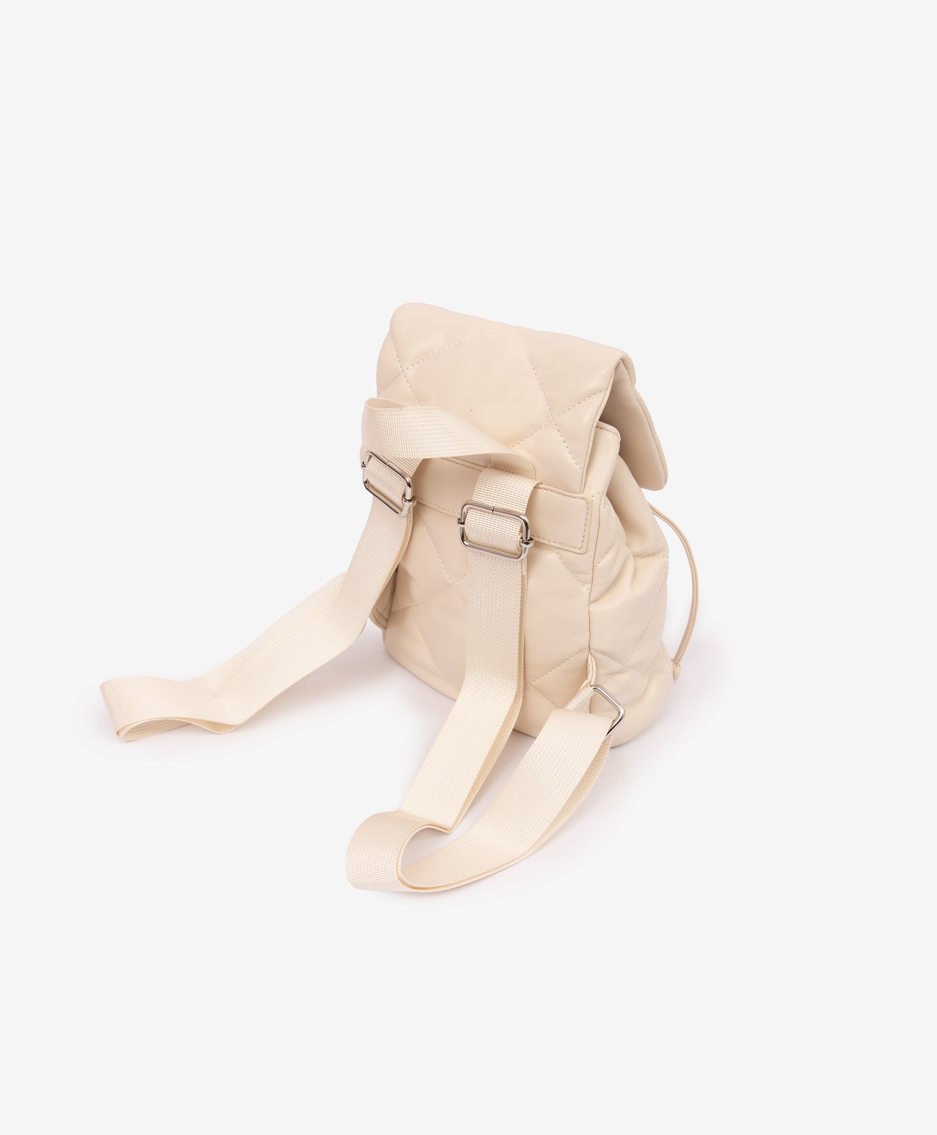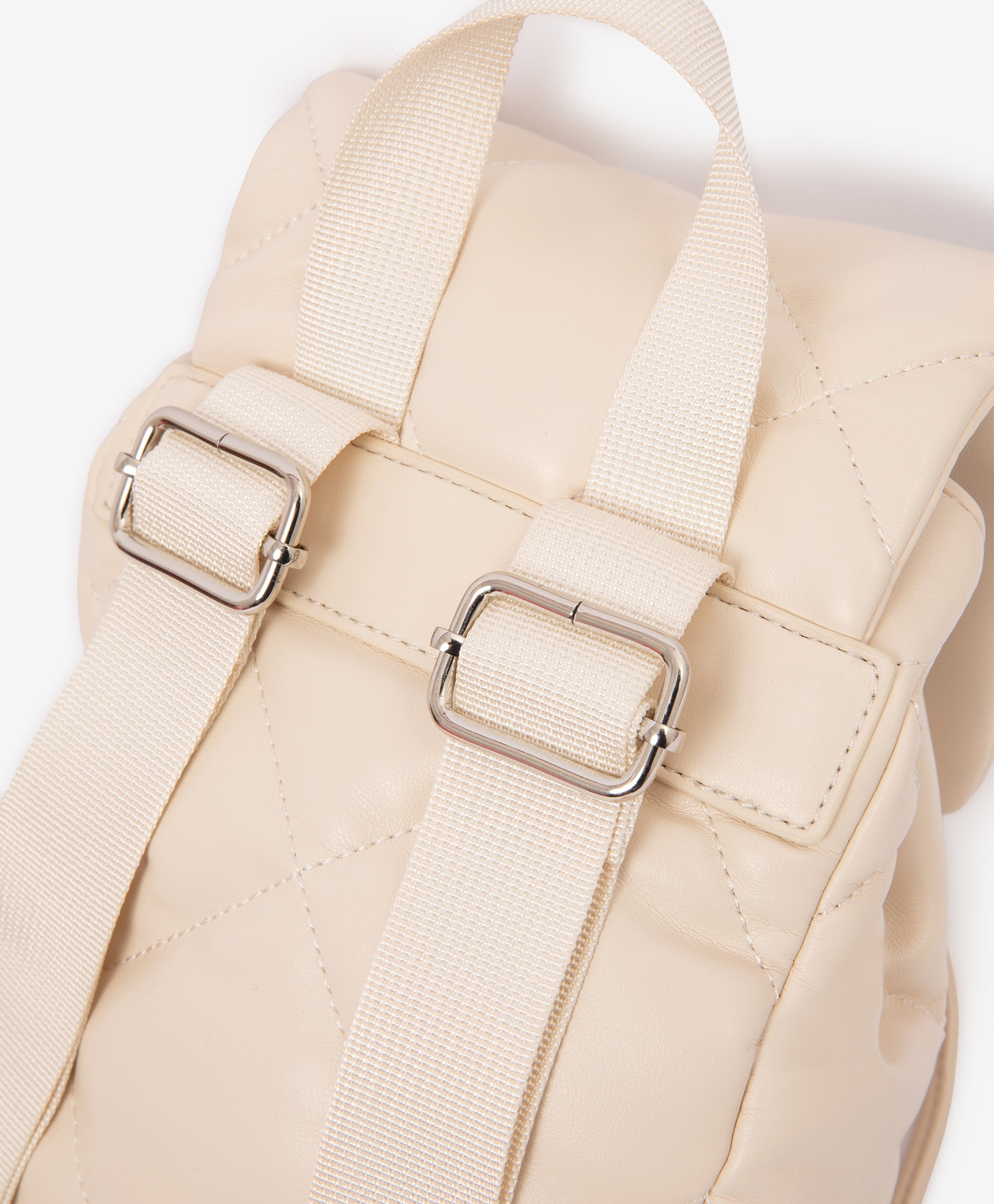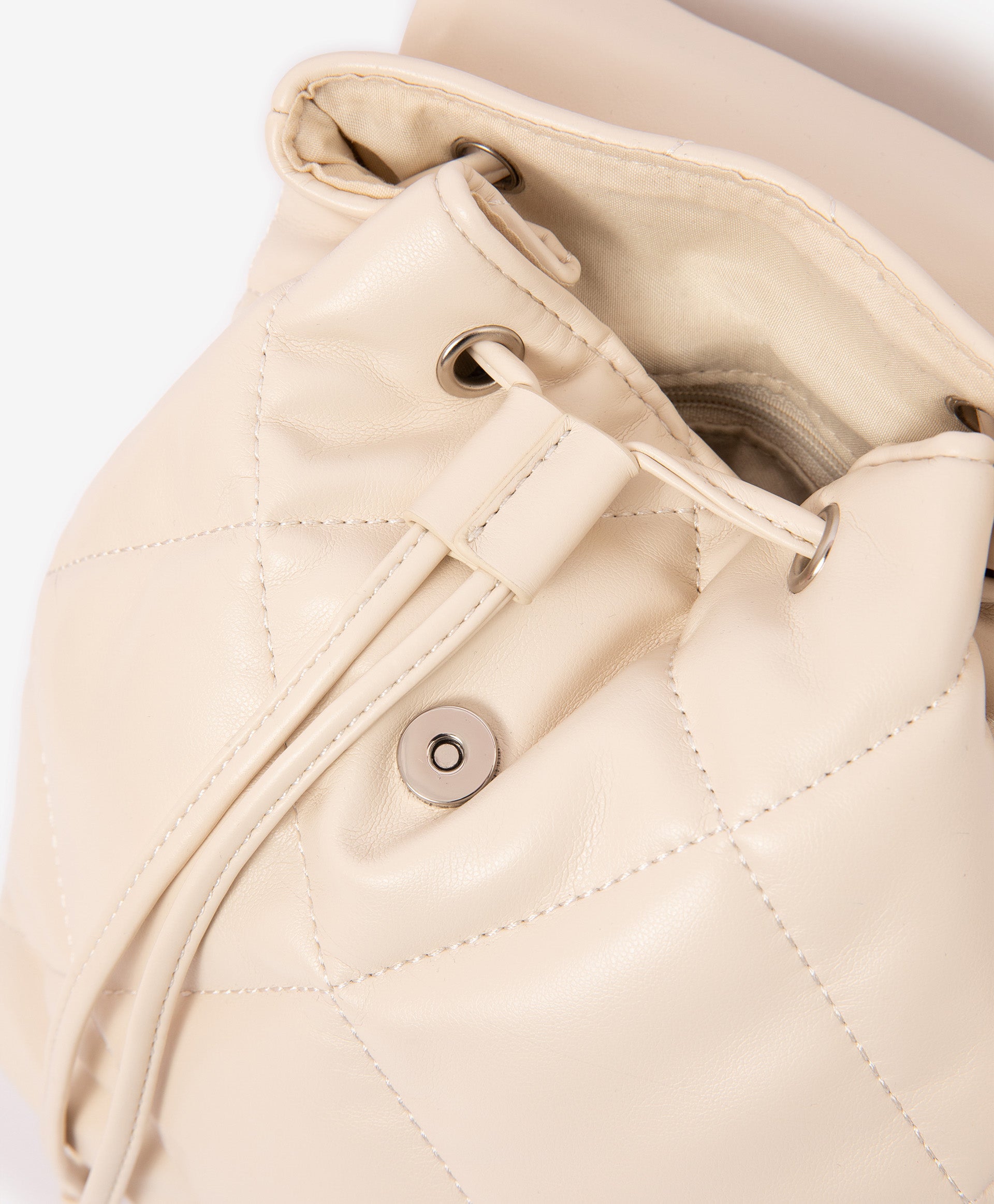 This quilted backpack in soft Milky color is a stylish and functional accessory for girls. Made from smooth matte faux leather, it features a drawstring closure with a magnetic flap for easy access and a modern look. The structured oval base ensures stability, while adjustable webbing straps with silver-tone hardware provide comfort and durability. Inside, a spacious main compartment and a small zip pocket keep essentials organized. Perfectly complements looks from the Gulliver “Polar Owl” collection and beyond.