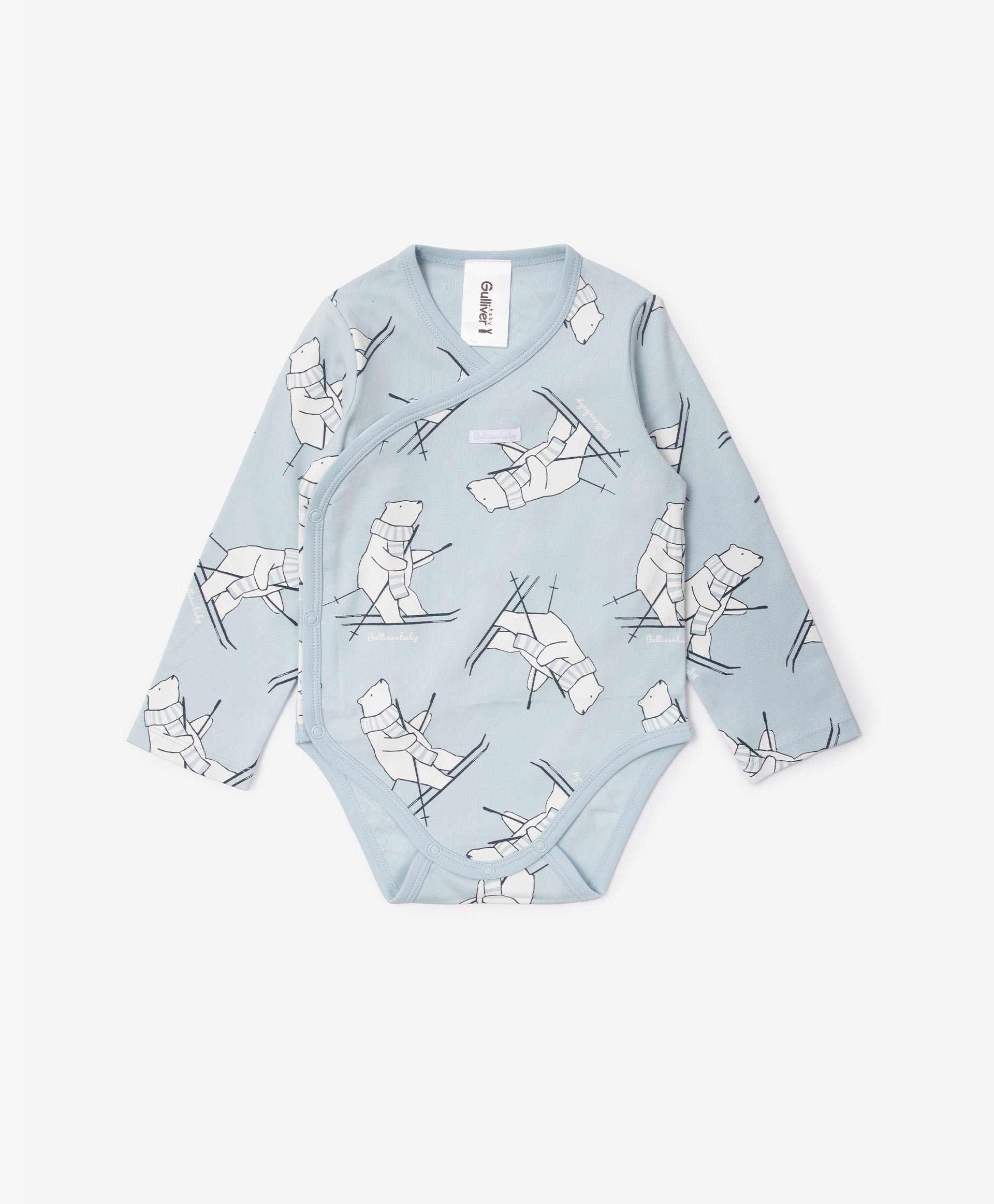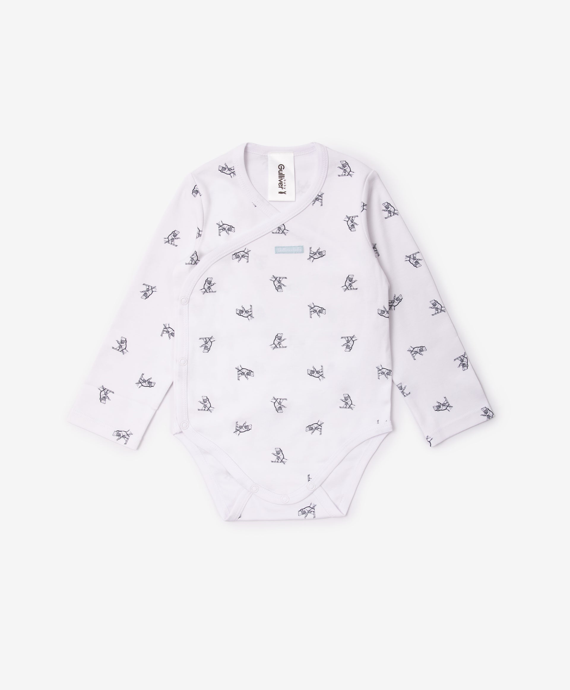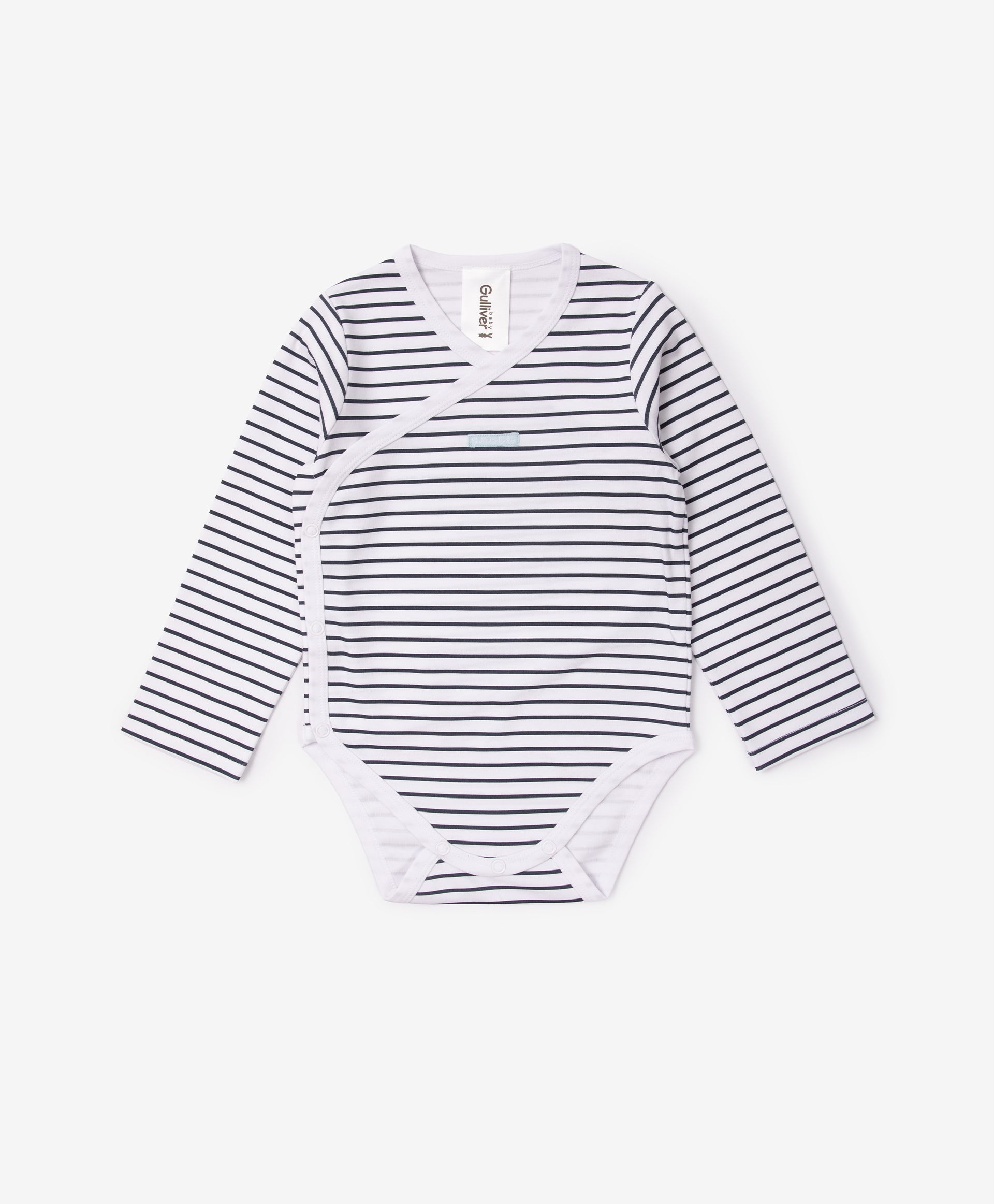 This set of three wrap-style long sleeve bodysuits for boys is designed for comfort, practicality, and gentle care. Made from soft, breathable natural cotton, they ensure maximum comfort and protect delicate skin. The convenient wrap design with snap fasteners makes dressing and changing easy, while the stretchy fabric allows full freedom of movement. Each bodysuit features a unique soft color or print, perfect for everyday wear and layering during the cooler months.