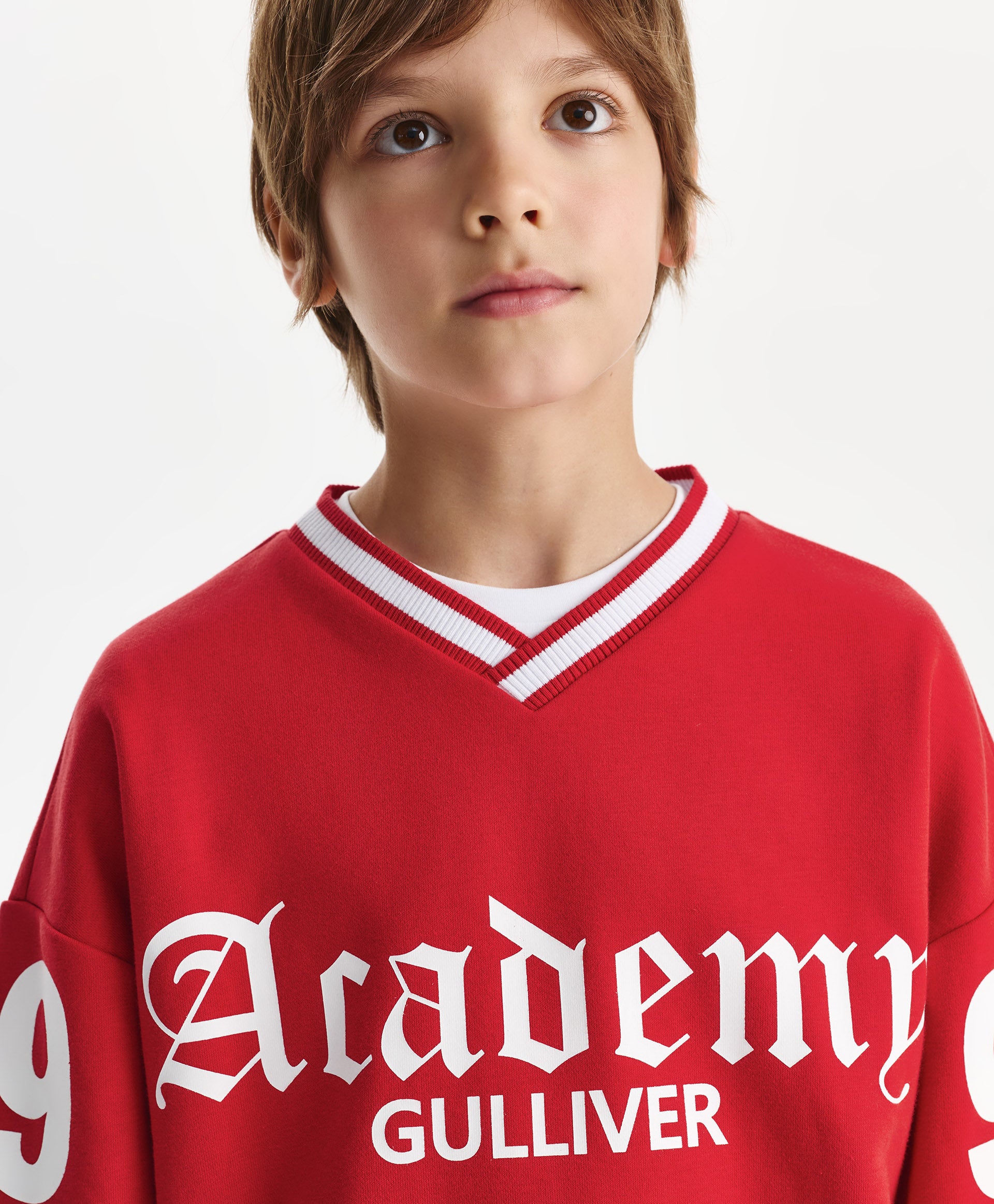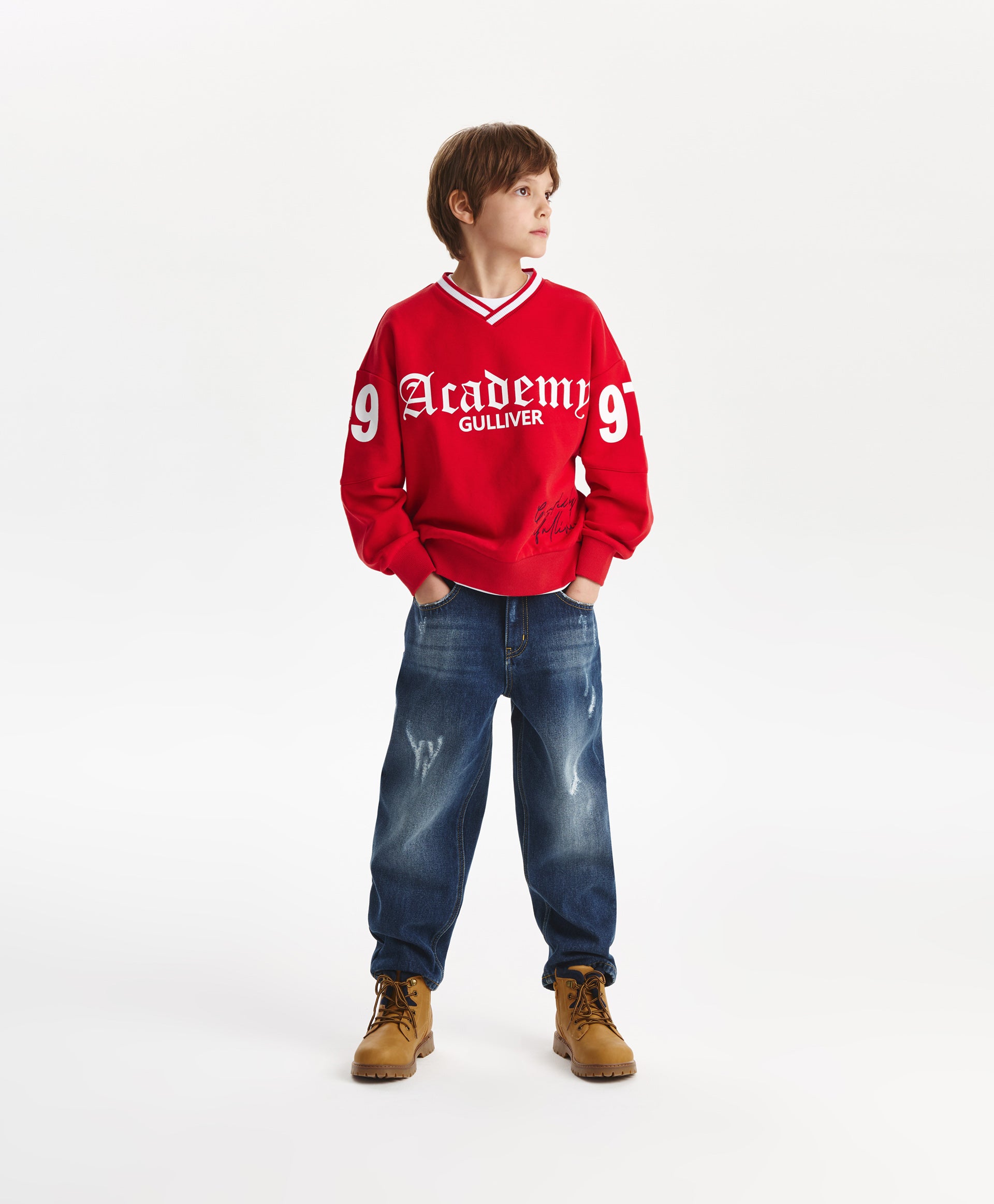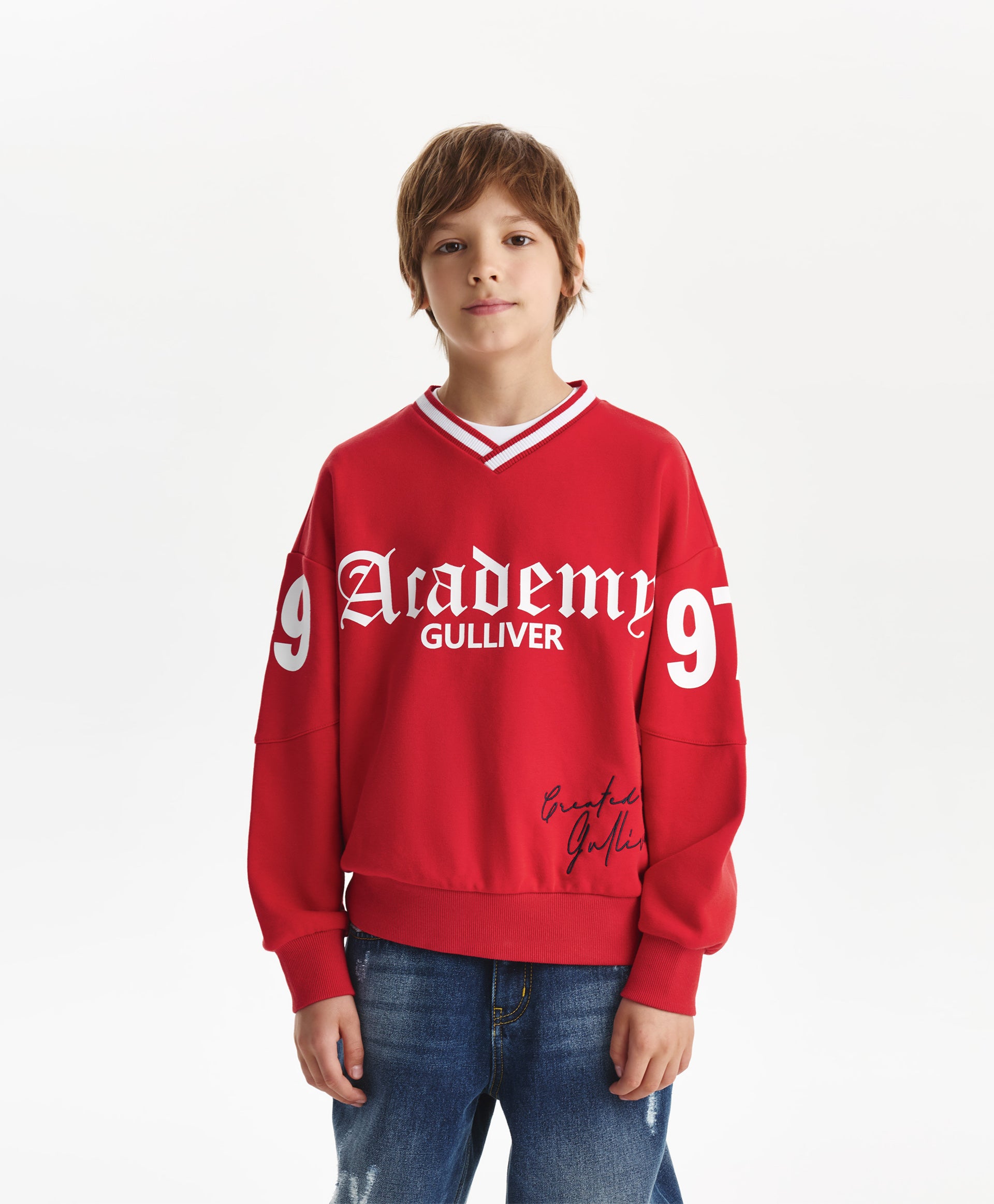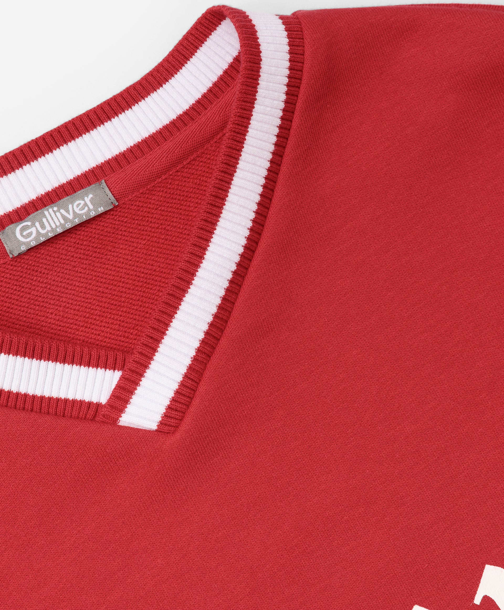 A vibrant red V-neck sweatshirt for boys from Gulliver, made from soft cotton blend fabric with a touch of elastane for comfort and stretch. Features a classic V-neckline, long sleeves, and ribbed cuffs and hem for a snug fit. Ideal for layering over shirts or wearing alone for school, casual outings, or outdoor activities. Durable fabric maintains shape, color, and softness after repeated washes. Perfect for spring, autumn, and mild winter days.