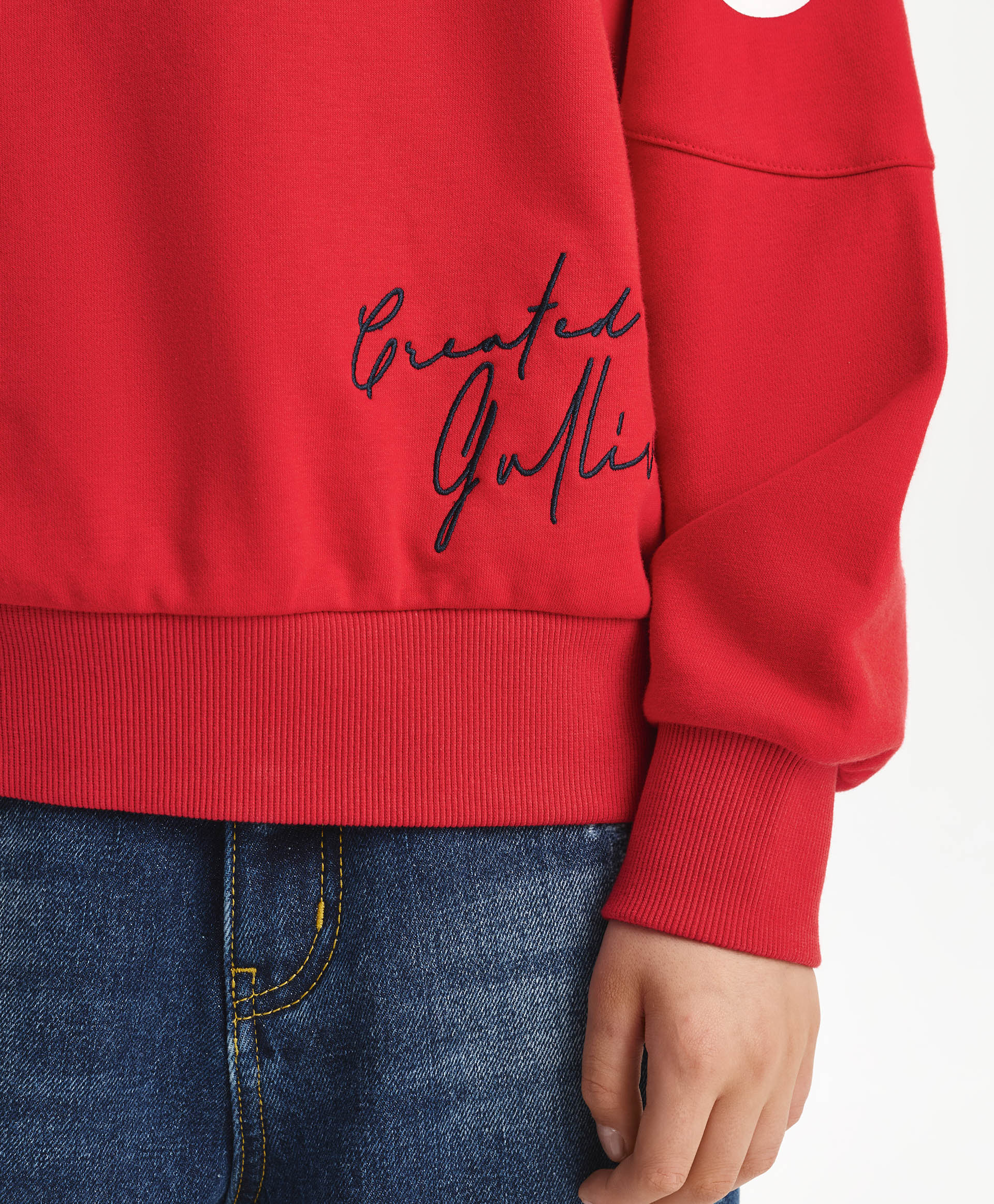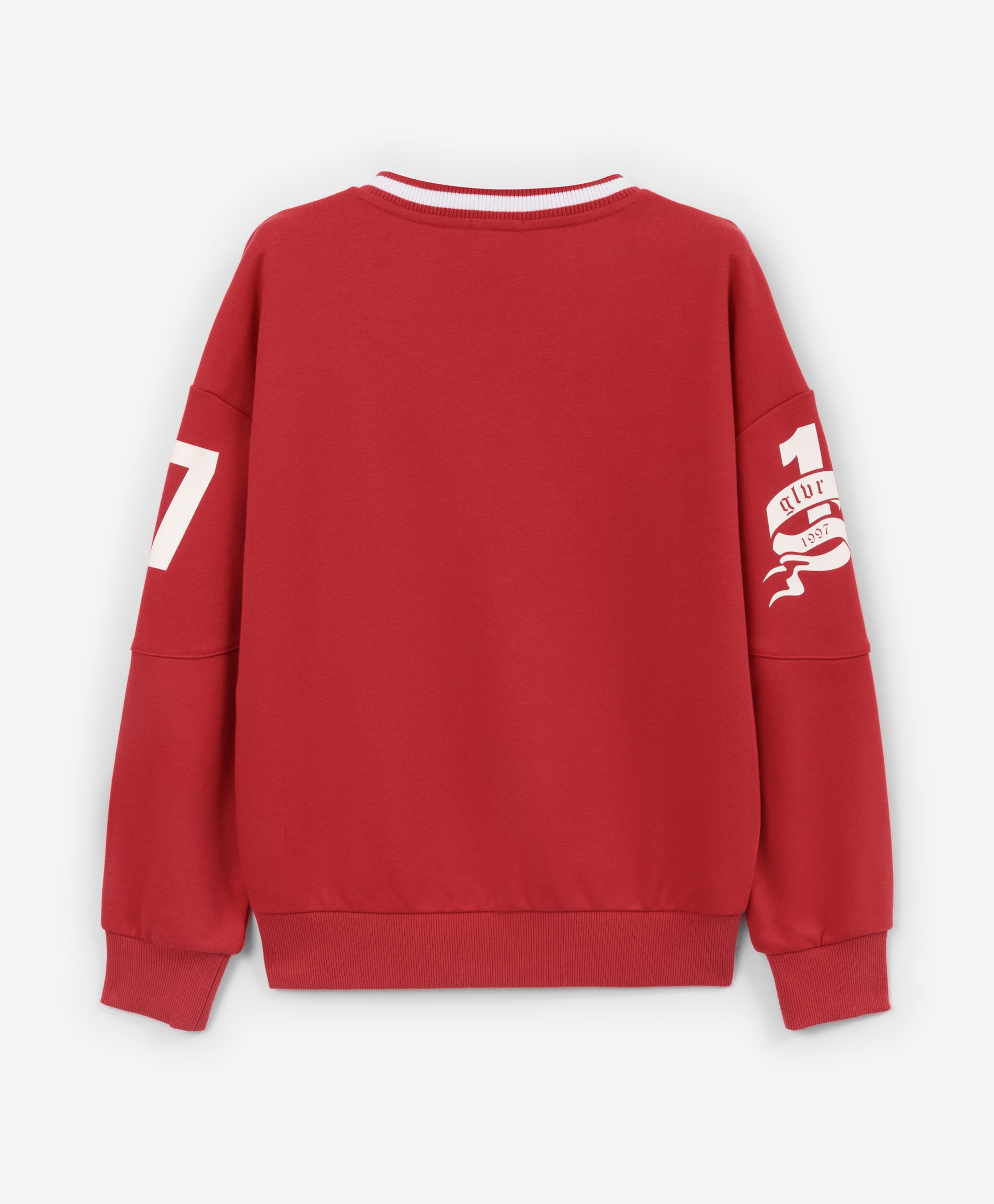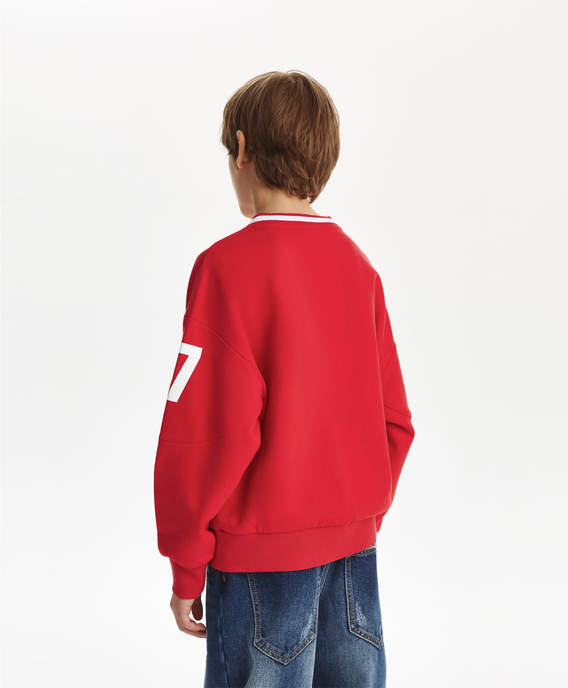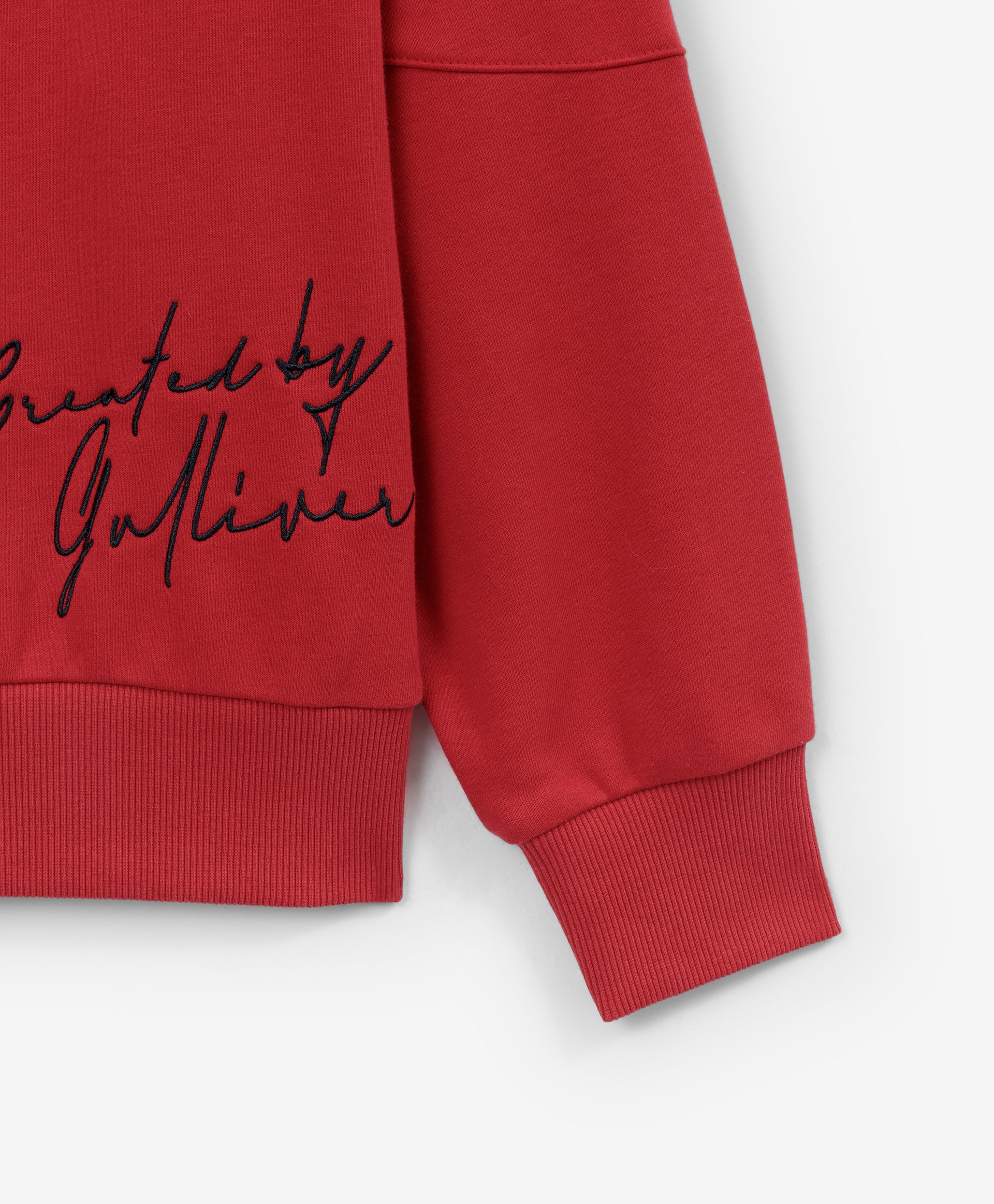 A vibrant red V-neck sweatshirt for boys from Gulliver, made from soft cotton blend fabric with a touch of elastane for comfort and stretch. Features a classic V-neckline, long sleeves, and ribbed cuffs and hem for a snug fit. Ideal for layering over shirts or wearing alone for school, casual outings, or outdoor activities. Durable fabric maintains shape, color, and softness after repeated washes. Perfect for spring, autumn, and mild winter days.